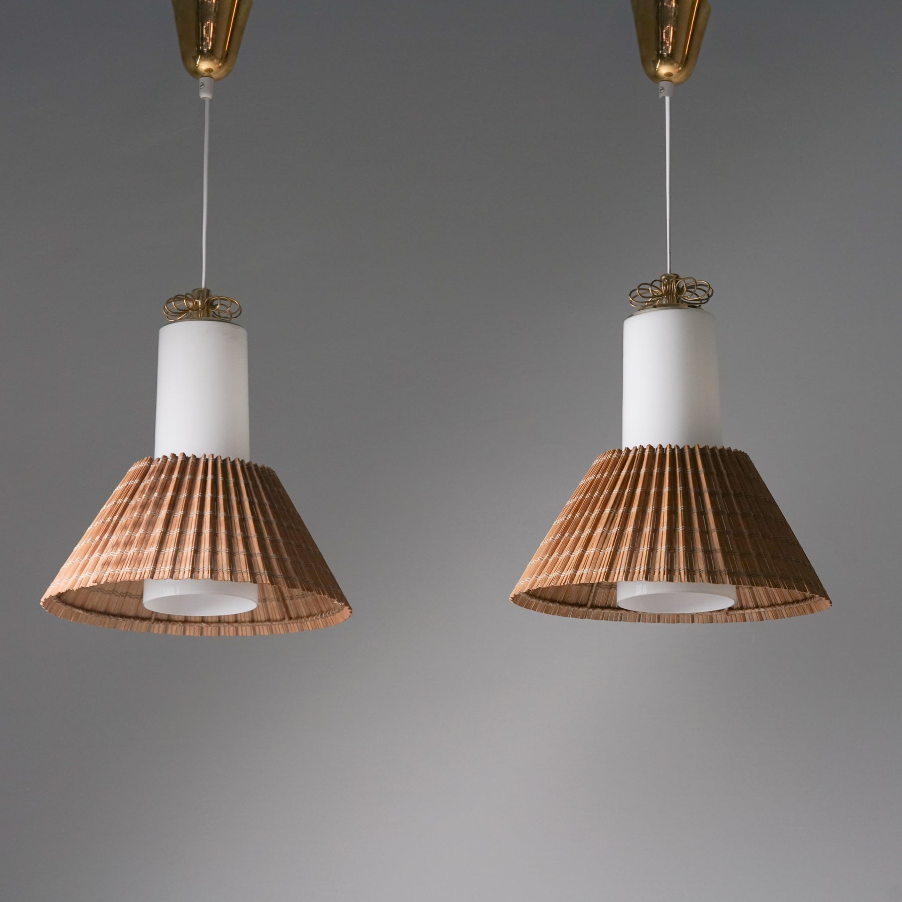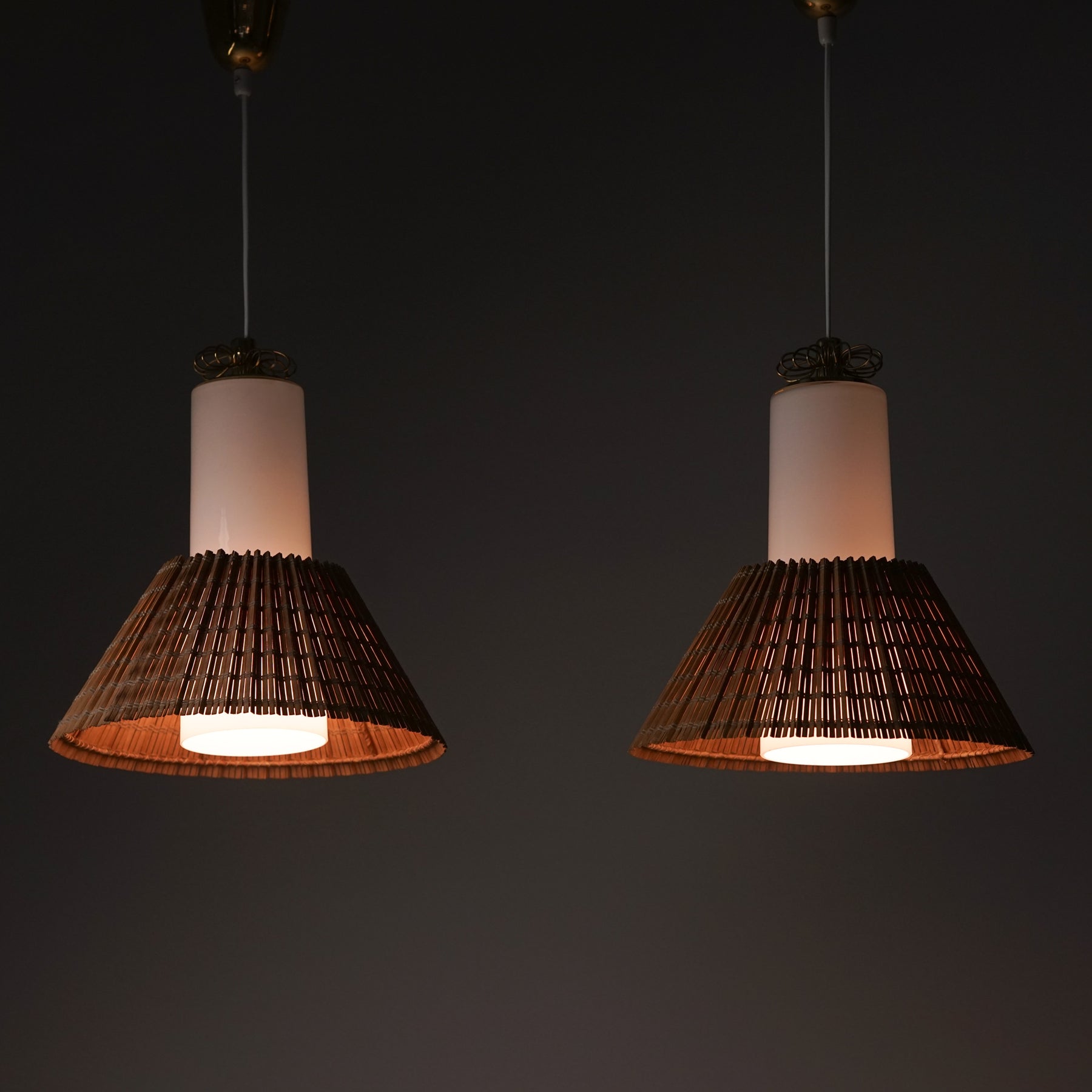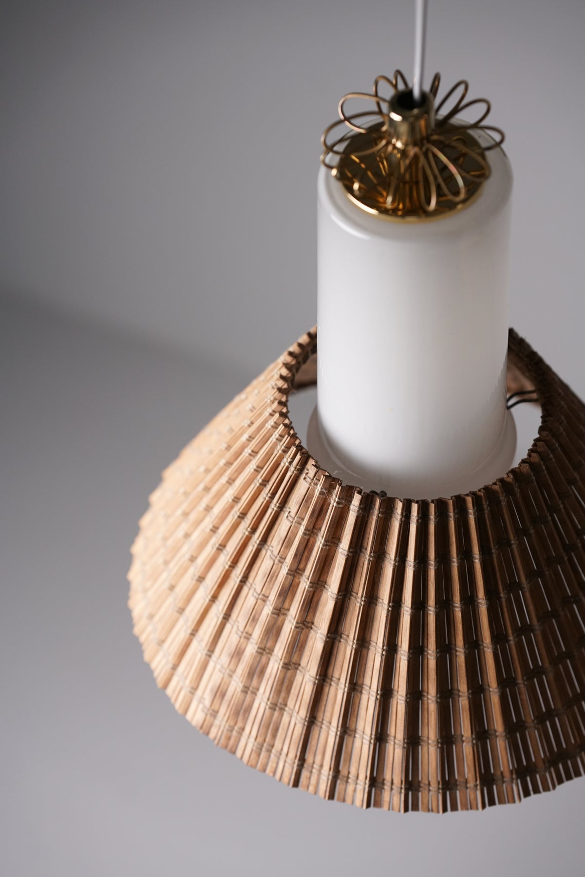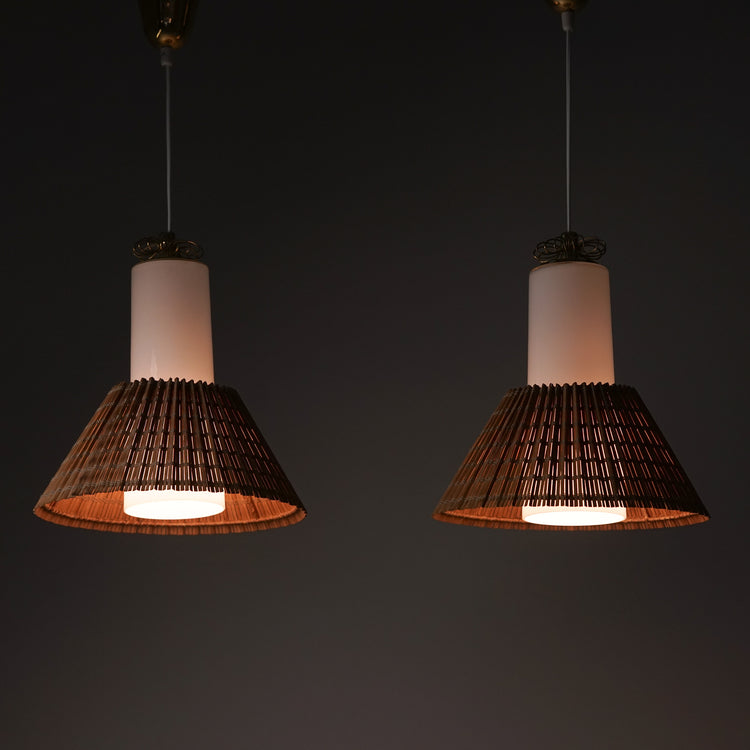 Malli K3-43 kattovalaisin (6 kpl myydään erikseen), design Paavo Tynell, valmistanut Idman, 50/60-luku. Messinkiä ja opaalilasia, puusäle varjostin. Leimattu. Säädettävä korkeus. Hyvä kunto, pientä ajan patinaa. Kattovalaisimet myydään erikseen. Ilmoitettu hinta on kappalehinta.