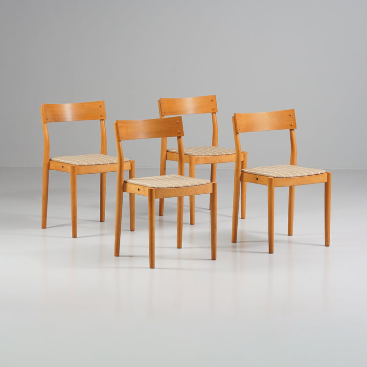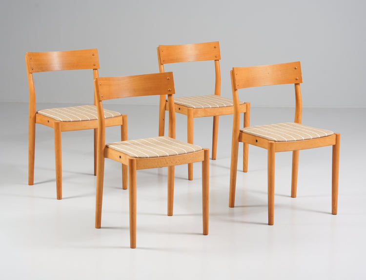 Tuolit (4 kpl myydään yhdessä), design Peter Hvidt & Orla Mølgaard-Nielsen, valmistanut Fritz Hansen, Tanska, 50-luku. Runko pyökkiä, villakangas istuimet. Hyvä kunto, pientä ajan patinaa. Tuolit myydään yhdessä settinä. Ilmoitettu hinta on settihinta.