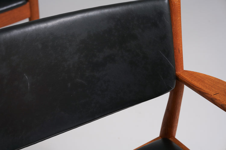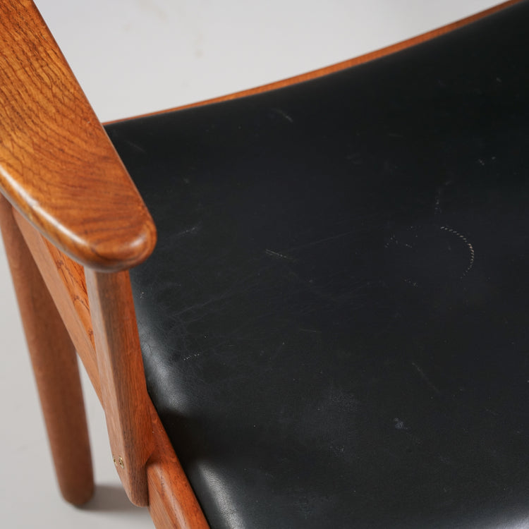Tuolit malli J62 (4 kpl myydään erikseen), design Poul Volther, valmistanut FDB Møbler, Tanska, 60-luku. Runko tiikkiä, musta nahkaistuin. Hyvä kunto, ajan patinaa.