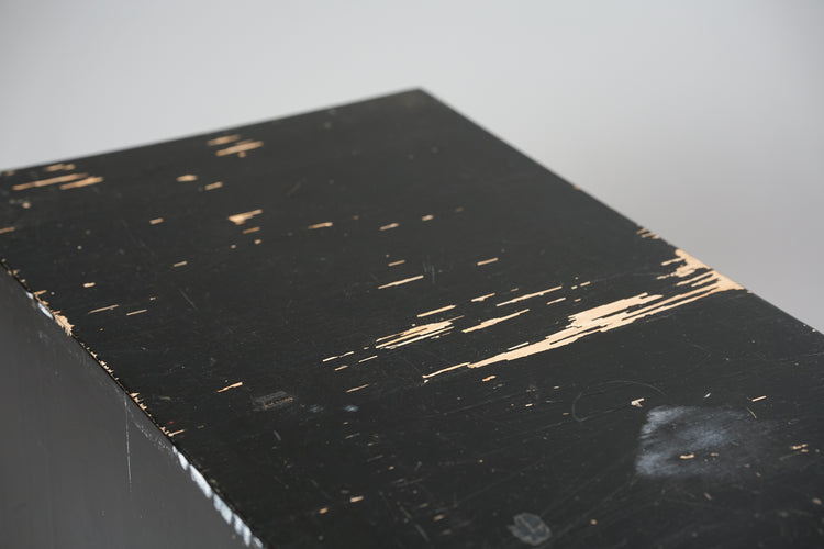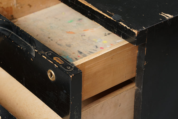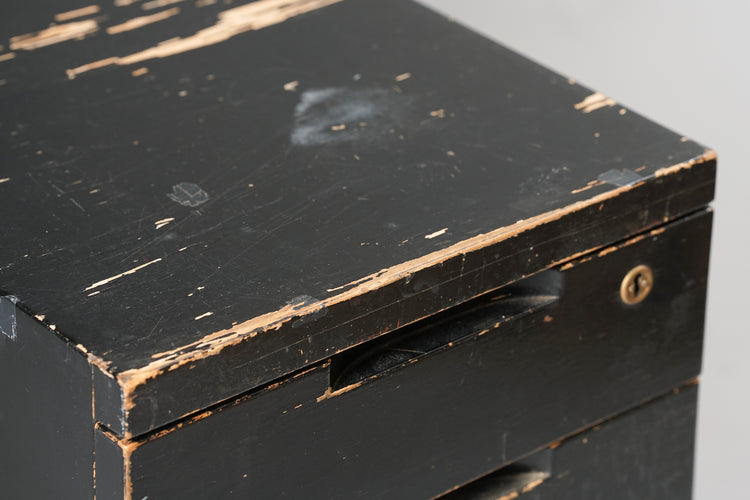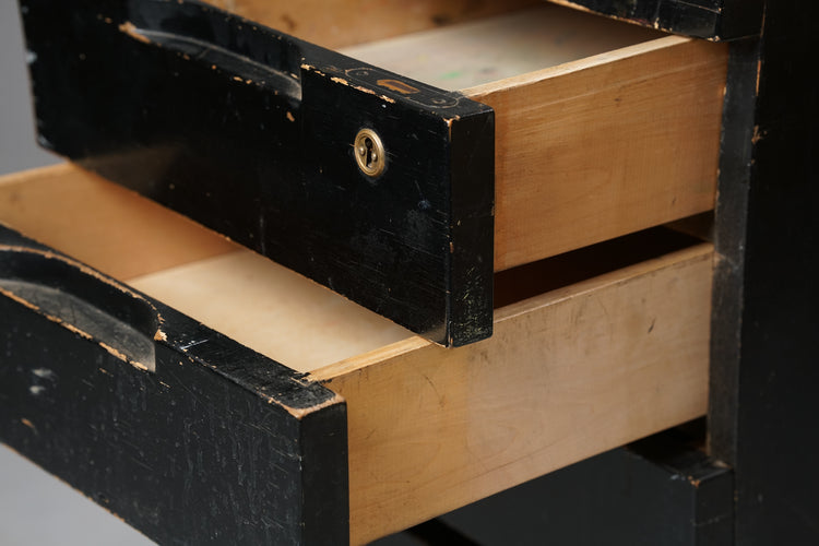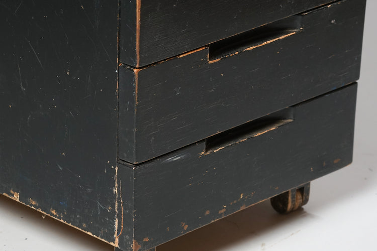 Musta puinen laatikosto, jossa viisi vetolaatikkoa. Laatikostossa on neljä pyörää ja ensimmäisessä laatikossa lukko. Kulunut käytöstä.