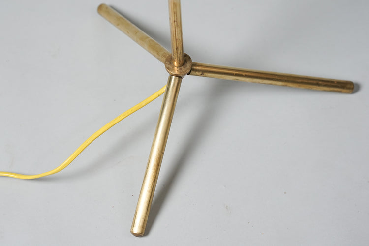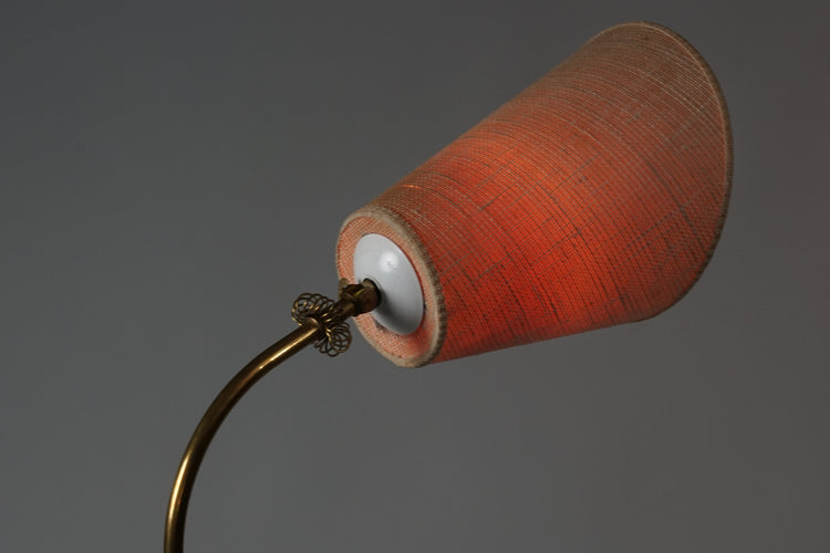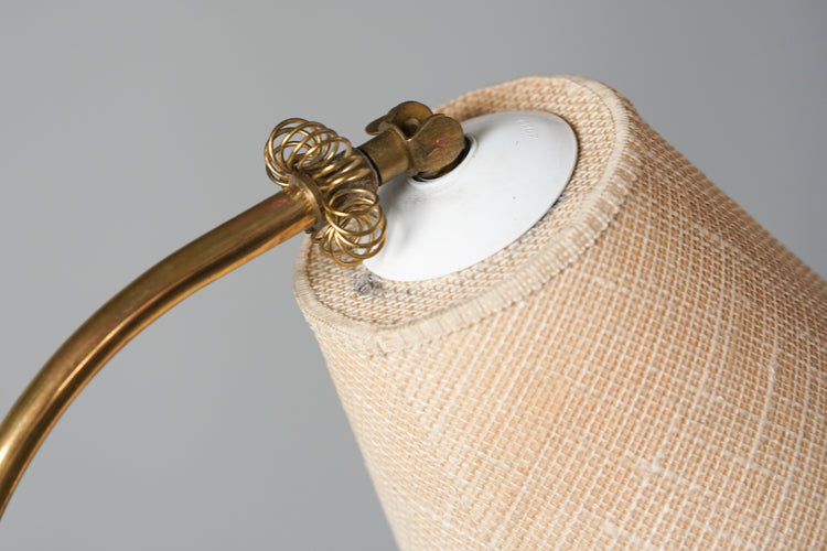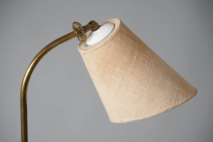 Messinki lattiavalaisin, valmistettu Suomessa, 50-luku. Kangasvarjostin. Varjostimen suunta säädeltävissä. Hyvä kunto, pientä ajan patinaa.