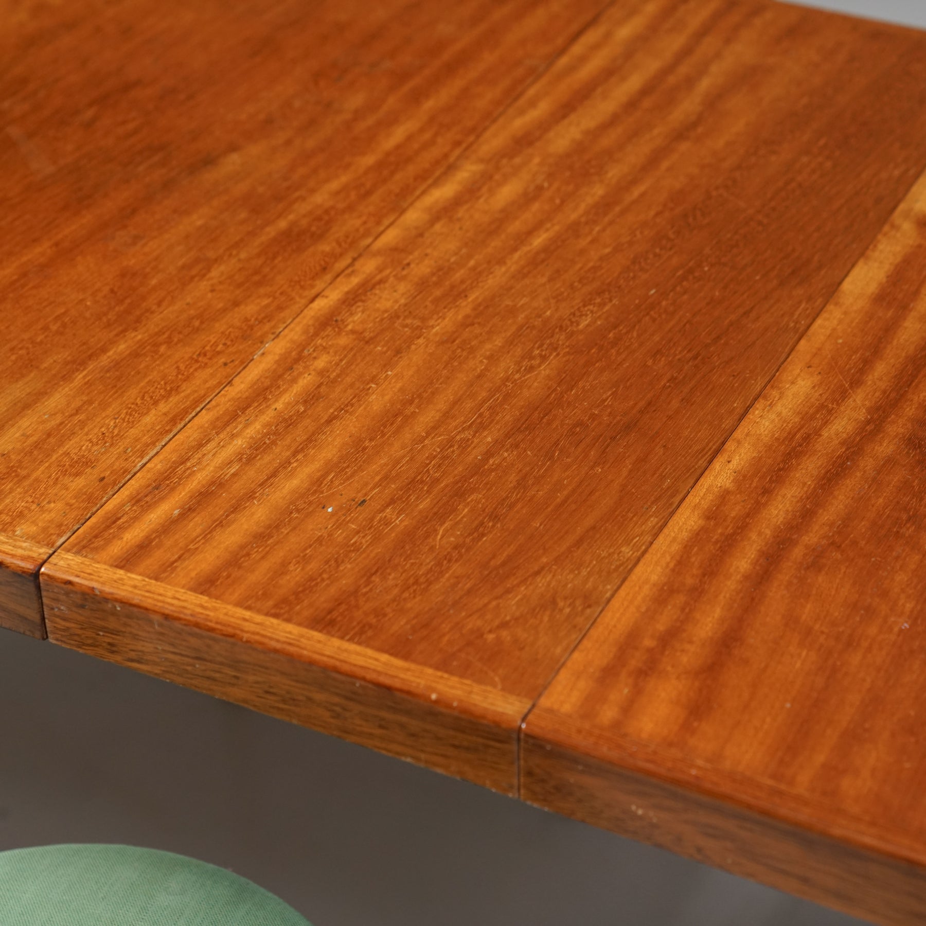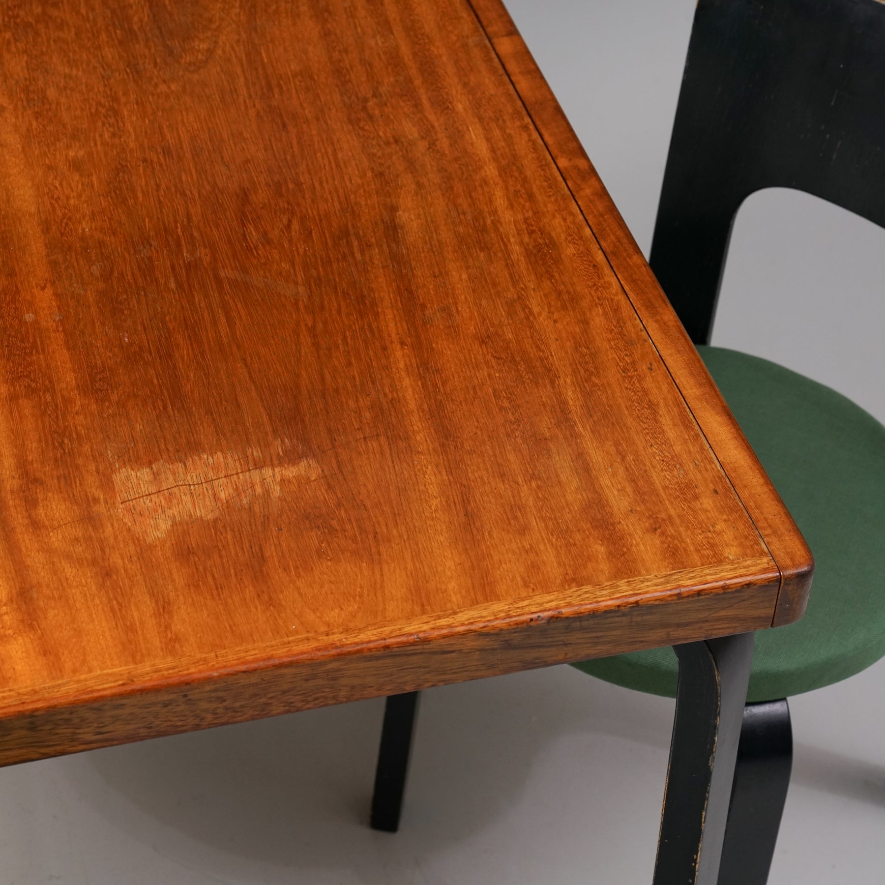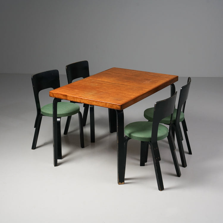Harvinainen ruokailuryhmä, sisältää 4 kpl malli 66 tuoleja design Alvar Aalto sekä harvinaisen jatkettavan ruokapöydän design Aino Aalto, 30-luku. Tuolit maalattua koivua, istuinosa kangasta. Pöytä mahonkia ja tiikkiä. Täysin alkuperäinen kunto, runsasta ajan patinaa. Ruokailuryhmä myydään yhdessä. Ilmoitettu hinta on settihinta.