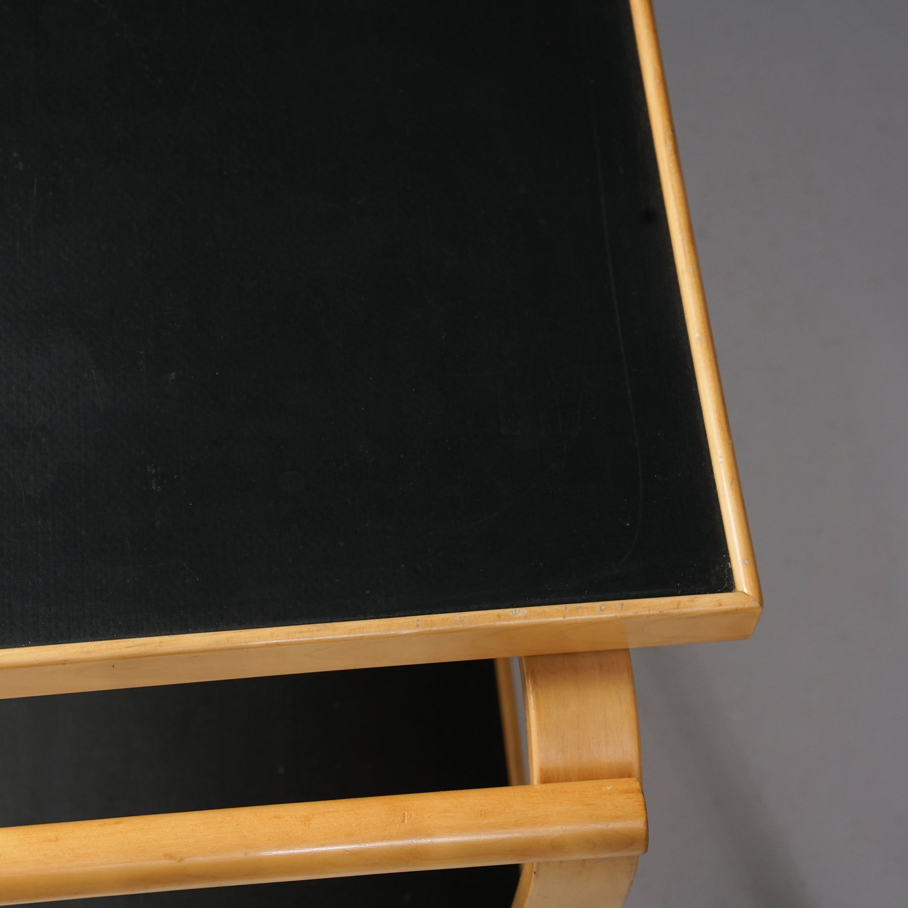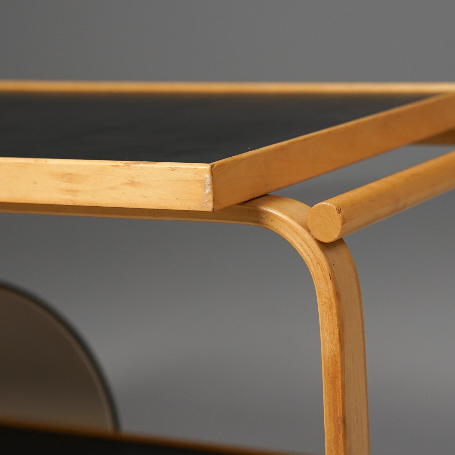 Malli 901 tarjoiluvaunu, design Alvar Aalto, valmistanut Artek, 1900-luvun puoliväli. Koivurunko, musta linoleum pöytätaso. Hyvä kunto, ajan patinaa.