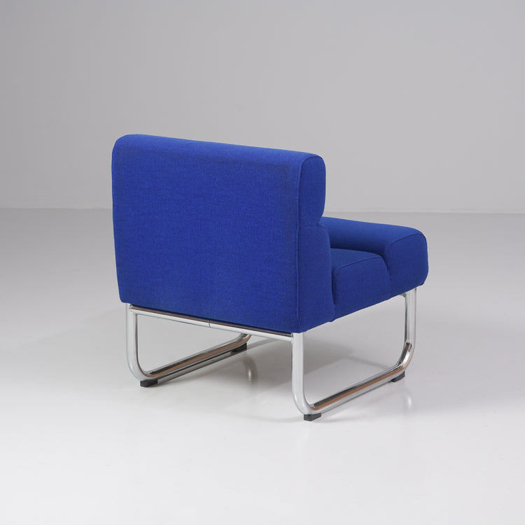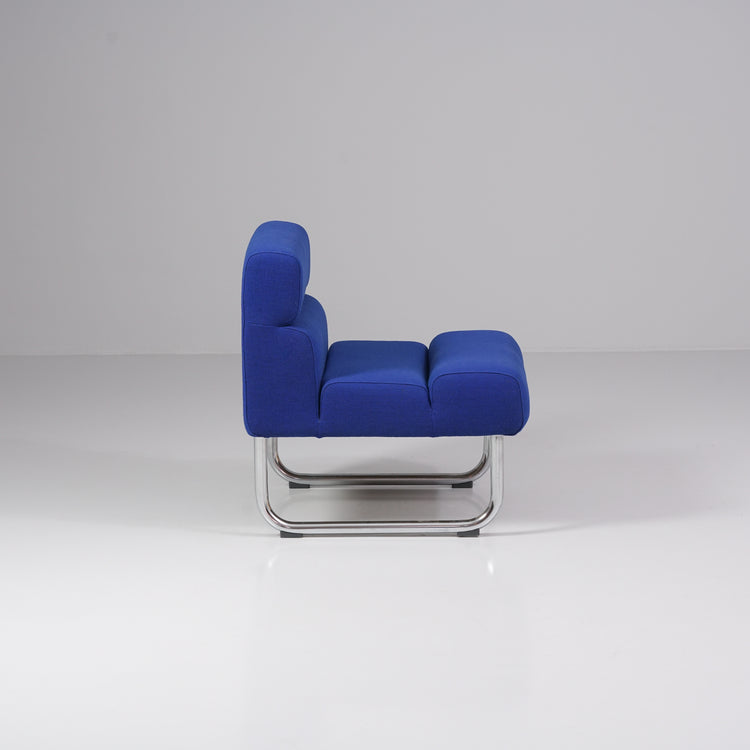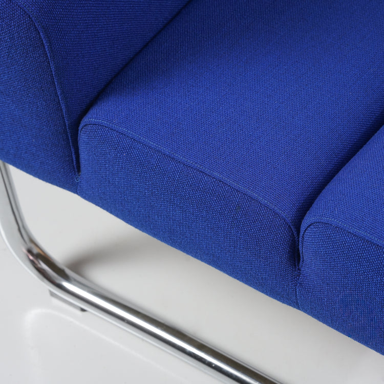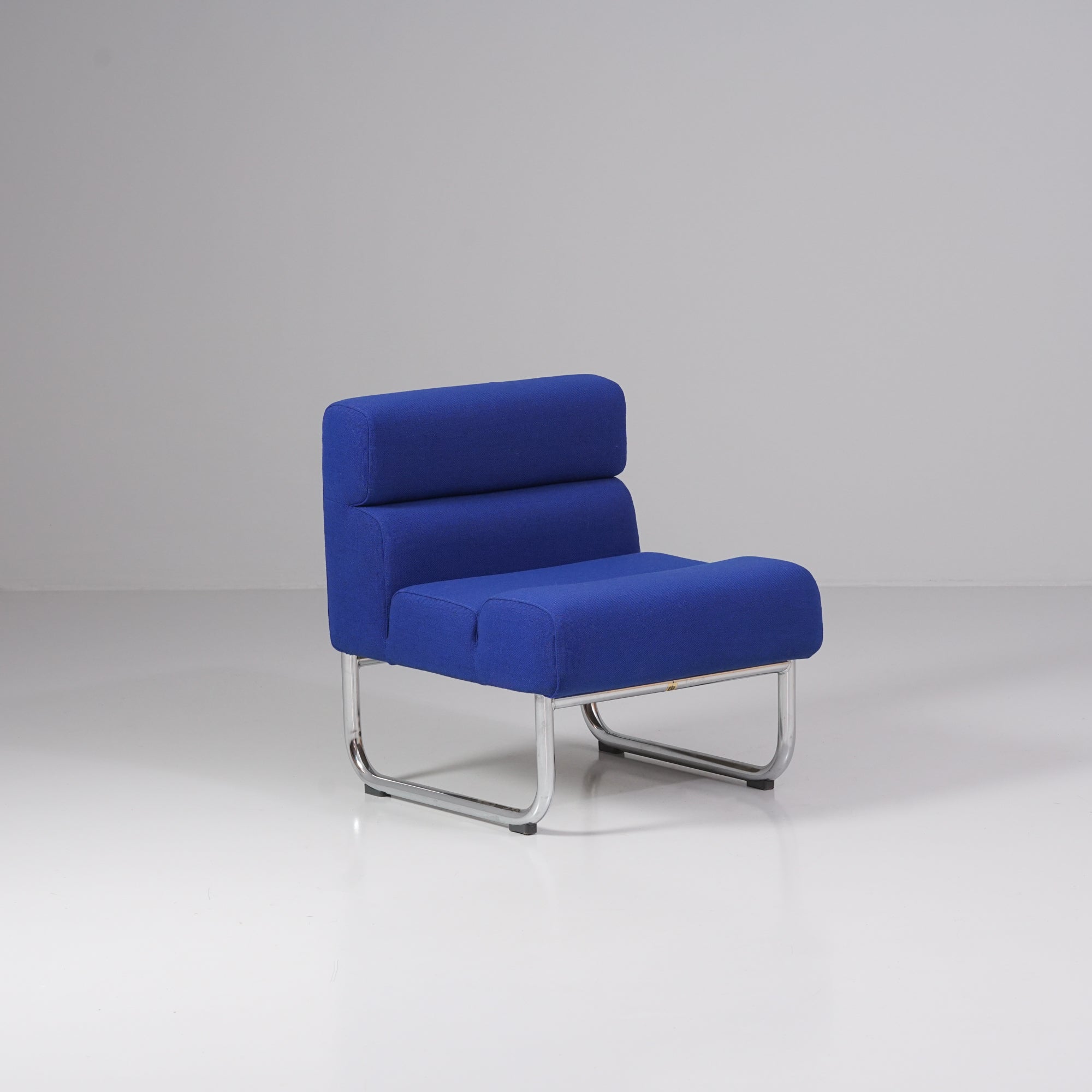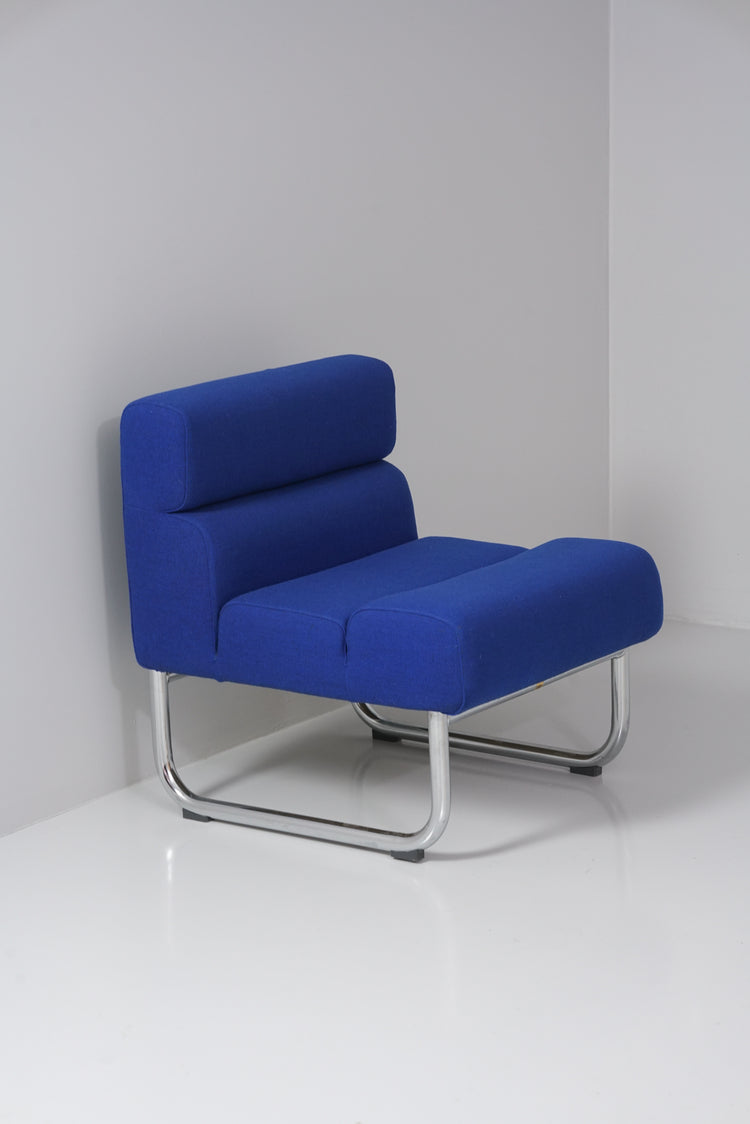 Nojatuoli malli "Funkis" (2 kpl myydään erikseen), design Raimo Räsänen, valmistanut Isku, 70-luku. Kromijalat, sininen kangasverhoilu. Leimattu. Hyvä kunto, pientä ajan patinaa. Nojatuolit myydään erikseen. Ilmoitettu hinta on kappalehinta.