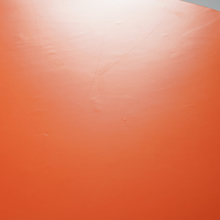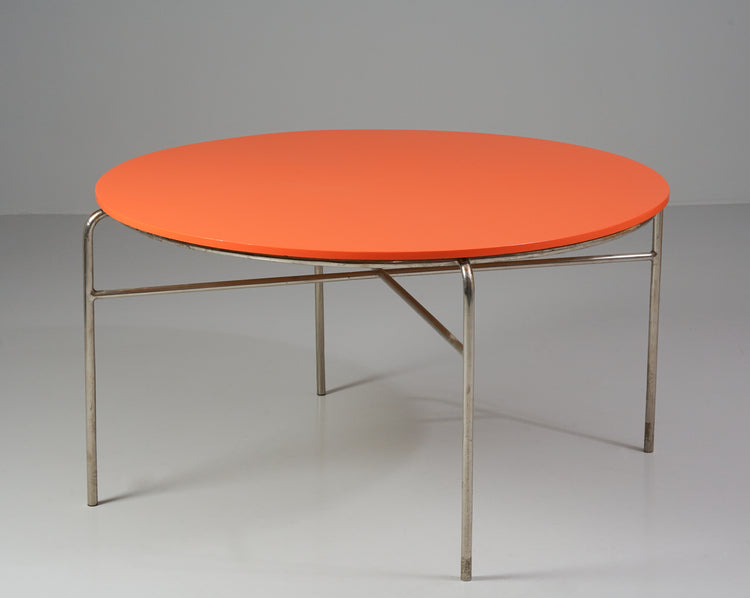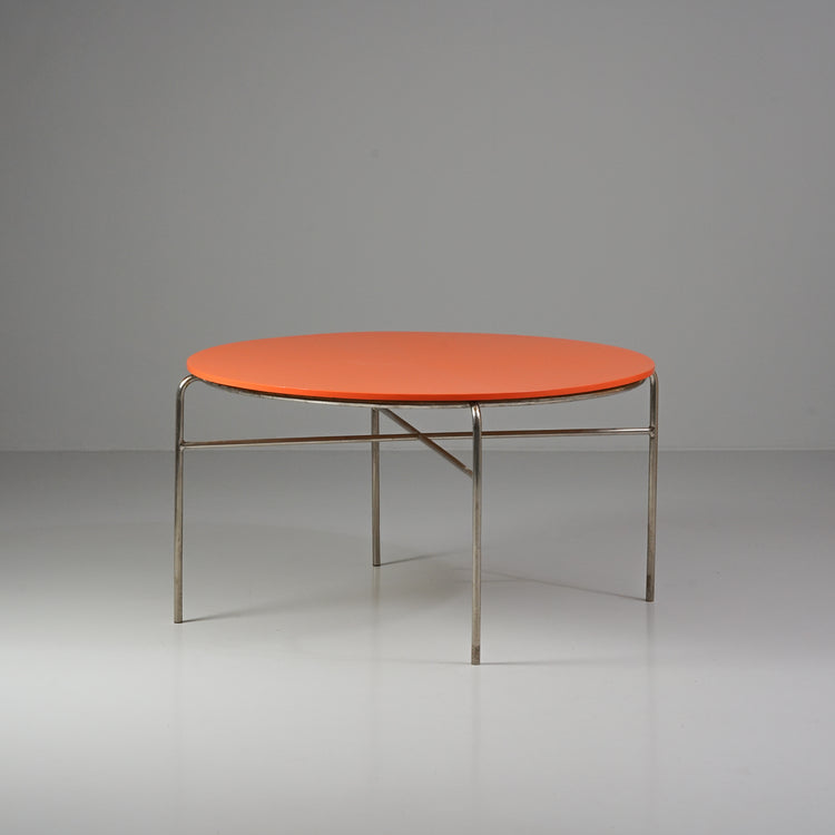 Pyöreä ruokapöytä, 1900-luvun puoliväli, Kromattu metallirunko, myöhemmin maalattu oranssi kansi. Hyvä kunto, runsasta ajan patinaa ja jälkeä.