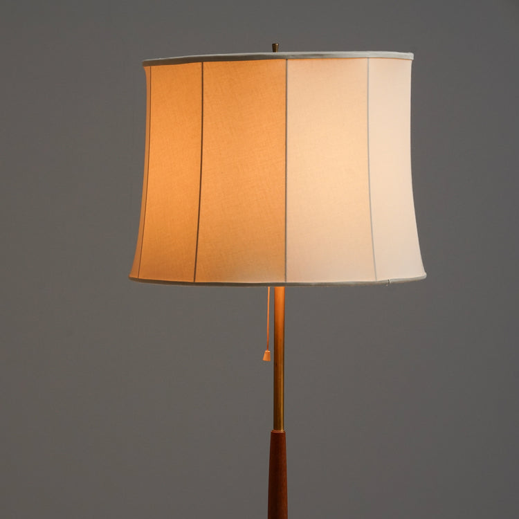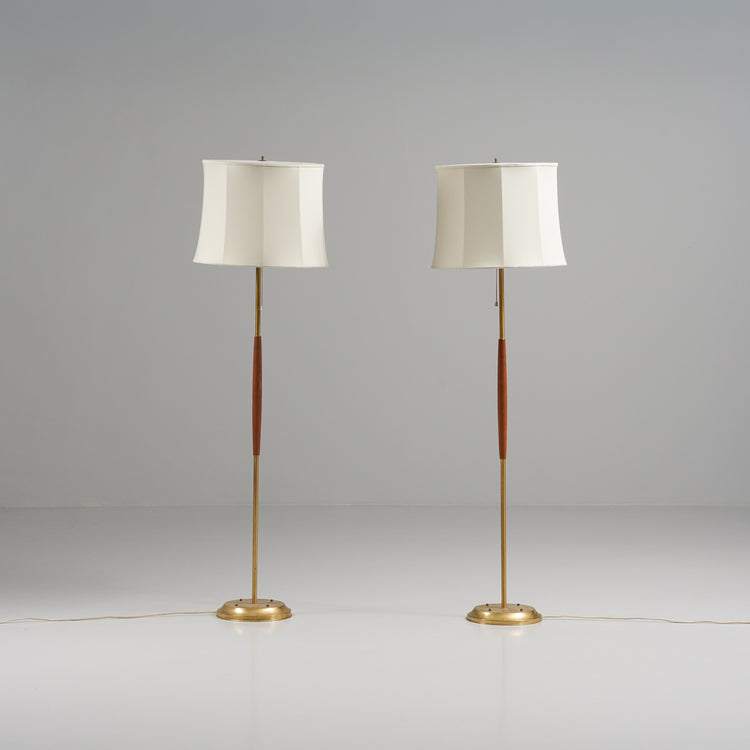 Lattiavalaisin pari (2 kpl myydään erikseen), valmistanut Venhola Oy, 60-luku. Runko messinkiä, tiikki yksityiskohdat, alkuperäiset kangasvarjostimet. Hyvä kunto, pientä ajan patinaa. Lattiavalaisimet myydään yhdessä. Ilmoitettu hinta on yhteishinta.