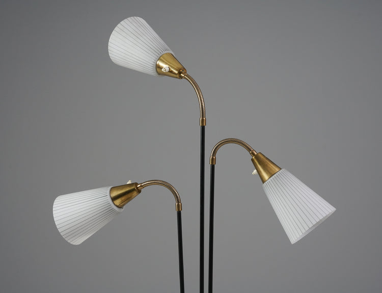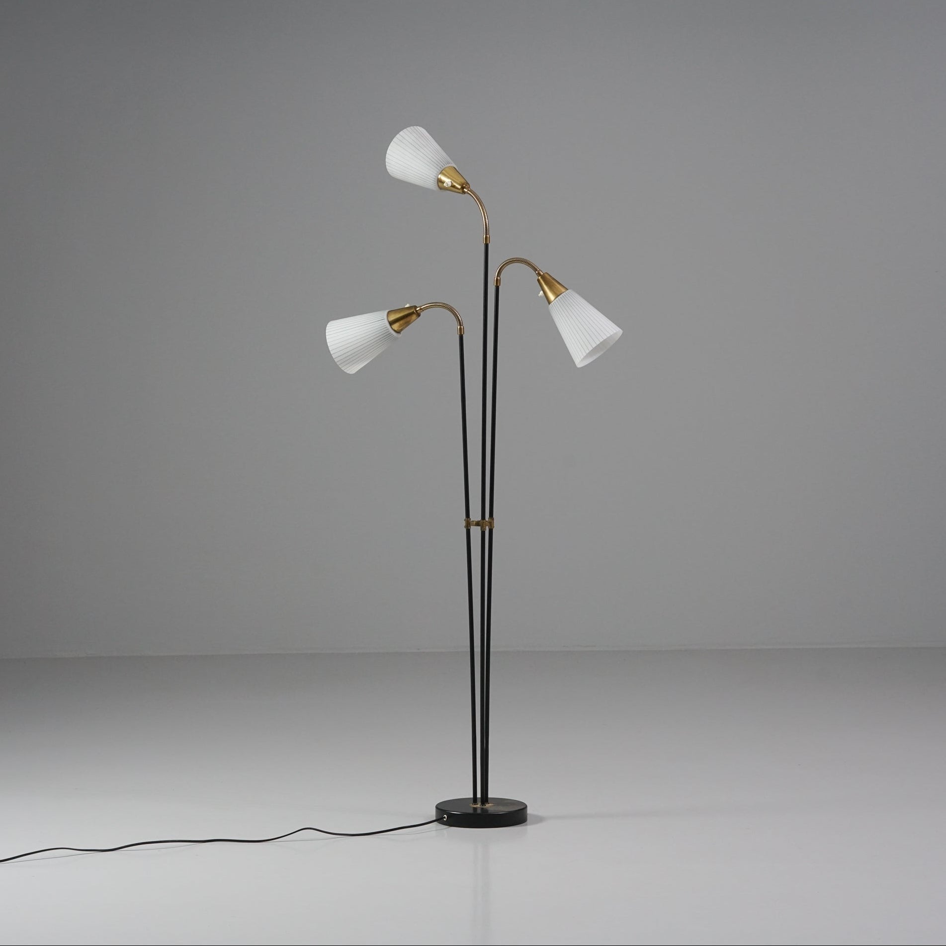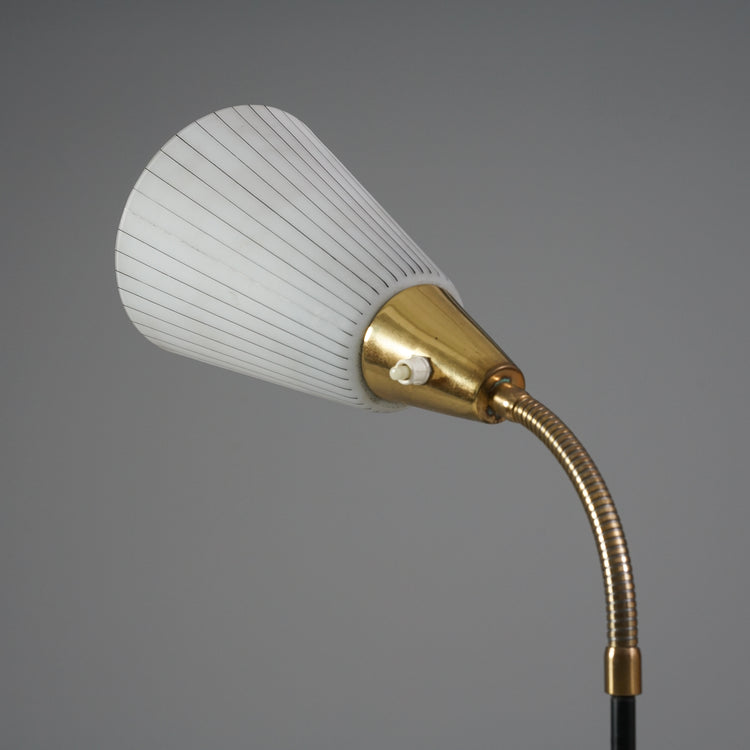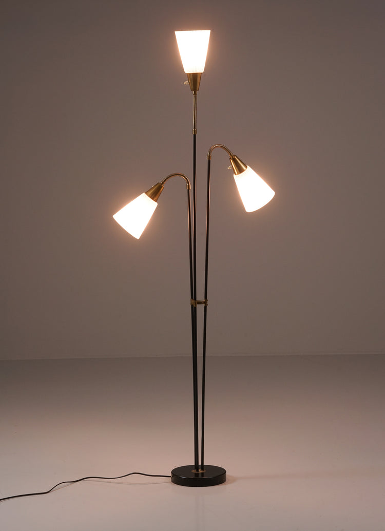Lattiavalaisin, valmistettu Suomessa, 50-luku. Runko maalattua metallia sekä messinkiä, lasikuvut. Kupujen suuntaa mahdollista säädellä. Hyvä kunto, ajan patinaa.