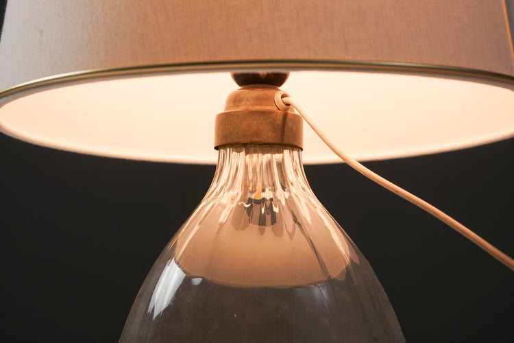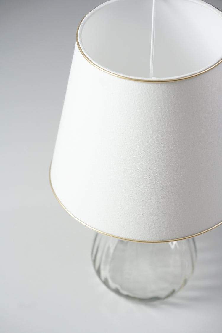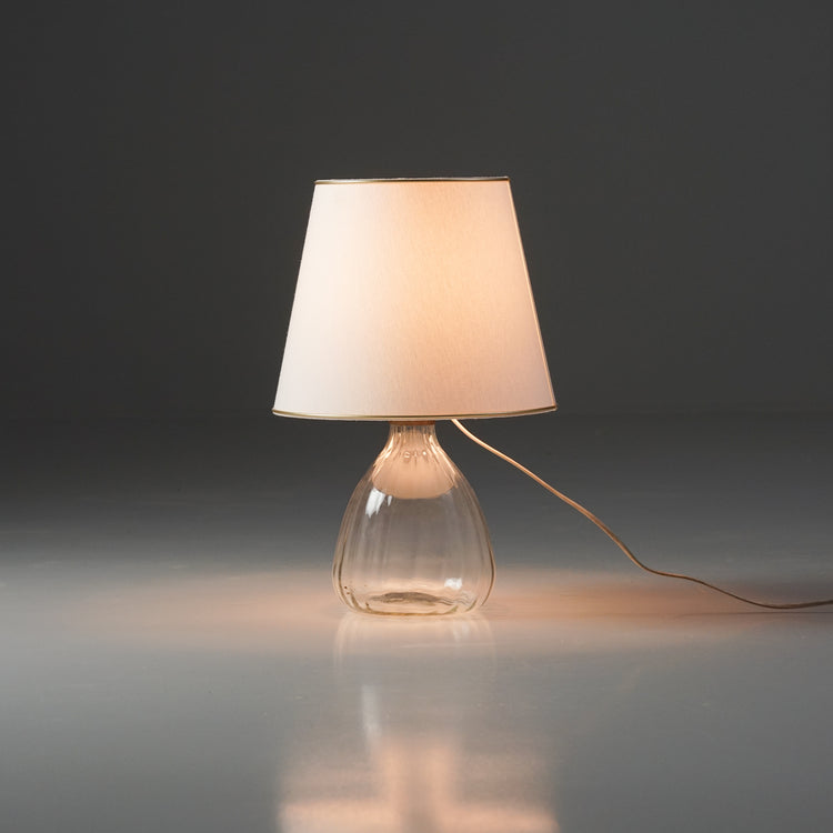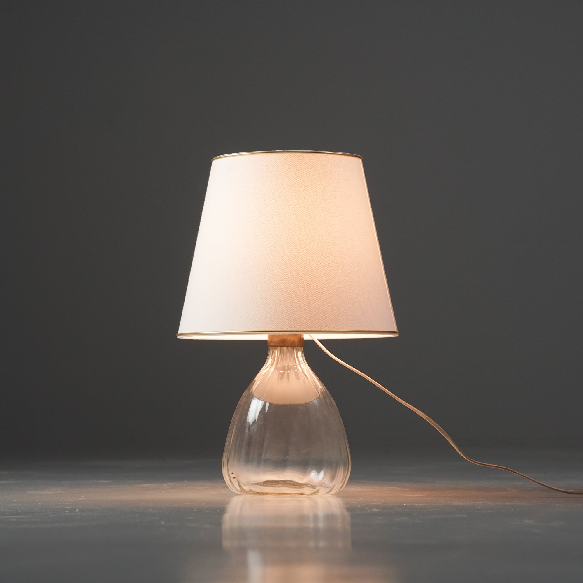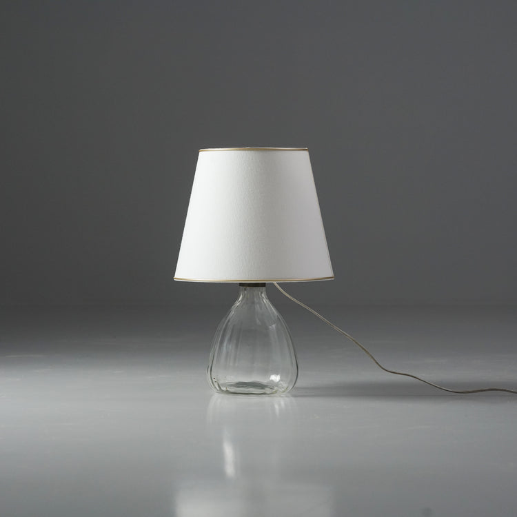 Harvinainen pöytävalaisin, design Gunnel Nyman, 40-luku. Lasirunko, uusittu kangasvarjostin. Hyvä kunto, pientä ajan patinaa.