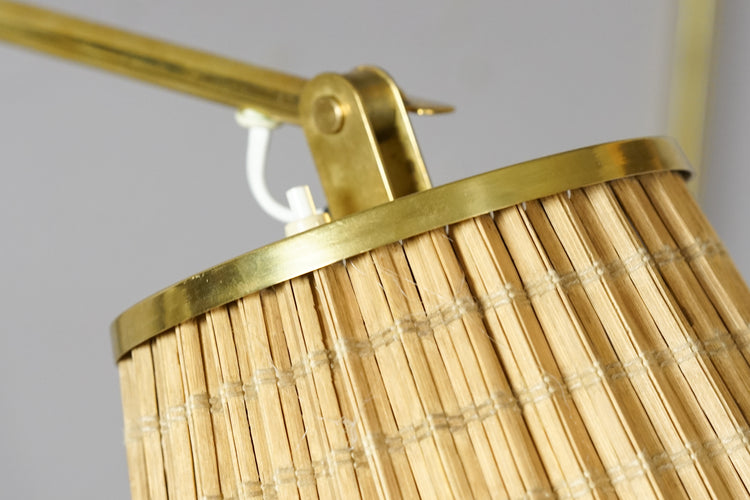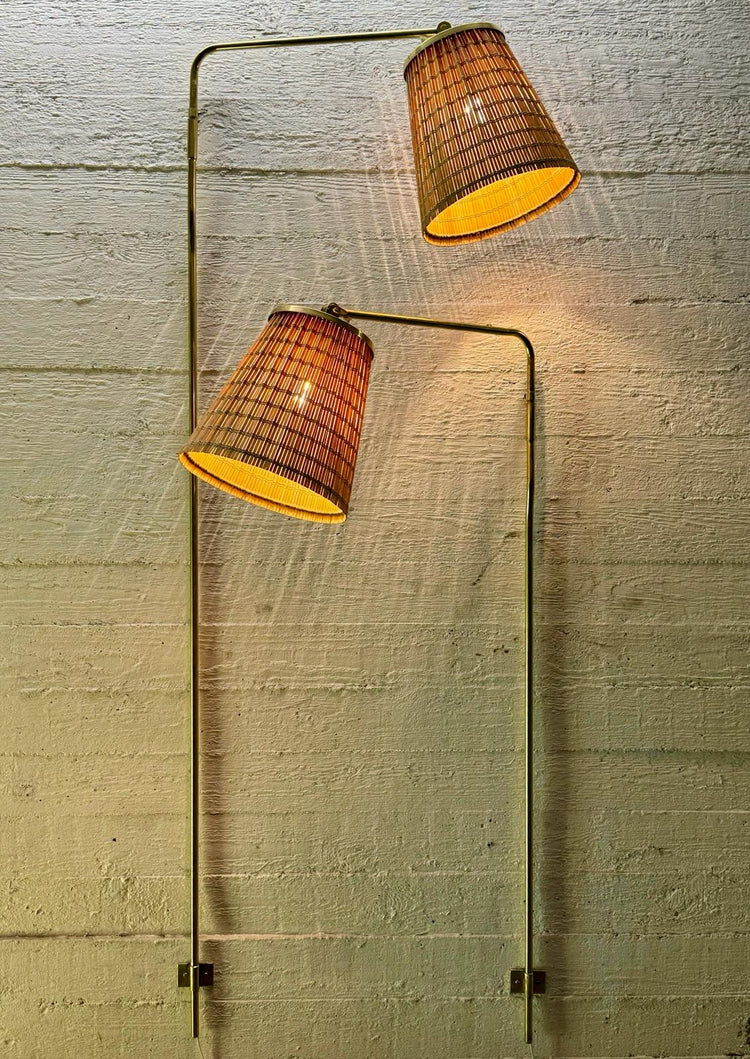 Harvinaiset tilaustyönä tehdyt seinävalaisimet, design Paavo Tynell, valmistanut Taito Oy, 40-luku. Messinkirunko, puusäle varjostin. Kaksi eri korkeutta. Varjostimen suunta vaihdettavissa. Valaisimen runkoa voi käännellä.
