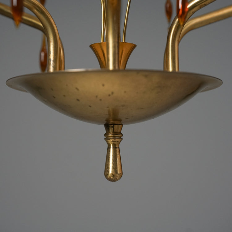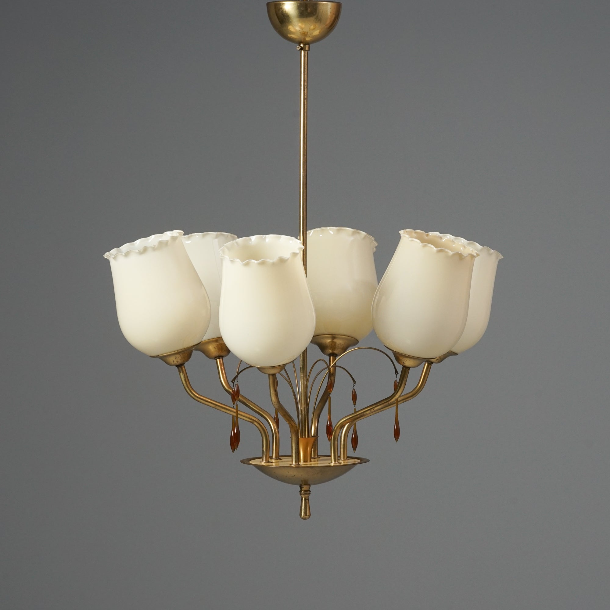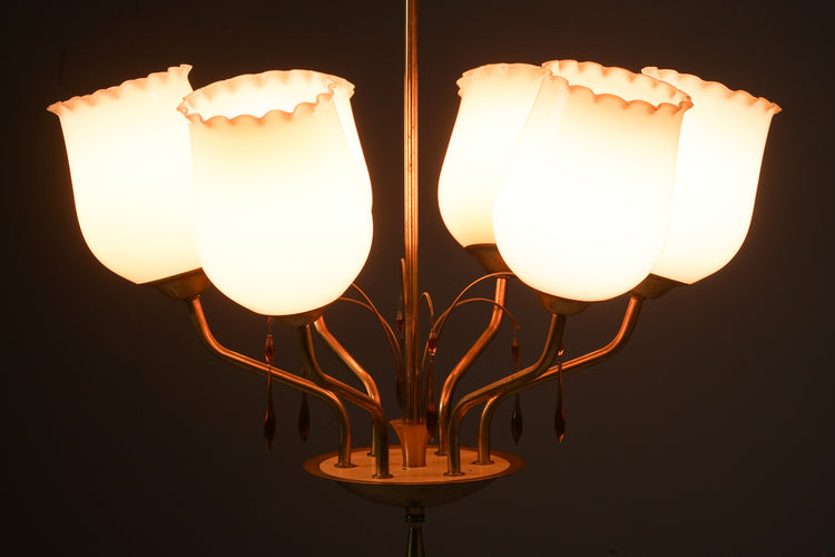 Kattokruunu, valmistanut Itsu, 50-luku. Runko messinkiä, kristalli yksityiskohdat, opaali lasikuvut. Leimattu. Hyvä kunto, pientä ajan patinaa.