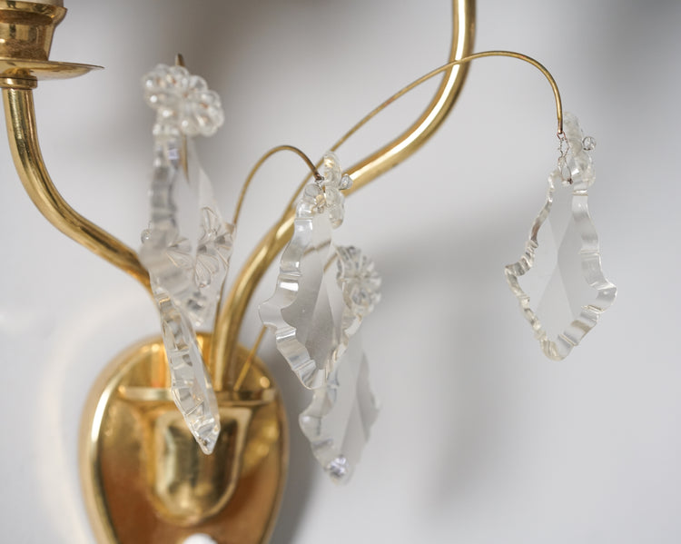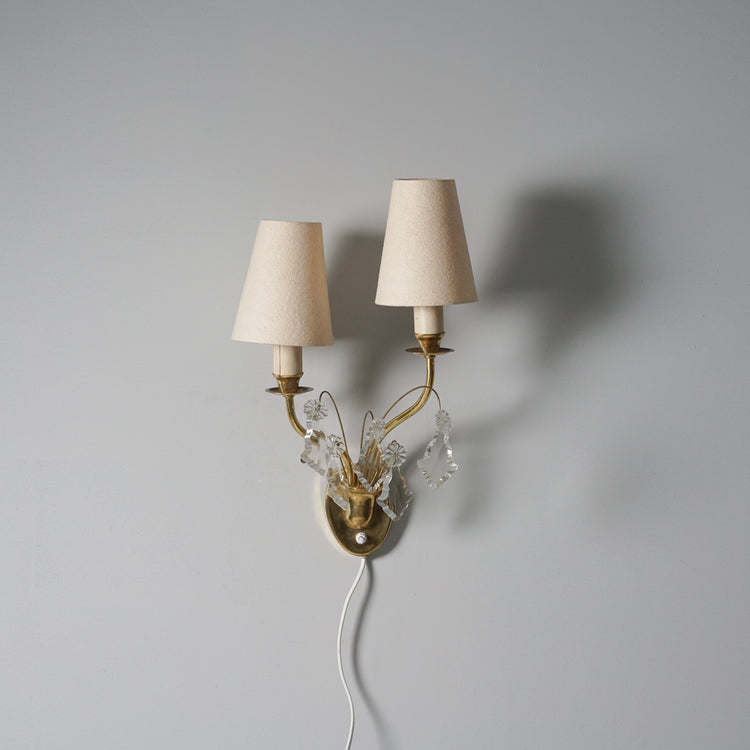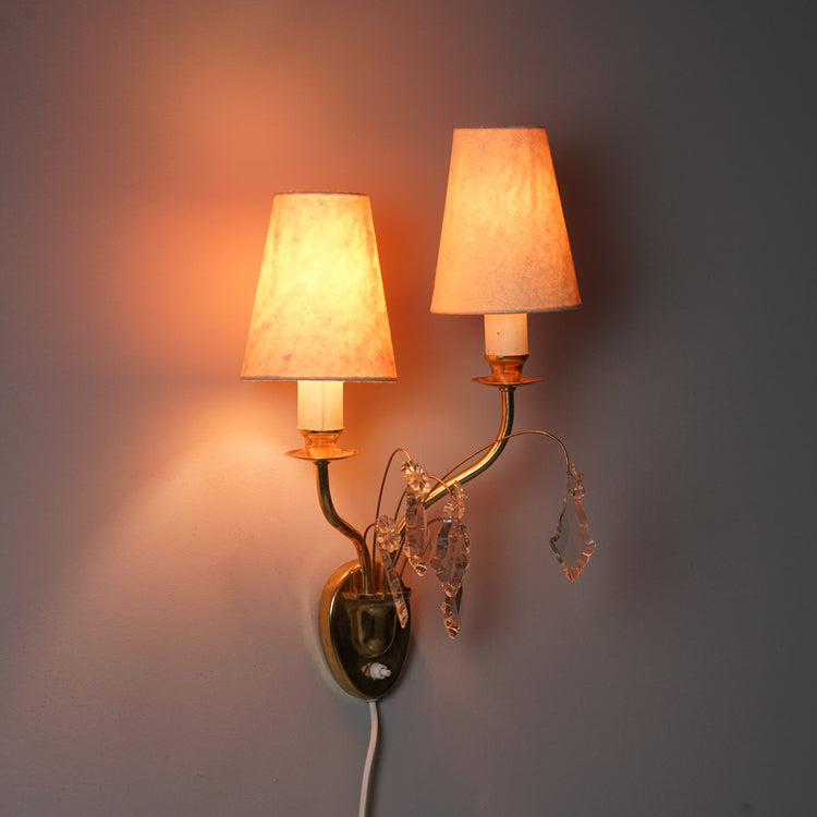 Kristalli seinävalaisin, valmistanut Valinte, 50-luku. Messinki runko, paperivarjostimet, kristalli yksityiskohdat. Leimattu. Hyvä kunto, ajan patinaa.