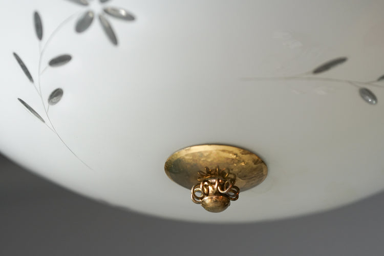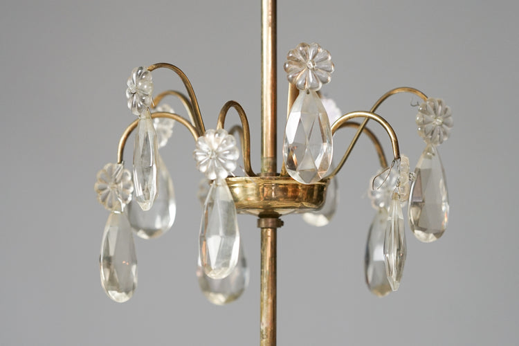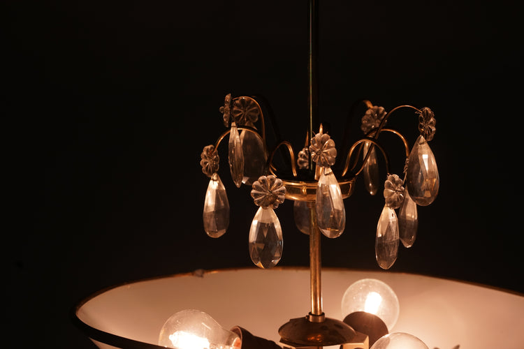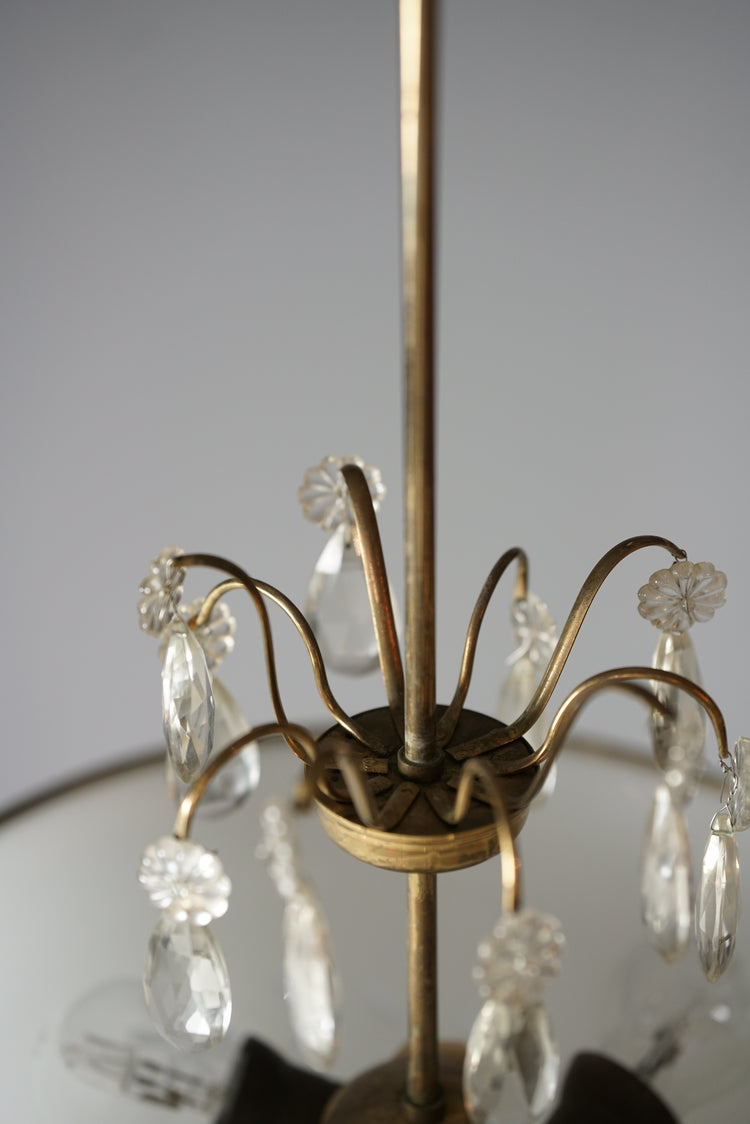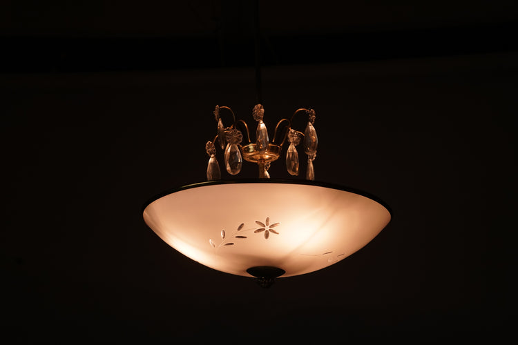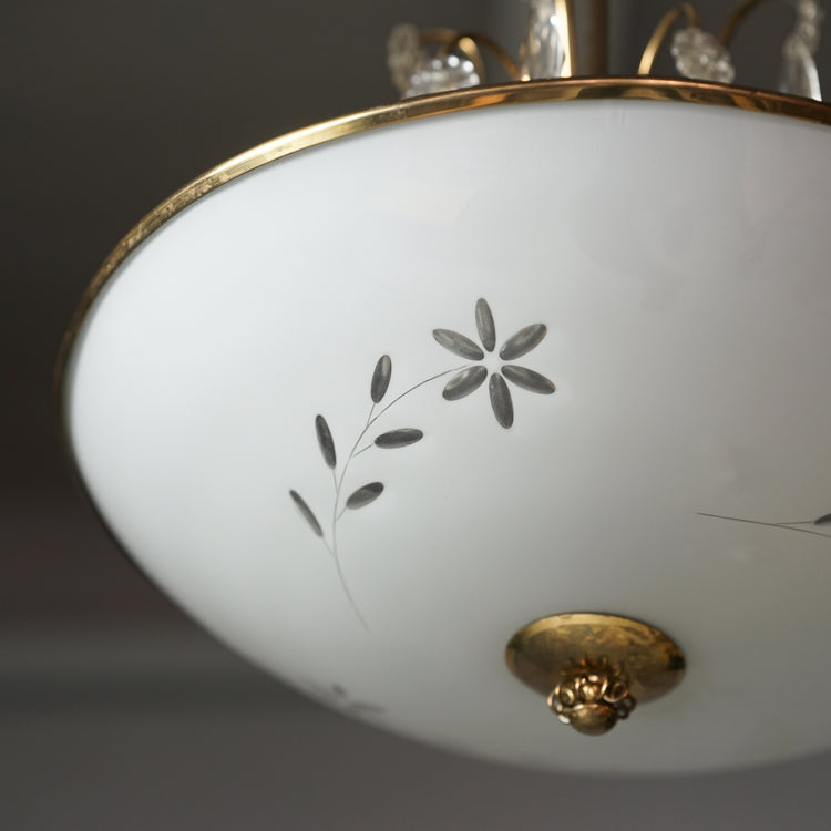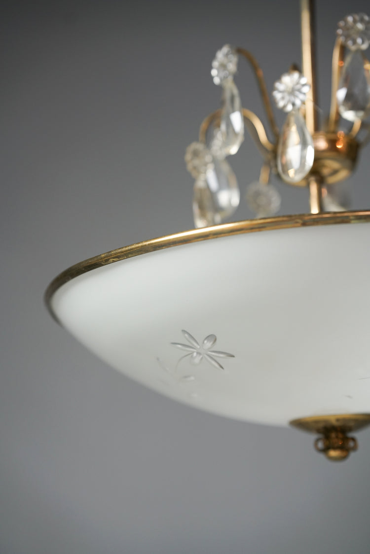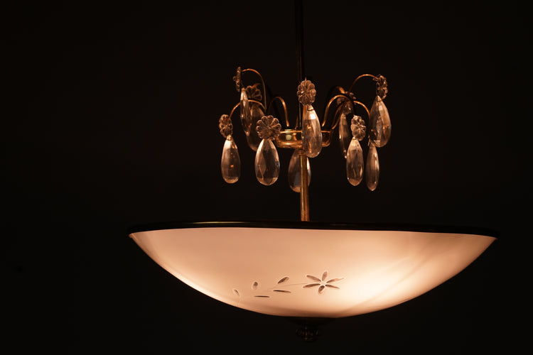 Kristallikruunu, valmistanut Valinte Oy, 40-luku, himmennetty kuviolasi, kristalli yksityiskohdat, messinkirunko. Hyvä kunto, pientä ajan patinaa.