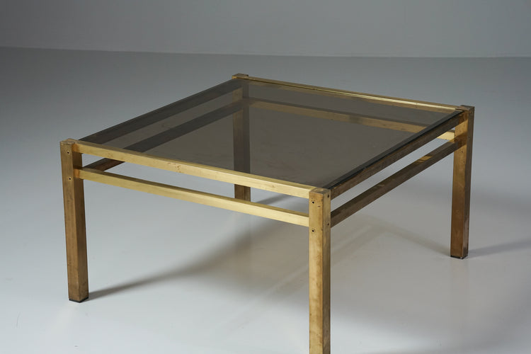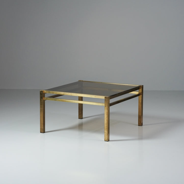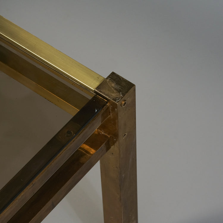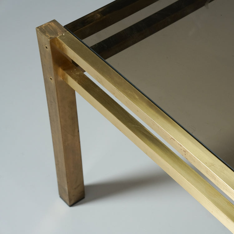 Lasipöytä, 70-luku. Messinkirunko. Tumma lasikansi. Hyvä kunto, runsasta ajan patinaa.