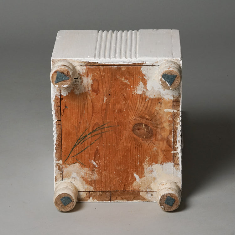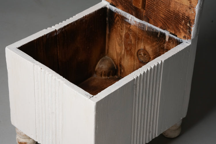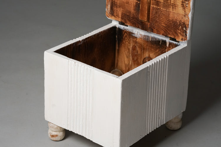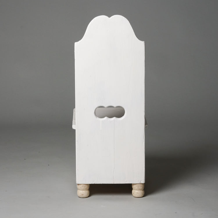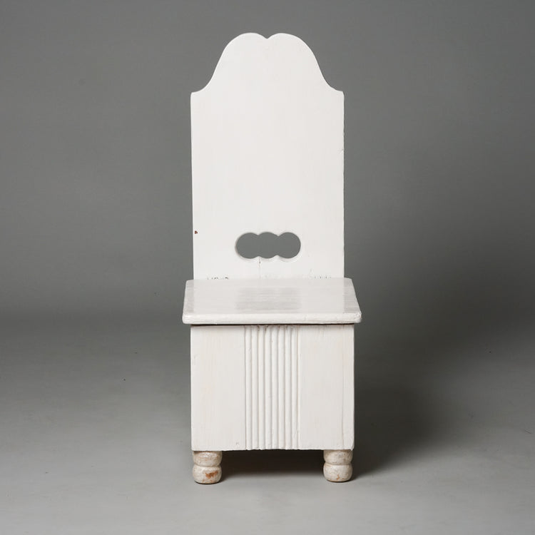 Upea lasten tuoli, design Eliel Saarinen, 1900-luvun alku. Maalattua puuta, istuinosan saa auki, sisällä säilytystilaa. Suunniteltu Munkkiniemen pensionaattiin. Hyvä kunto, ajan patinaa ja pientä jälkeä.