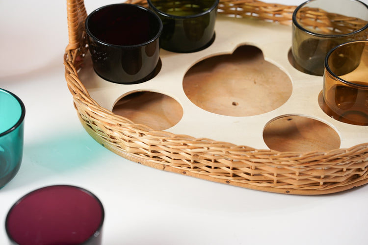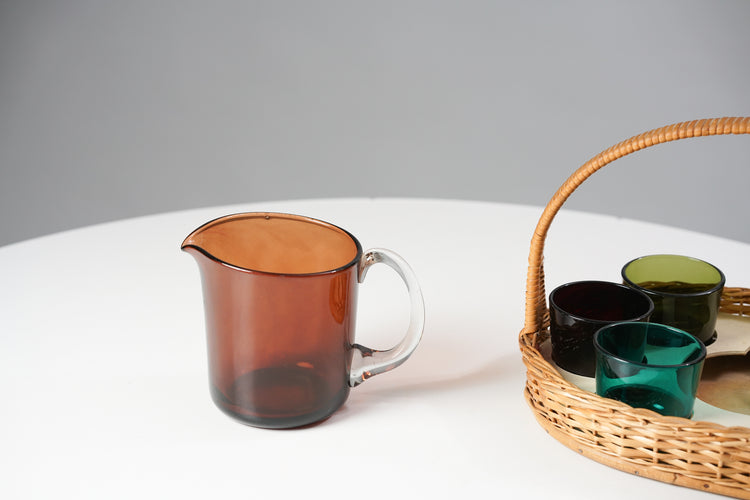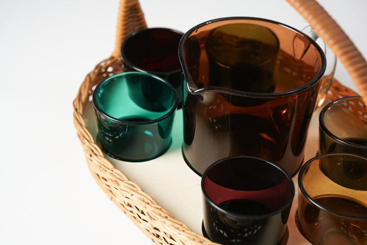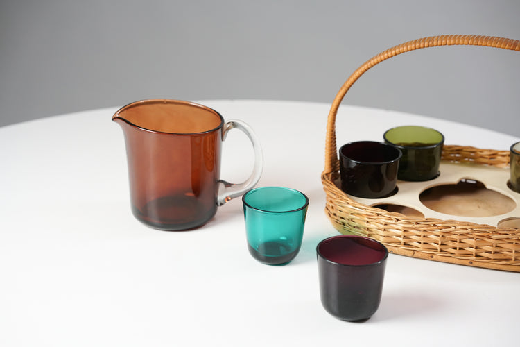Mehusetti, design Kaj Franck, valmistanut Nuutajärvi, 50-luku, sis. säilytyskorin, 6 kpl laseja sekä kannun. Lasia, koripunos, hyvä kunto, valmistajan leima, ajan patinaa ja pientä pintanaarmua laseissa.