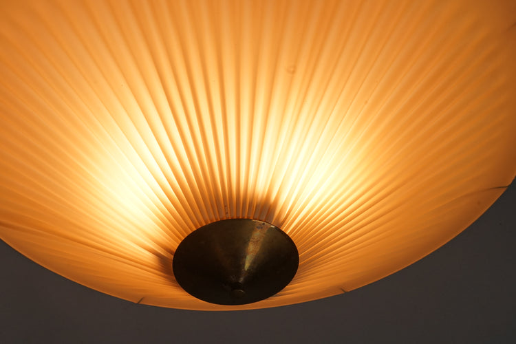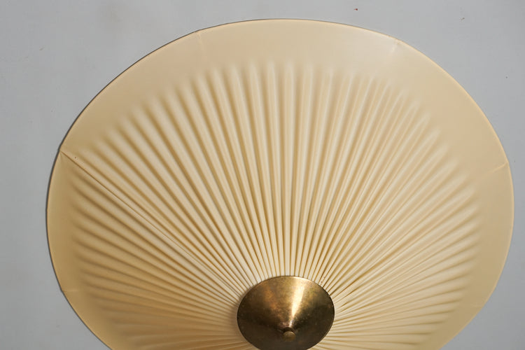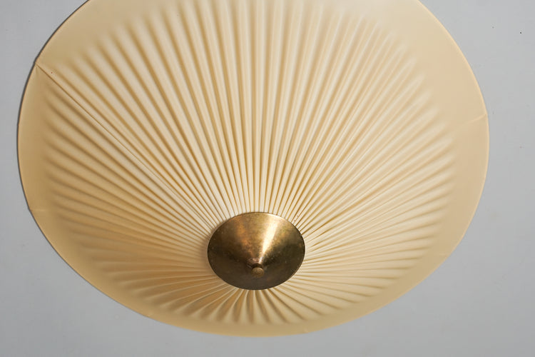 Cone-shaped flush mount. Beige plastic shade. Pleated. Round brass detail in the centre.