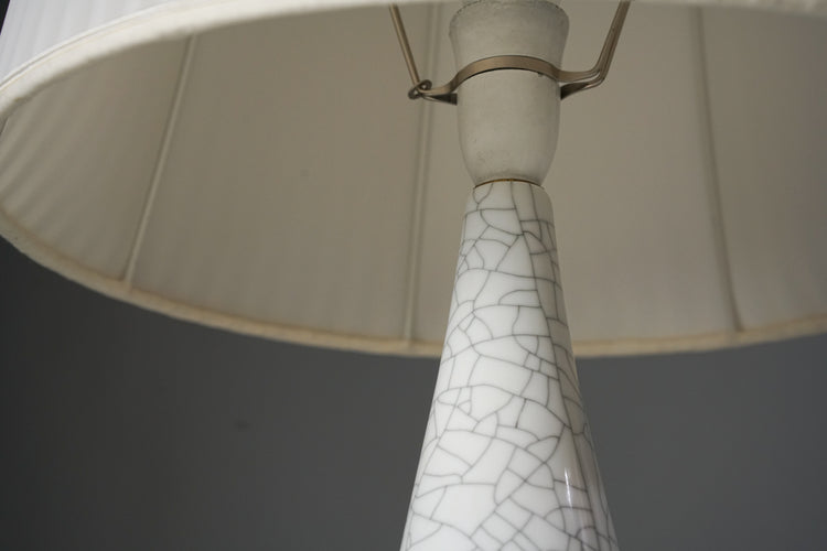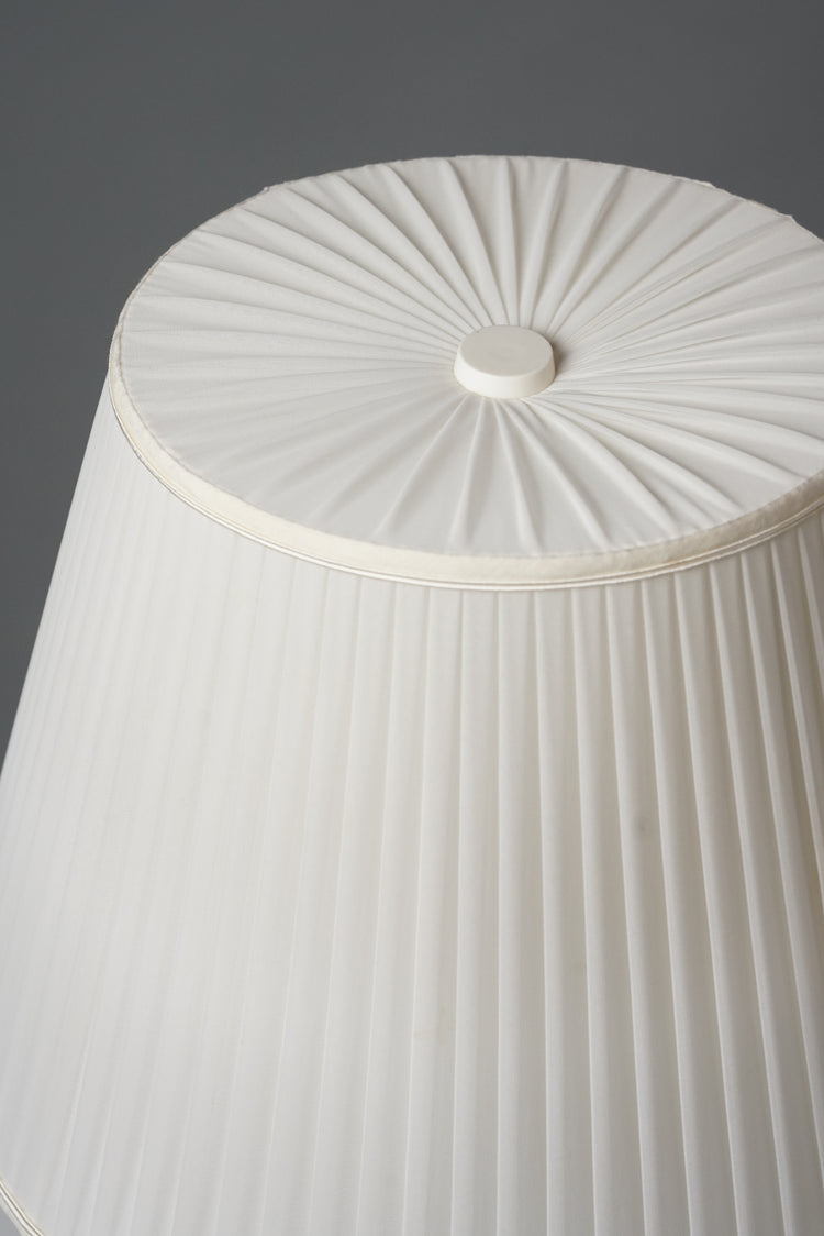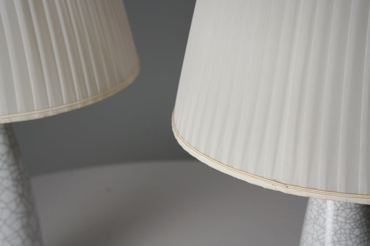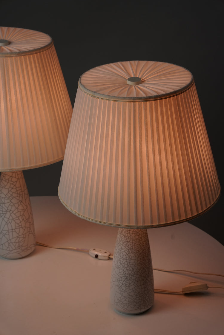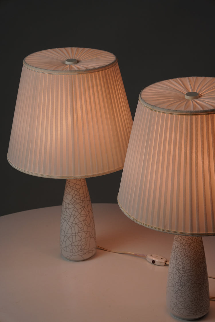 Pöytävalaisin pari, design Toini Muona, valmistanut Arabia, 40-luku, emaloitu keraaminen runko, varjostimet silkkiä, leimattu, hyvä kunto, pientä ajan patinaa. Pöytävalaisimet myydään yhdessä. Ilmoitettu hinta on parin hinta.