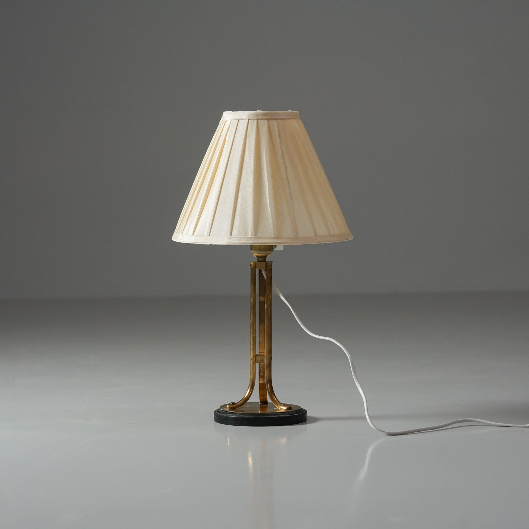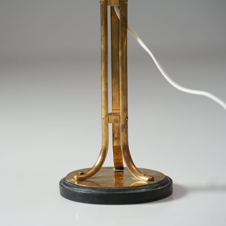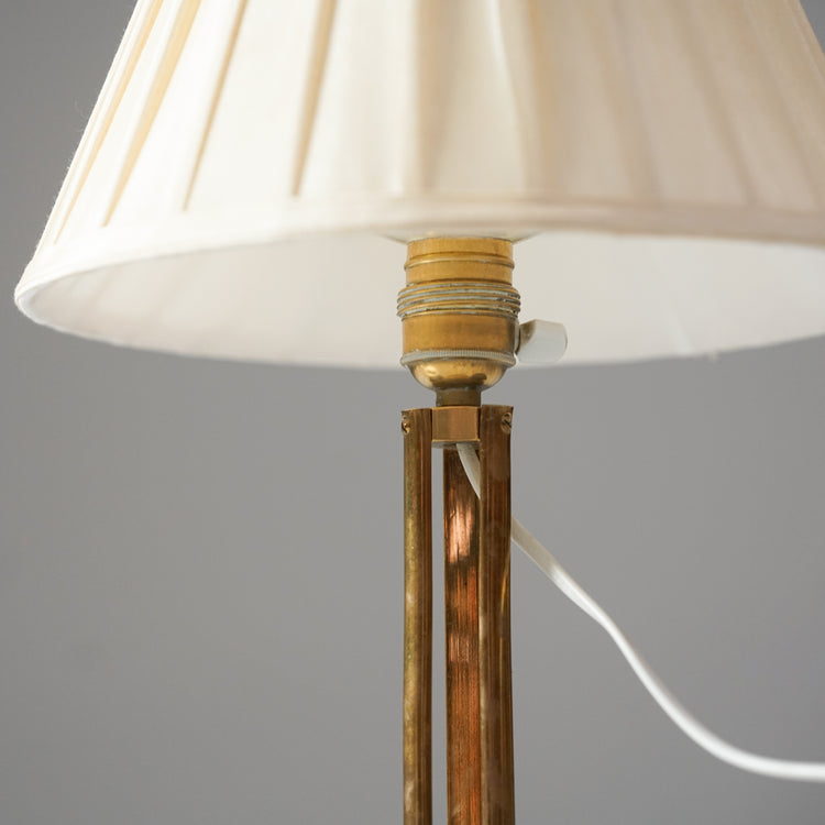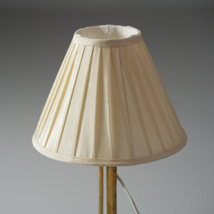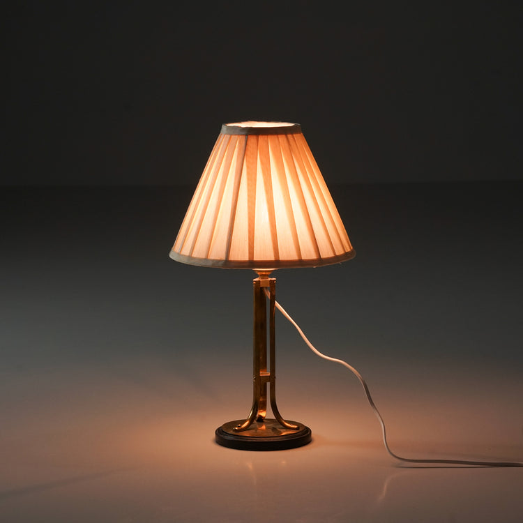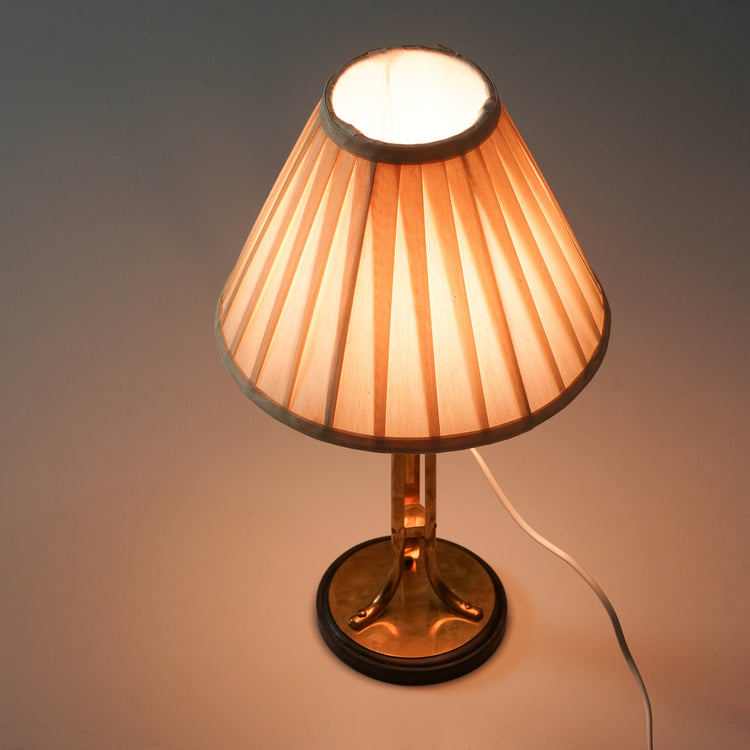 Pöytävalaisin, valmistettu Ruotsissa, 40/50-luku. Messinkiä ja metallia, kangas varjostin. Hyvä kunto, ajan patinaa.