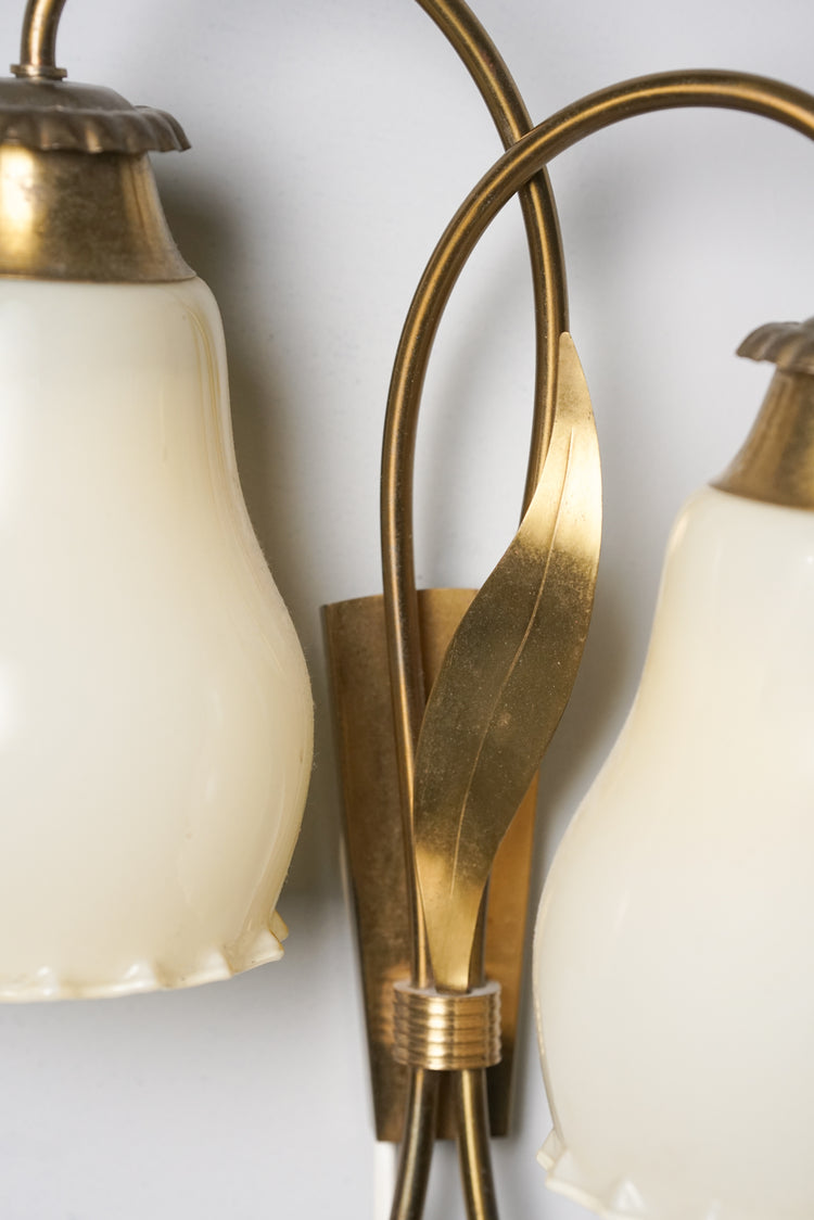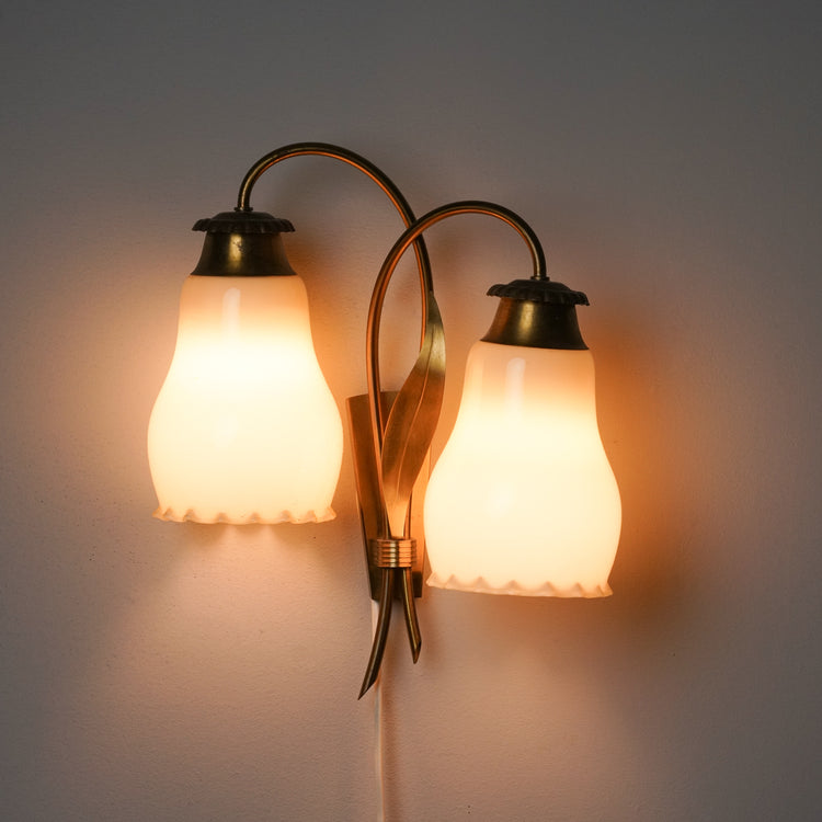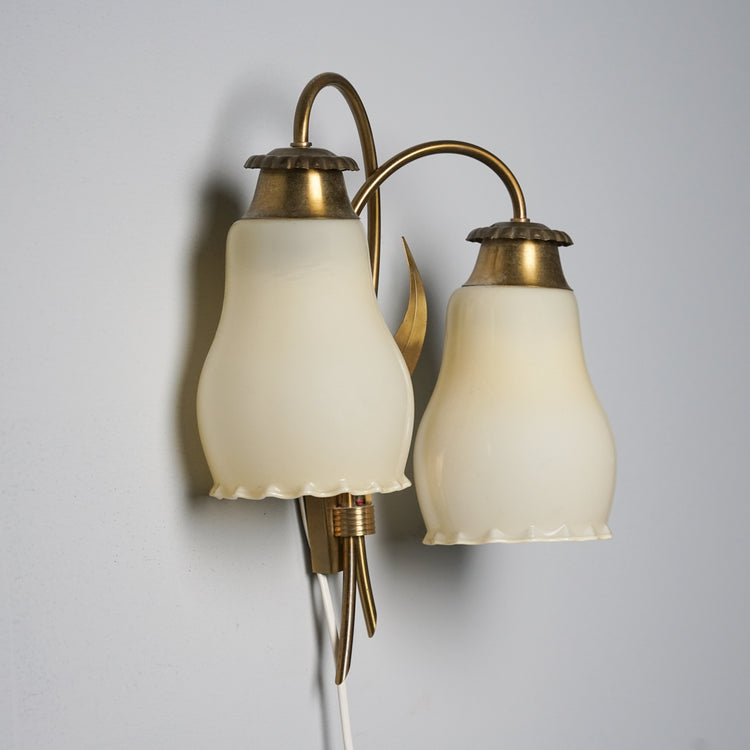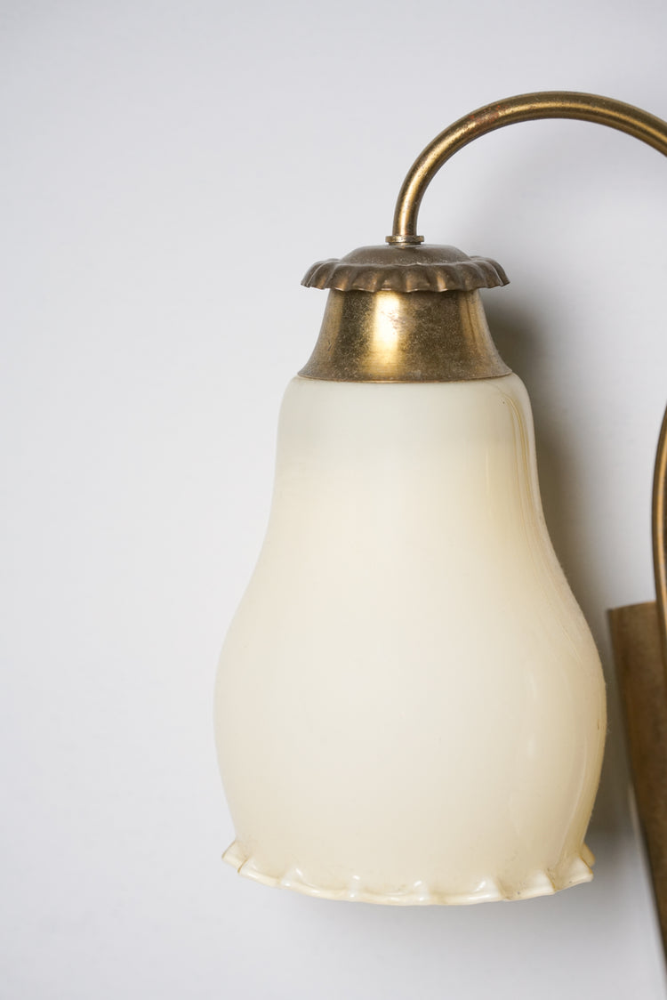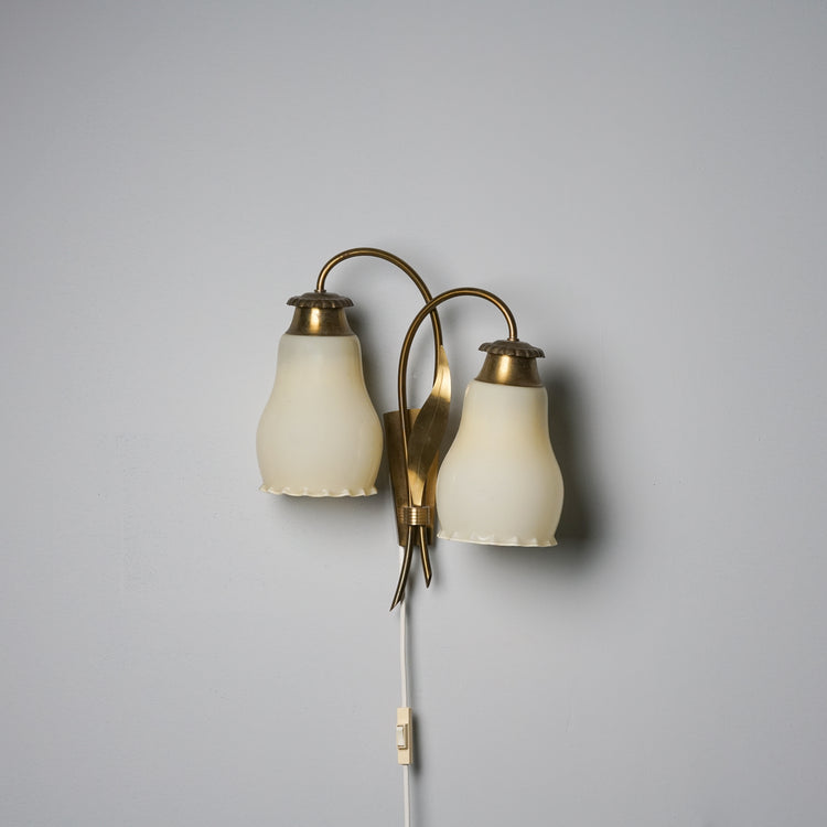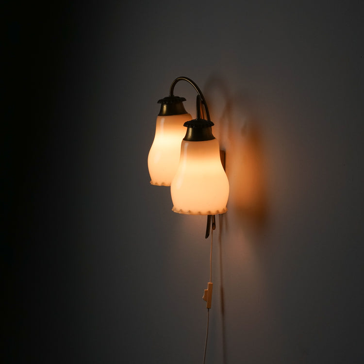 Seinävalaisin, valmistettu Suomessa, 50-luku. Messinkirunko, opaali lasikuvut. Hyvä kunto, pientä ajan patinaa.