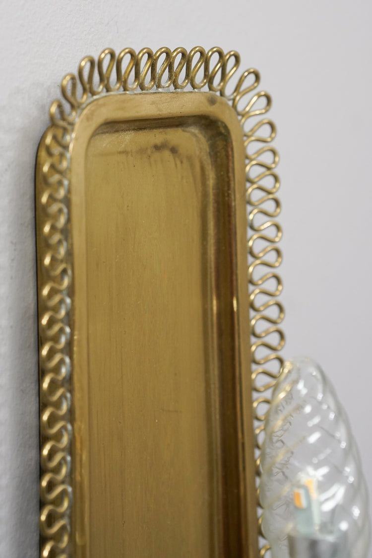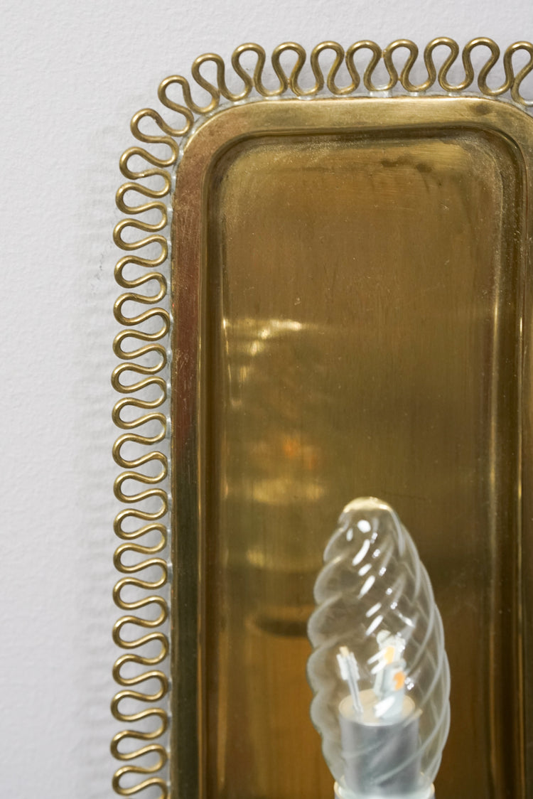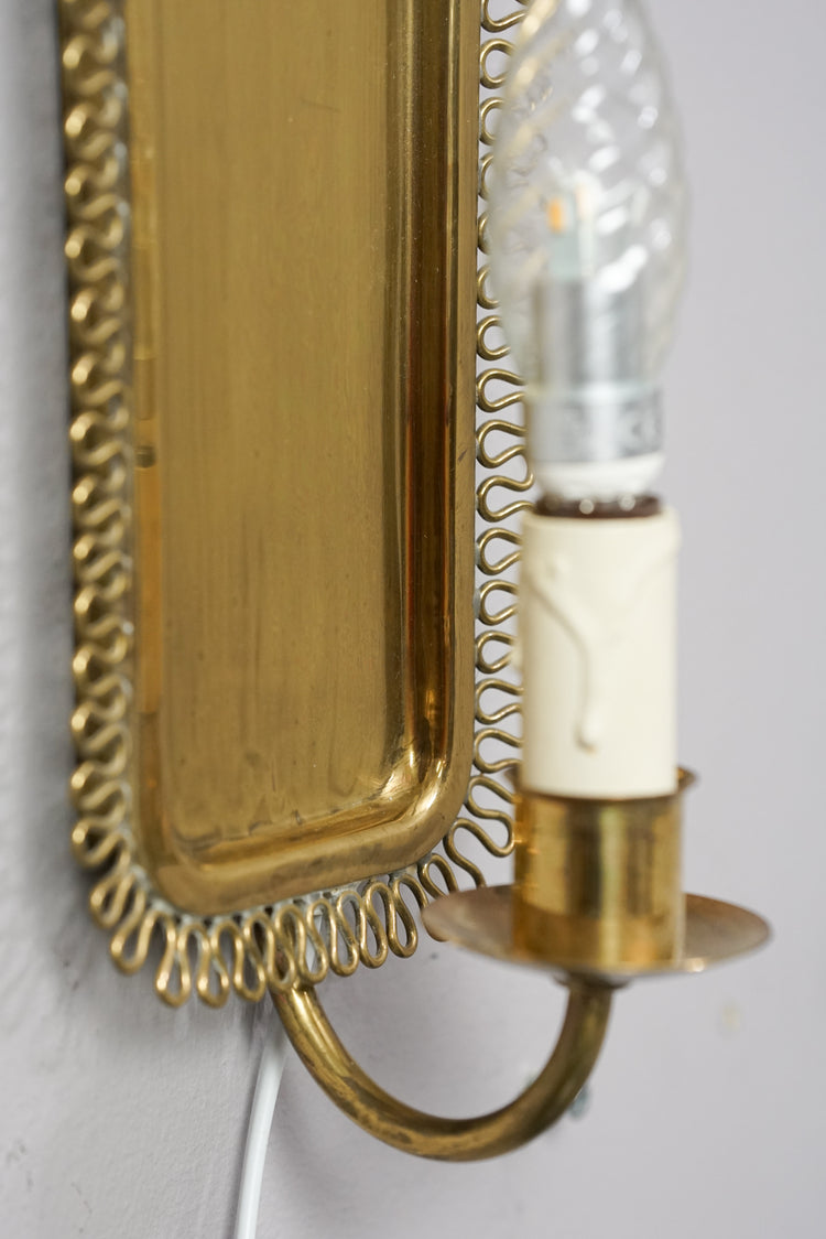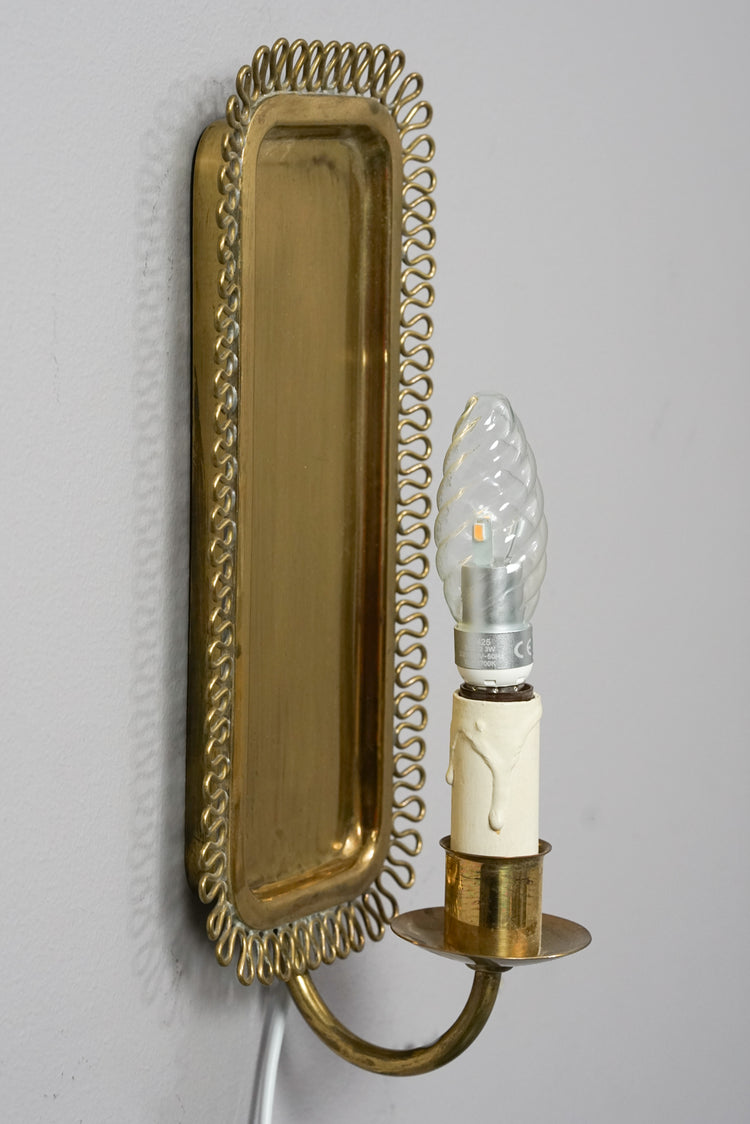Lampetti seinävalaisin, valmistanut Taidetakomo Hakkarainen, 30/40-luku, messinkiä ja muovinen kynttilä-yksityiskohta. Hyvä kunto, pientä ajan patinaa.