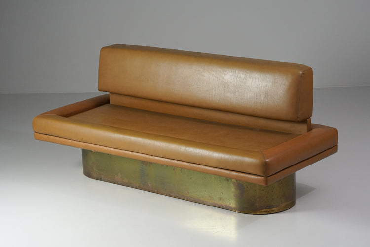 Sohva, design Leena Kolinen, 1968. Keinonahka verhoilu, messinki runko. Hyvä kunto, ajan patinaa ja pientä jälkeä.