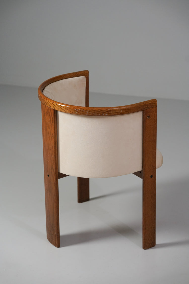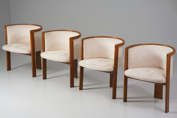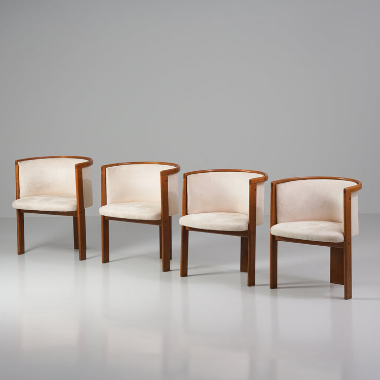 Tuolit (4 kpl myydään yhdessä), design Antti Nurmesemi, 70-luku. Tiikki runko, myöhemmin uudelleen verhoiltu alcantara -kankaalla. Hyvä kunto, ajan patinaa ja pientä jälkeä kankaassa. Kysy lisää uudelleenverhoilu mahdollisuudesta. Tuolit myydään yhdessä. Ilmoitettu hinta on settihinta.