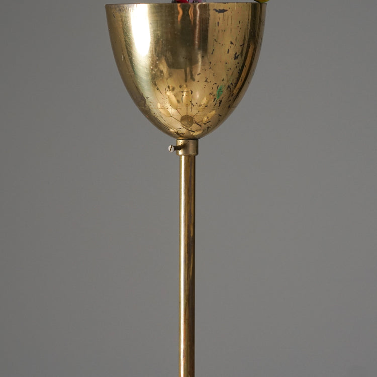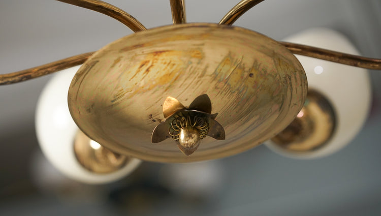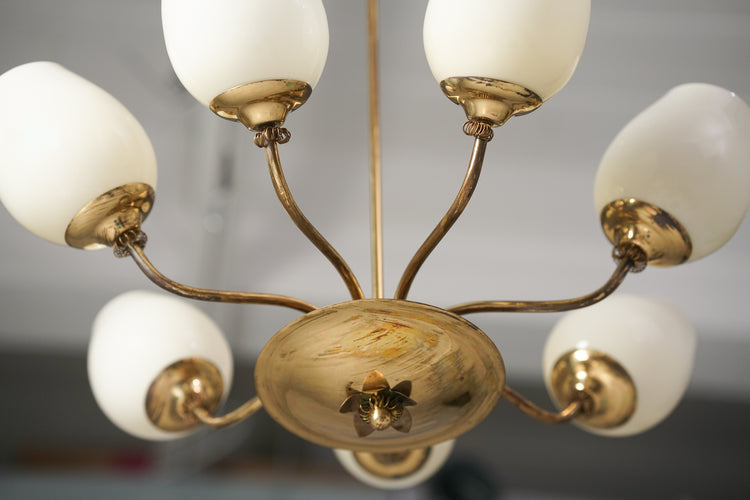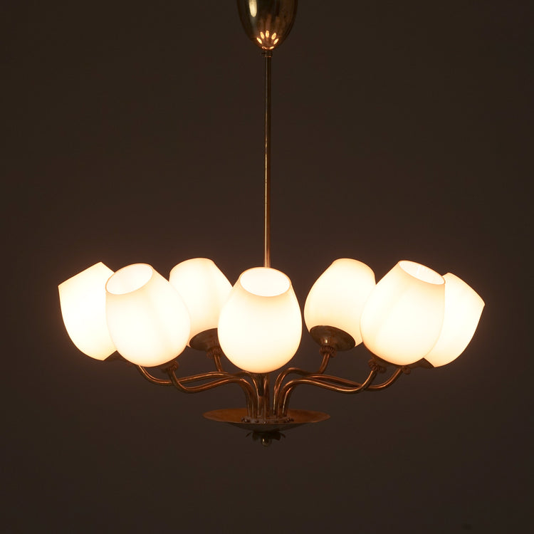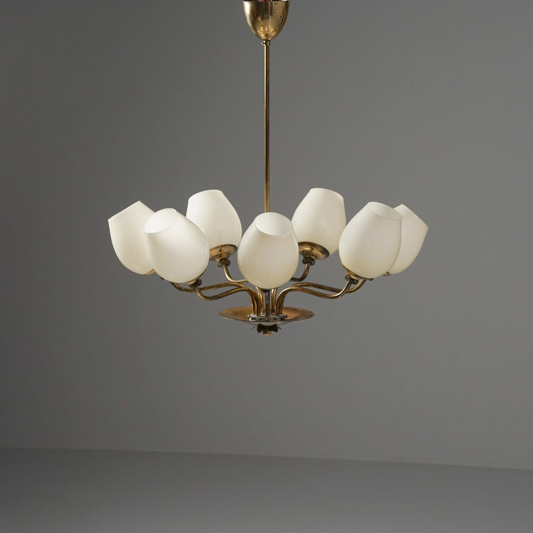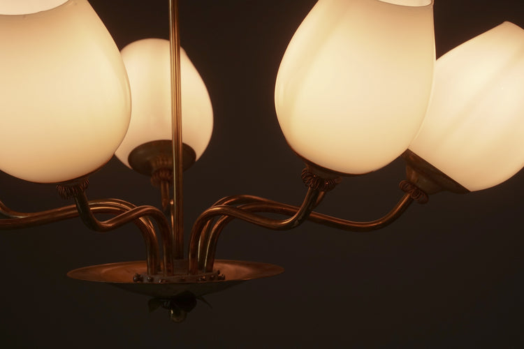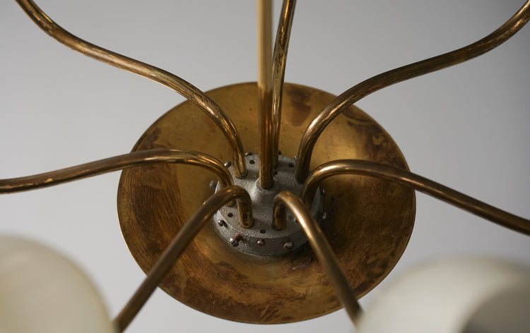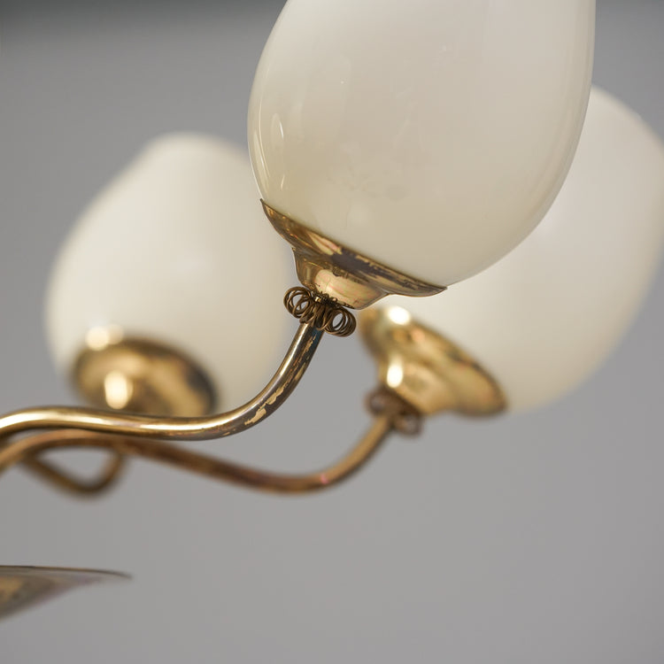 Kattokruunu, attribuoitu valmistaja Itsu, 50-luku. Messinki runko, opaali lasikuvut. Hyvä kunto, ajan patinaa.