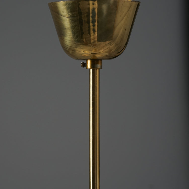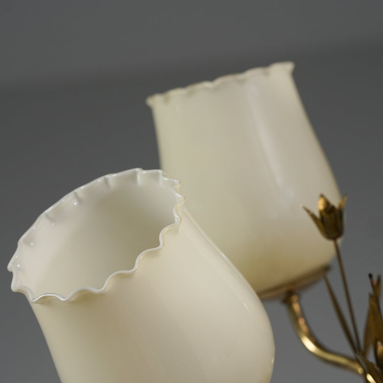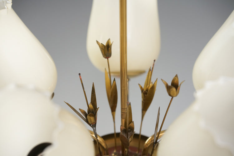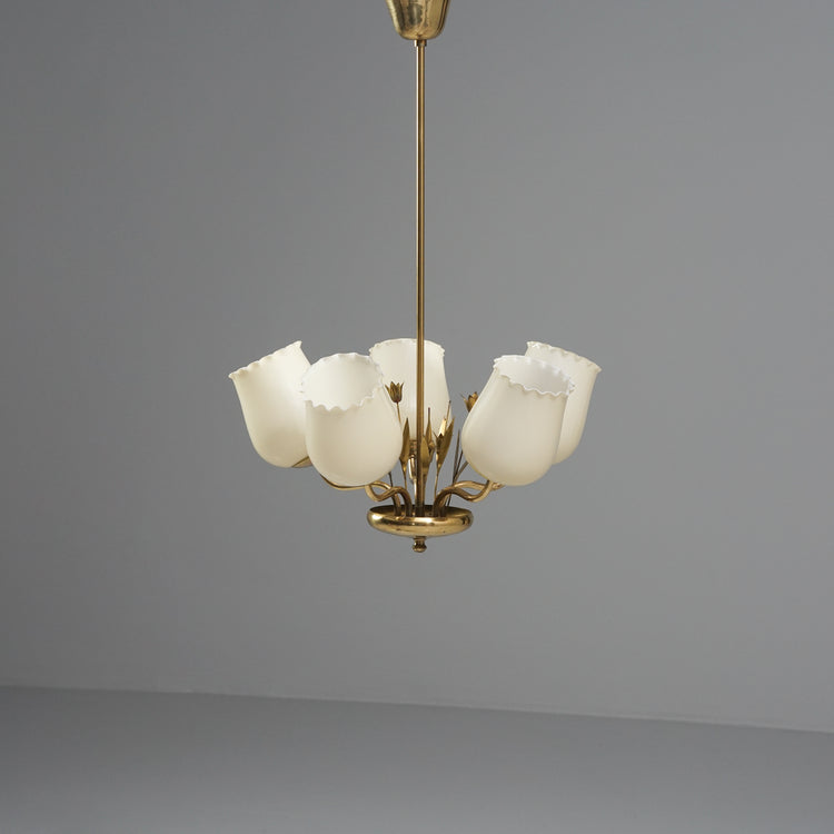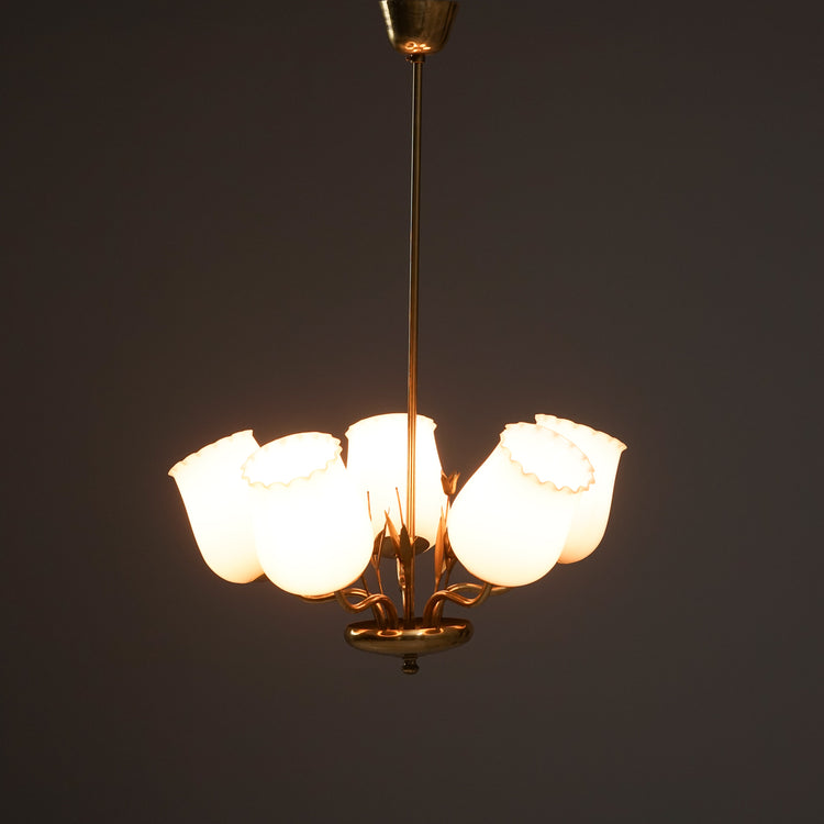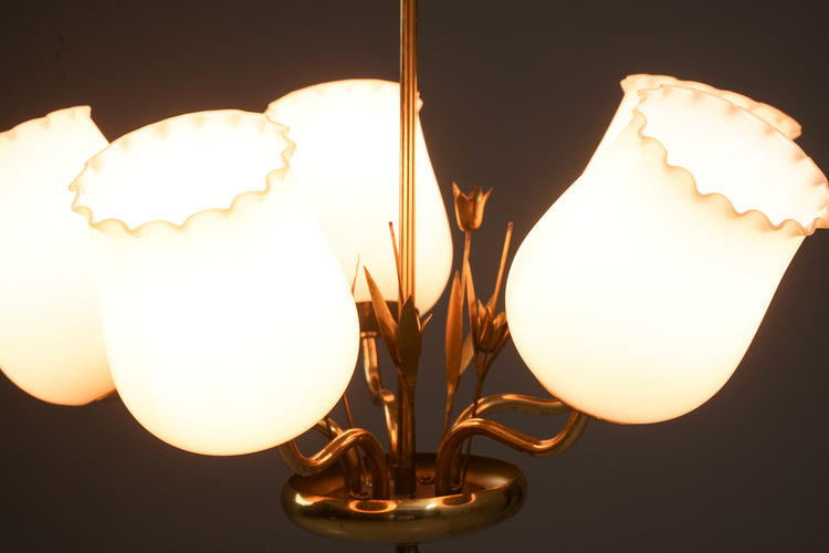Kattovalaisin, valmistettu Suomessa, 50-luku. Runko sekä upeat kukka yksityiskohdat messinkiä, maitolasi kuvut. Hyvä kunto, pientä ajan patinaa.