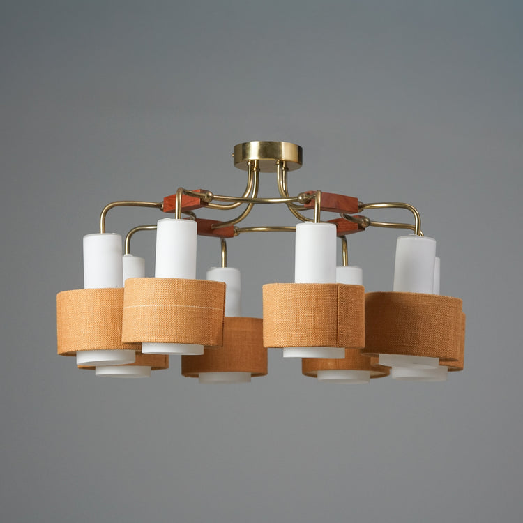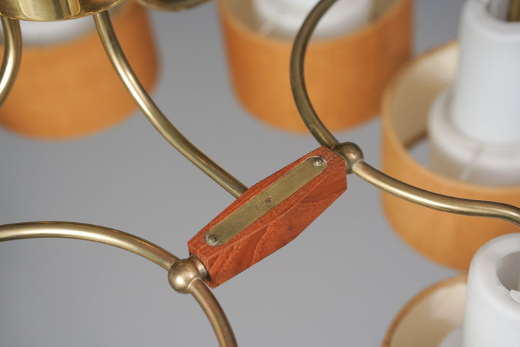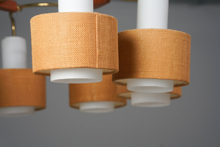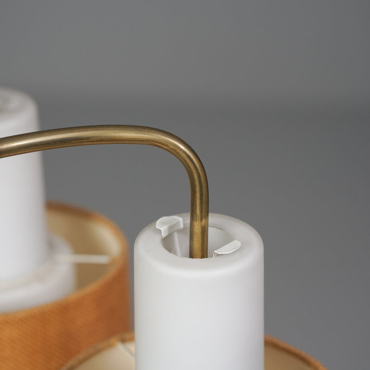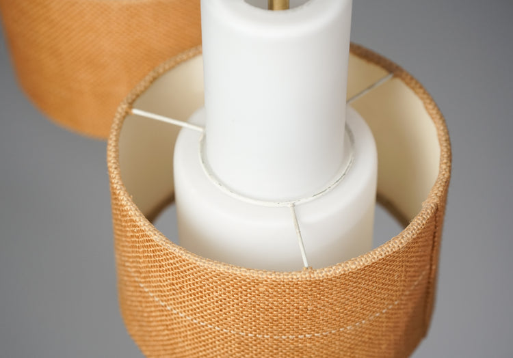 Malli K1-169/8 kattovalaisin (2kpl), design Paavo Tynell, valmistanut Idman, 50/60-luku. Messinkirunko, tiikki yksityiskohdat, opaalilasi kuvut, kangas varjostimet. Leimattu. Hieno alkuperäinen kunto, pientä ajan patinaa. Valaisimet myydään erikseen. Ilmoitettu hinta on kappalehinta.
