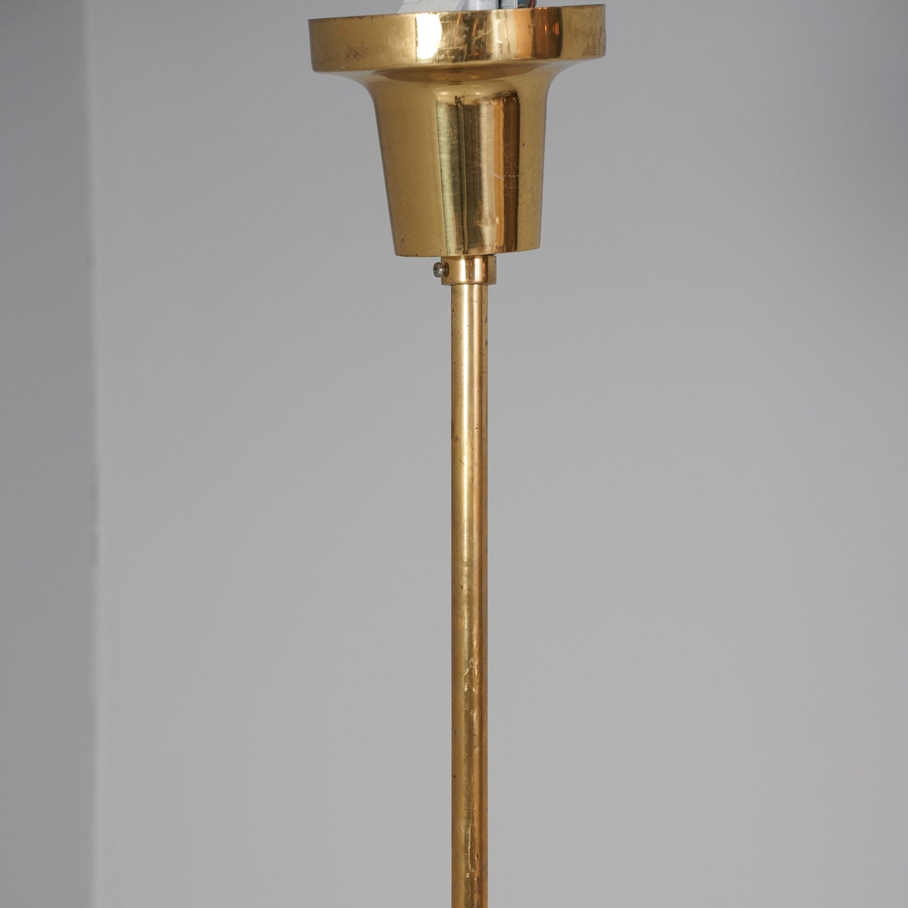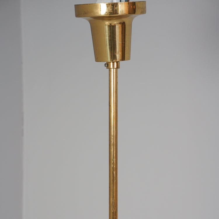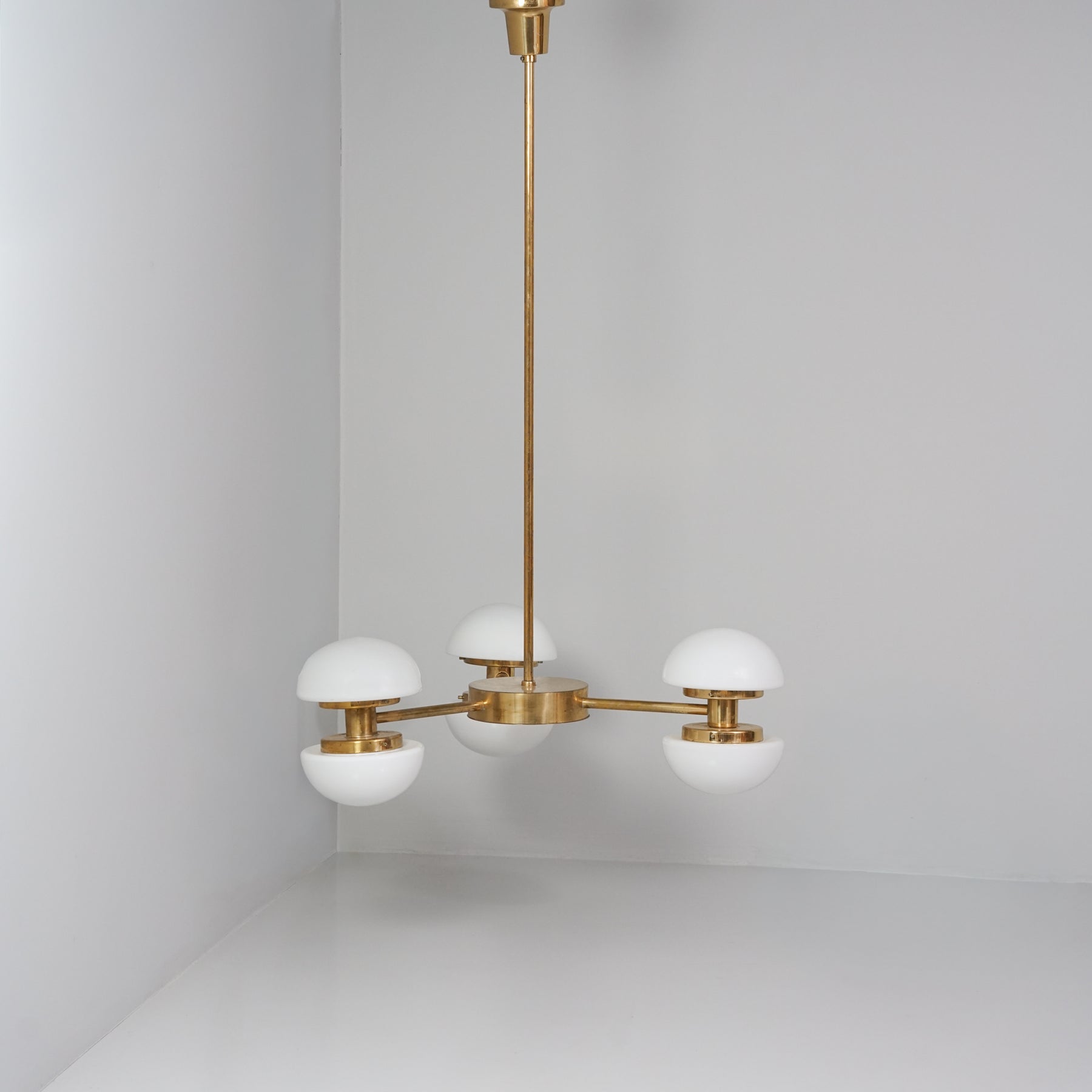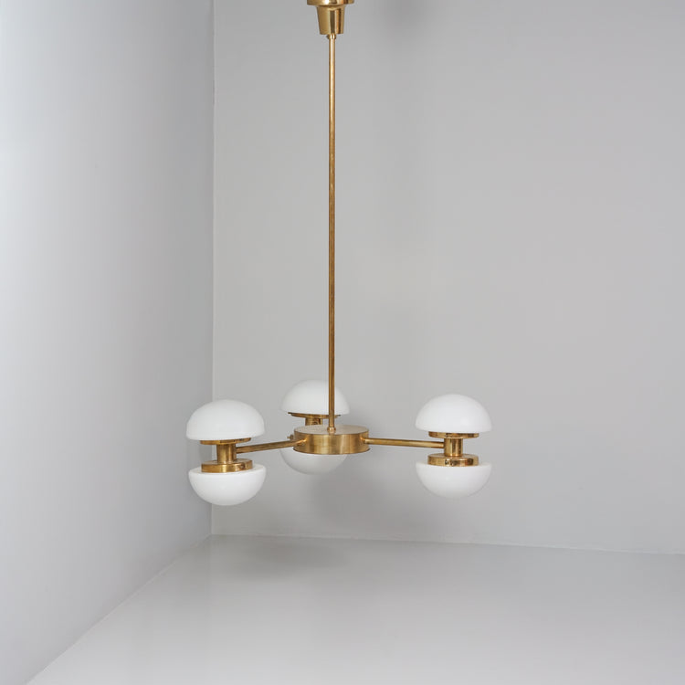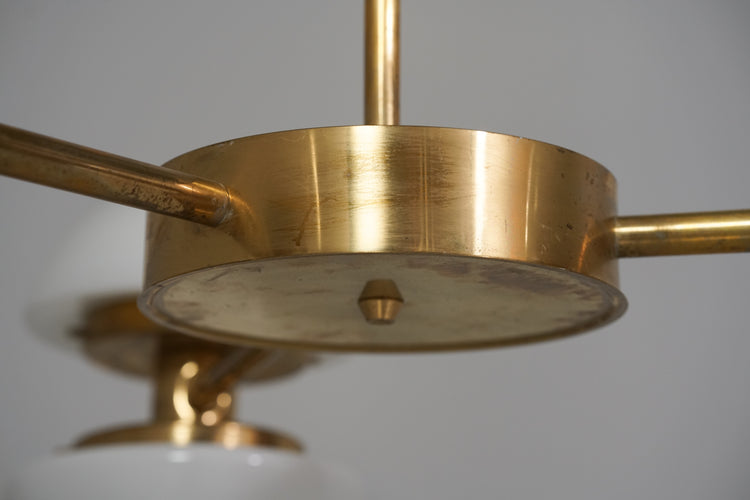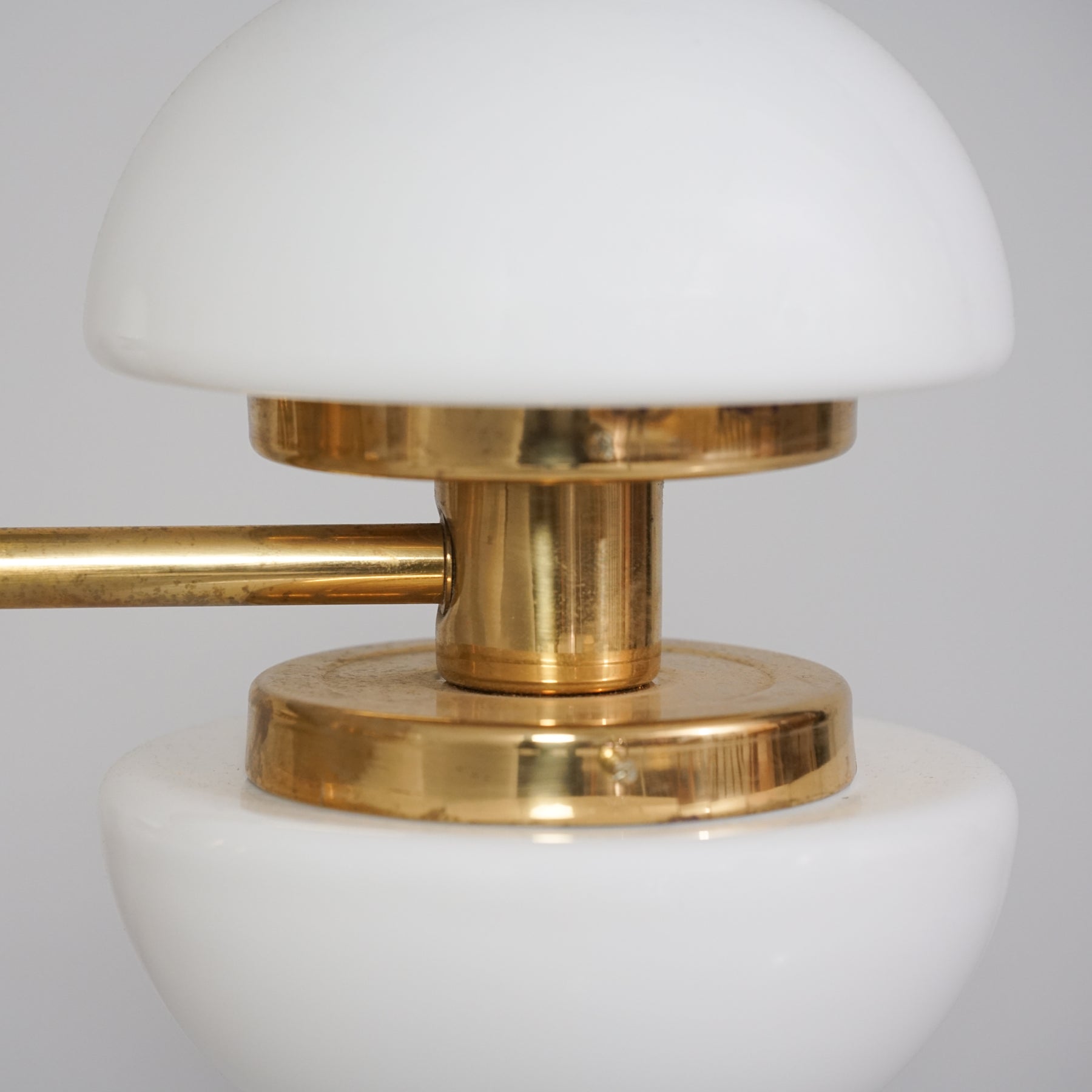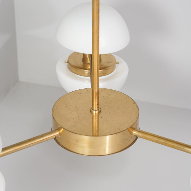 Kattokruunu malli "Bau", design Klaus Michalik, valmistanut Thorn Orno, 90-luku. Runko messinkiä, opaalilasi kuvut. Hyvä kunto, pientä ajan patinaa.