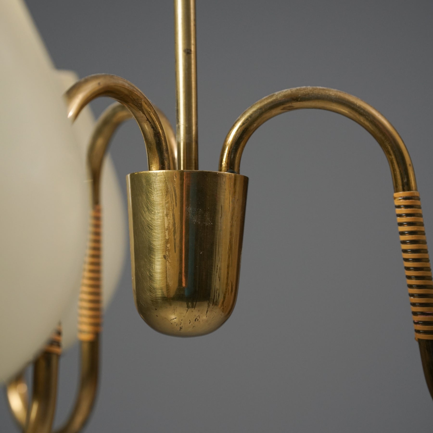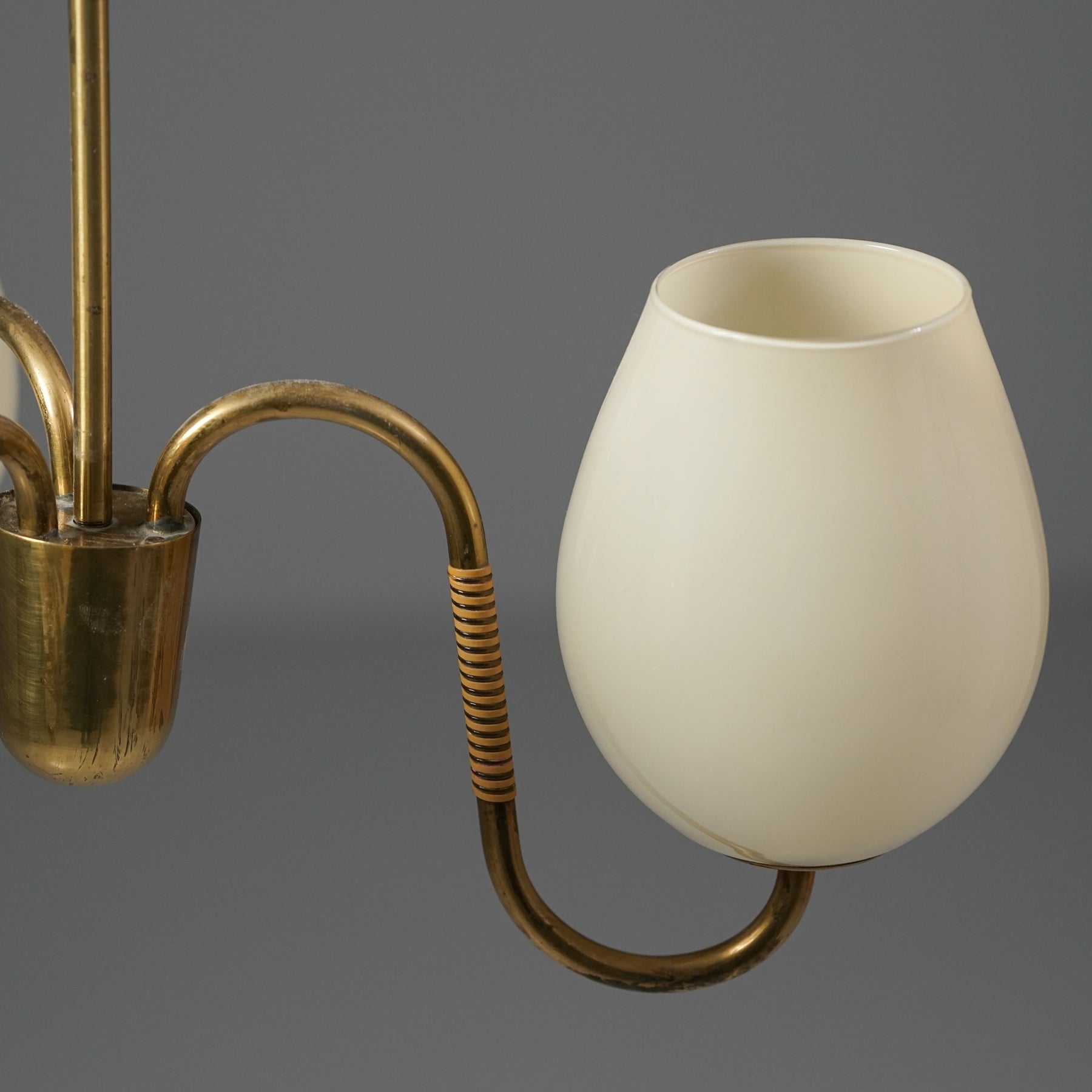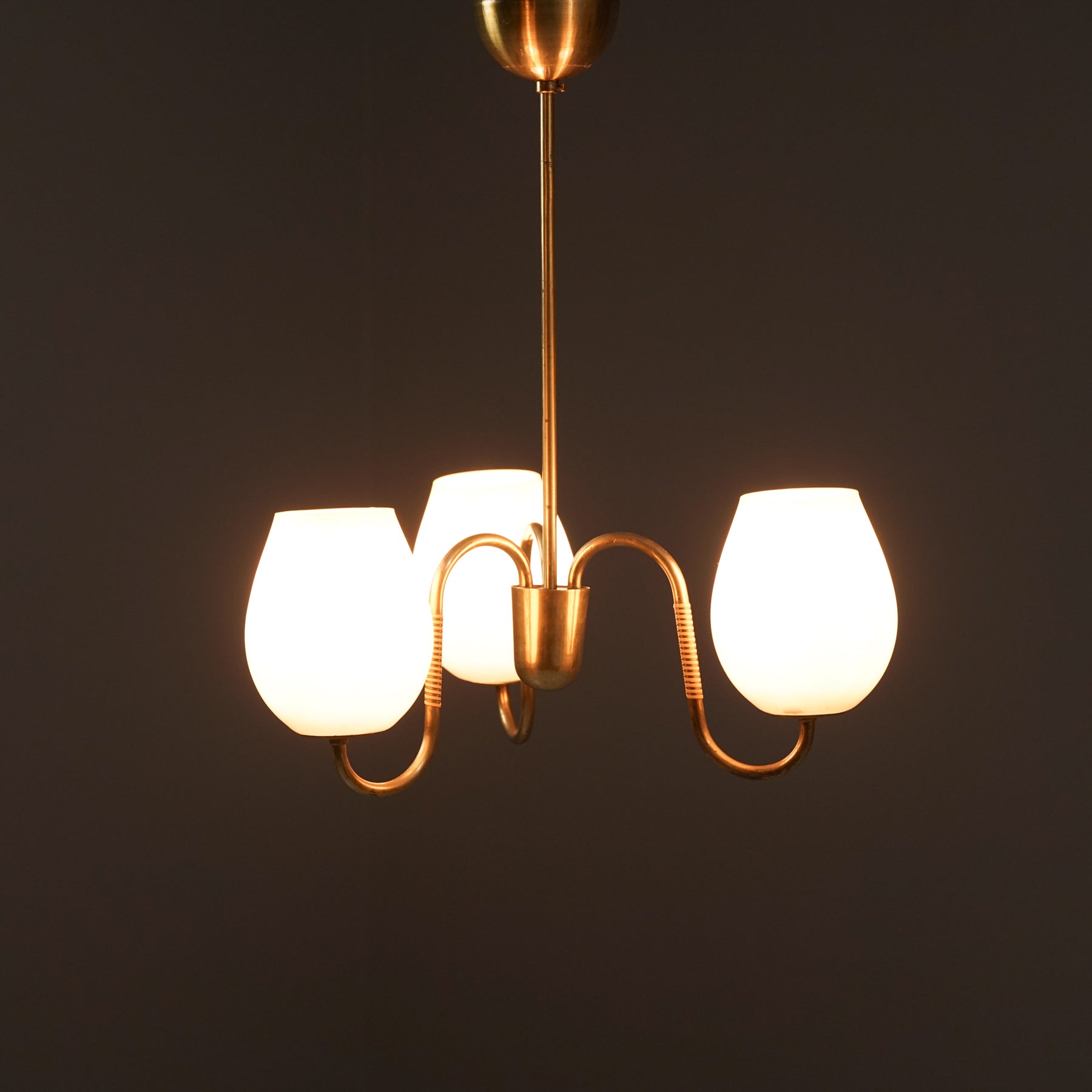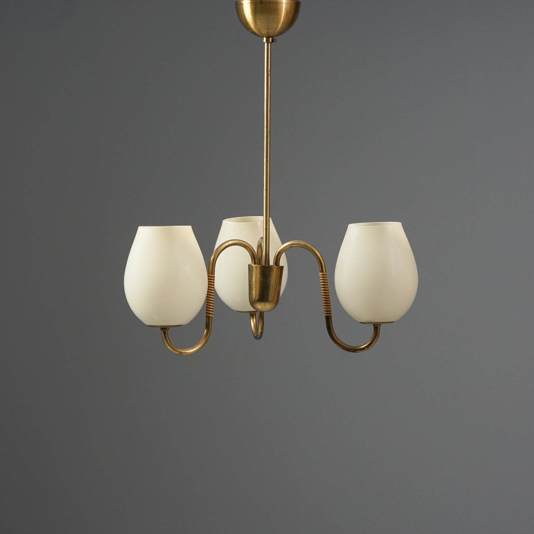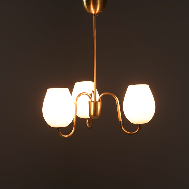 Kattovalaisin, valmistettu Suomessa, 50-luku. Runko messinkiä, rottinki yksityiskohdat, opaali lasikuvut. Hyvä kunto, pientä ajan patinaa.