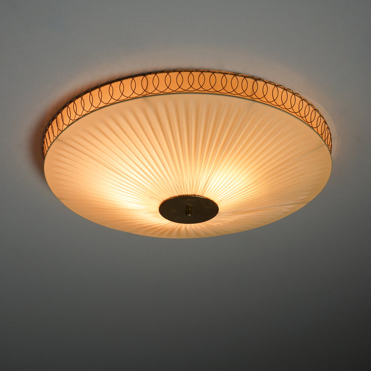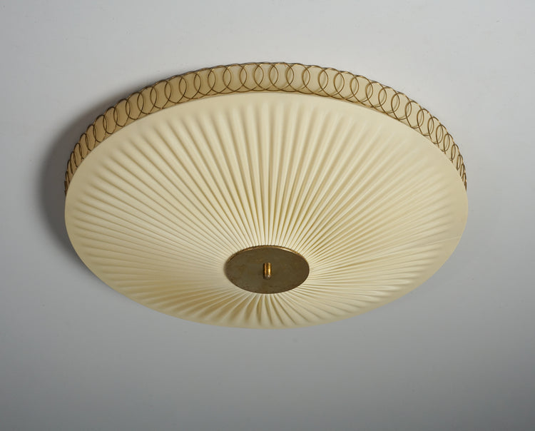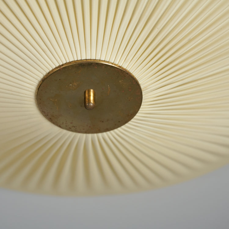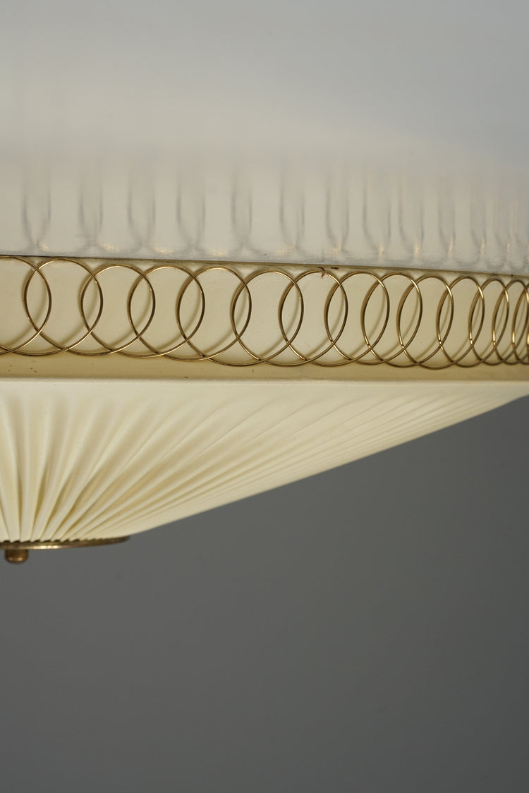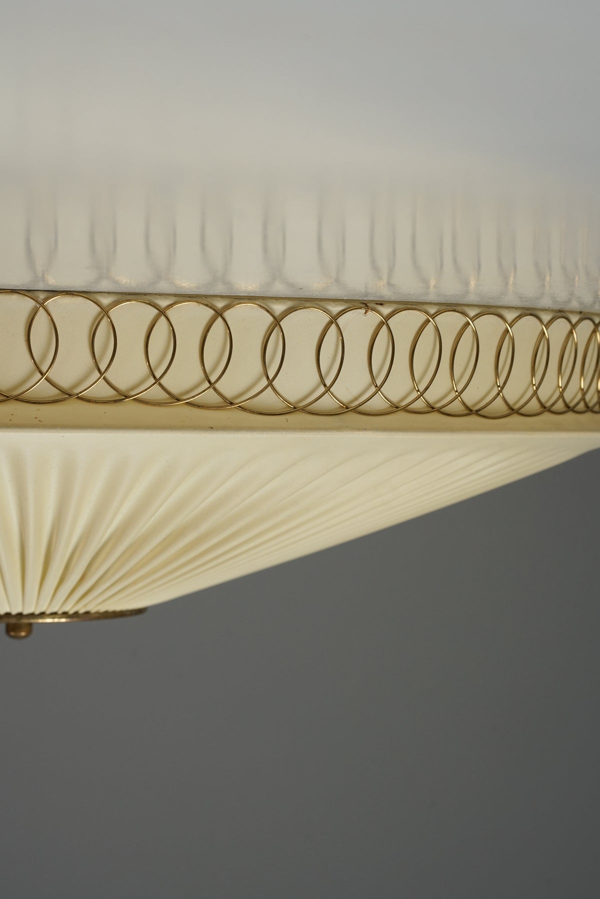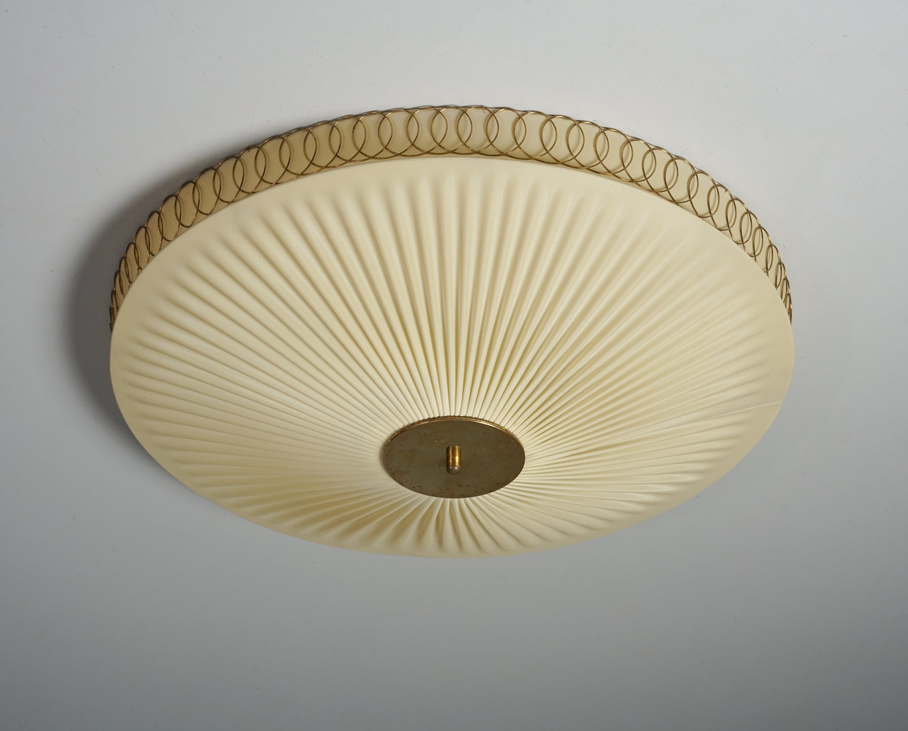 Plafondi, valmistettu Suomessa, 50-luku. Messinki yksityiskohdat, muovi varjostin. Hyvä kunto, pientä ajan patinaa.