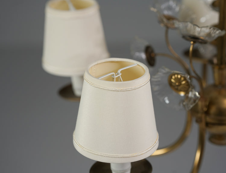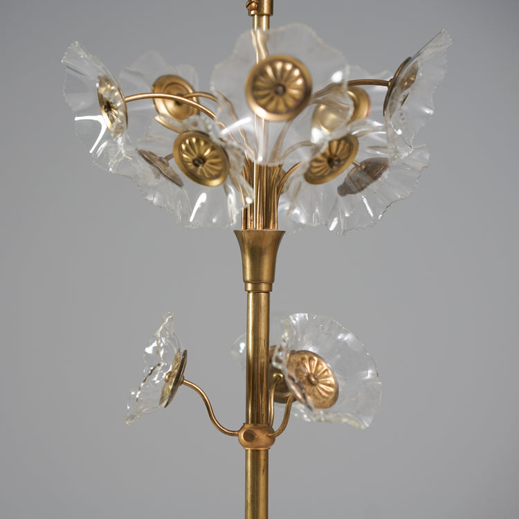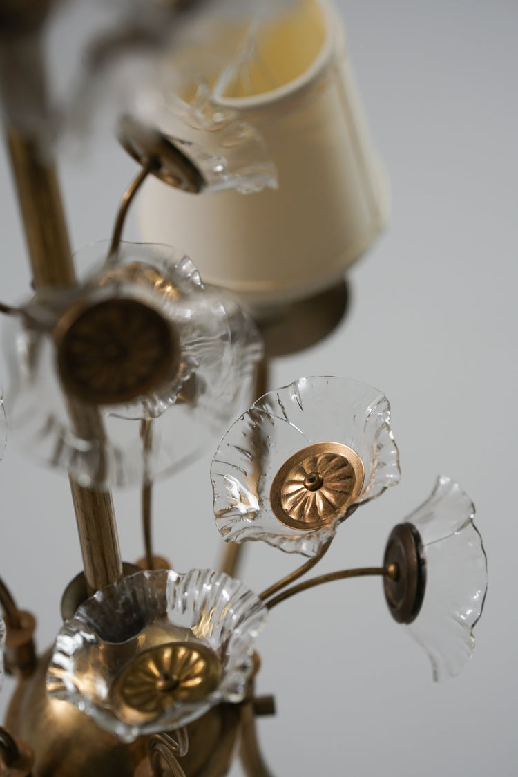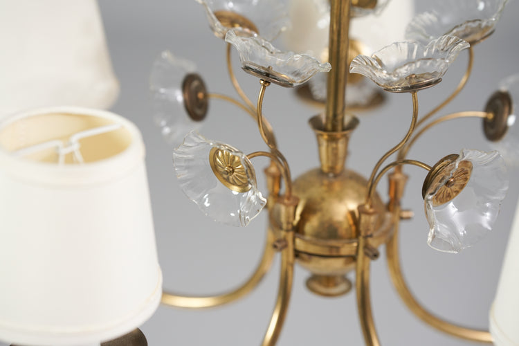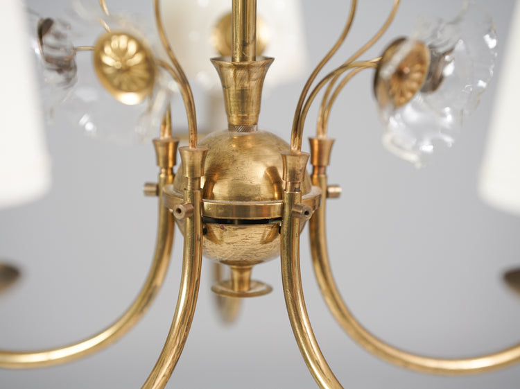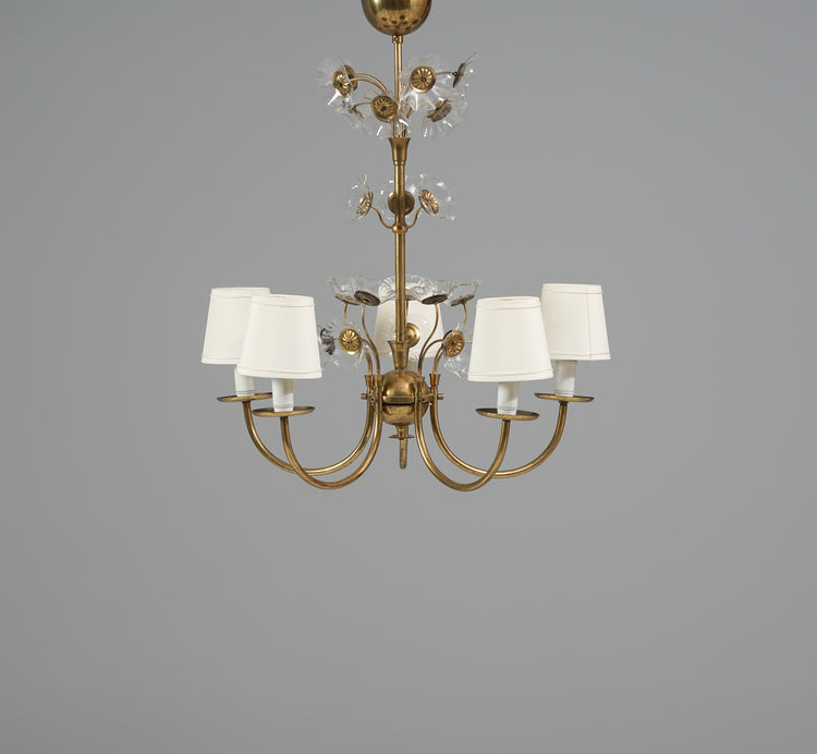Harvinainen kattokruunu, design Lisa Johansson-Pape, 40-luku. Lasiset kukka yksityiskohdat, runko messinkiä, kangas varjostimet. Hyvä kunto, ajan patinaa. Muutamassa lasissa pientä halkeamaa ks. kuvat.