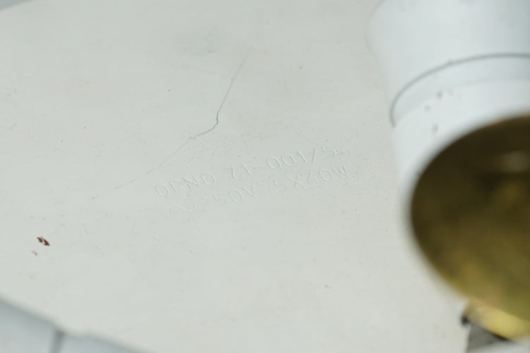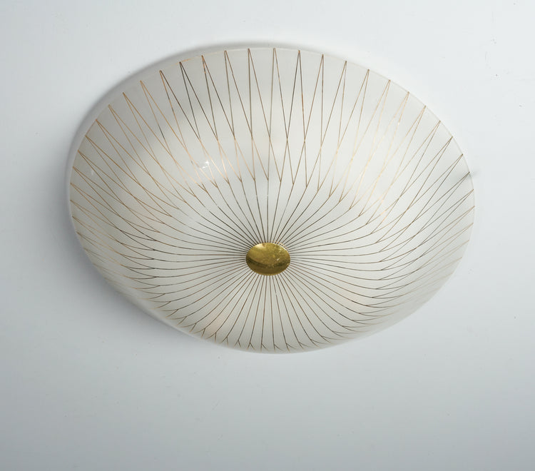 Plafondi, design Lisa Johansson-Pape, valmistanut Orno, 50/60-luku. Messinkiä, huurrettu lasikupu, käsin maalatut yksityiskohdat. Hyvä kunto, pientä ajan patinaa.