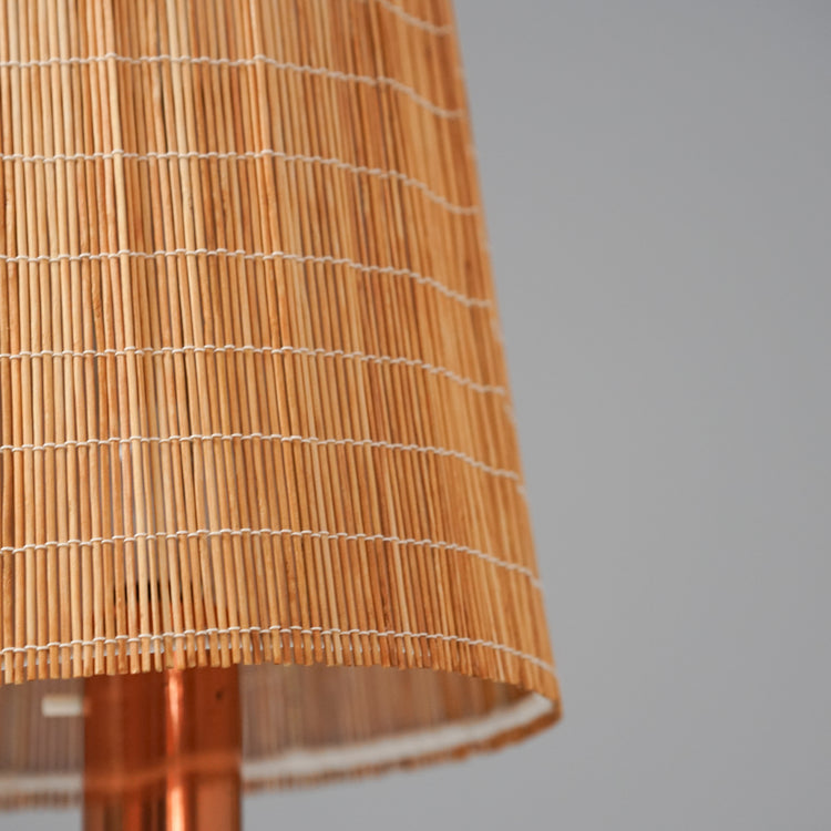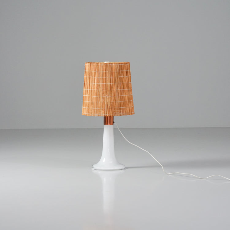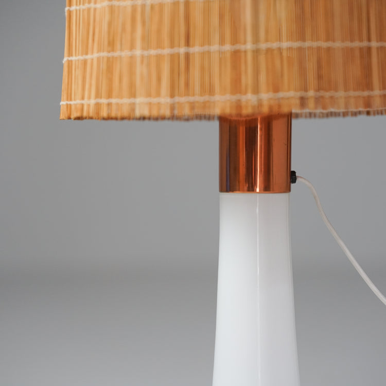 Pöytävalaisin, design Lisa Johansson-Pape, valmistanut Orno, 60-luku. Lasirunko, kupari yksityiskohta, puusäle varjostin. Hyvä kunto, ajan patinaa.