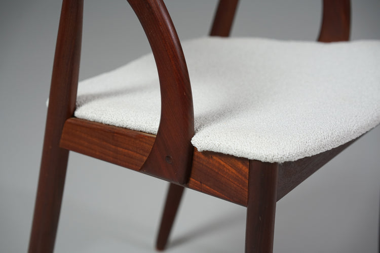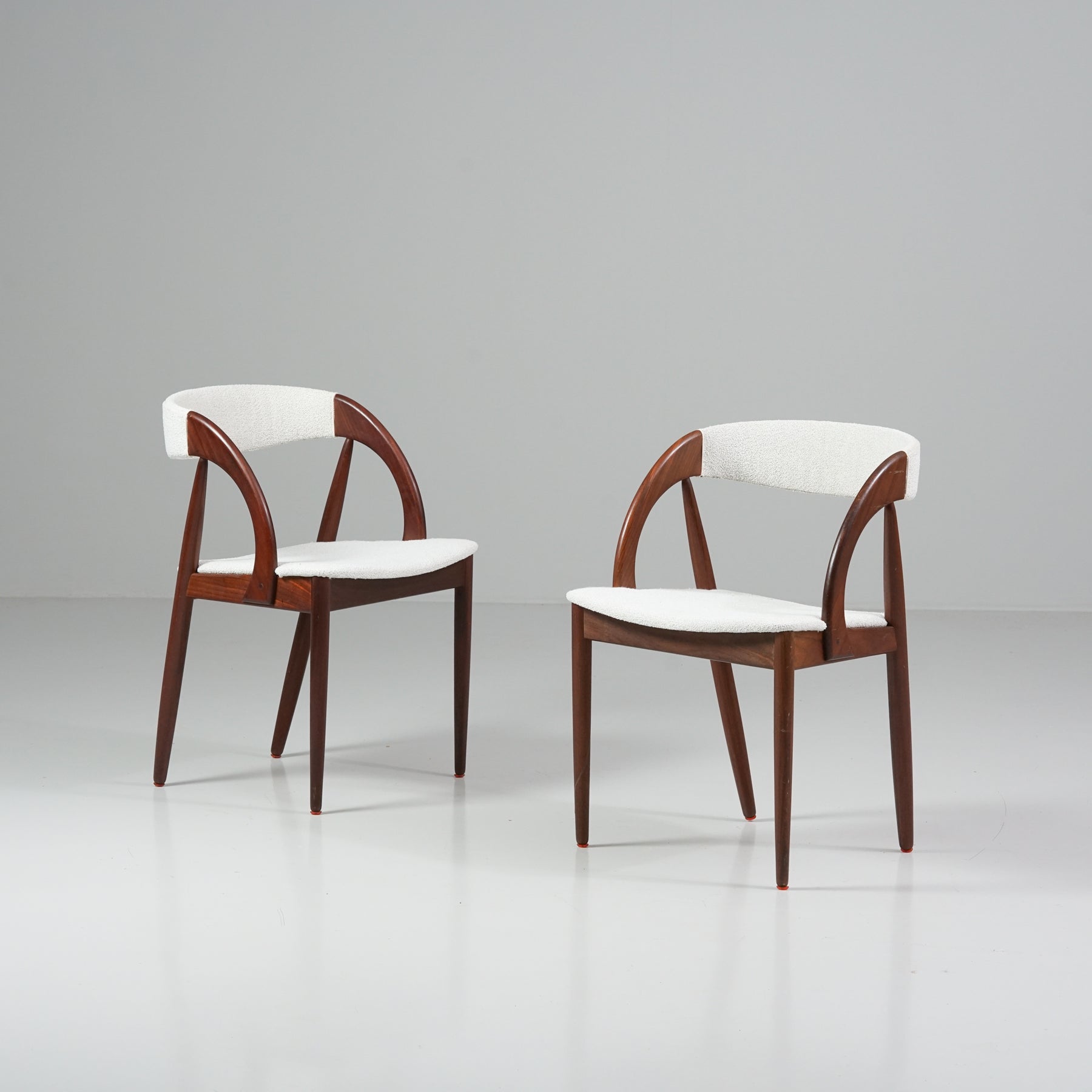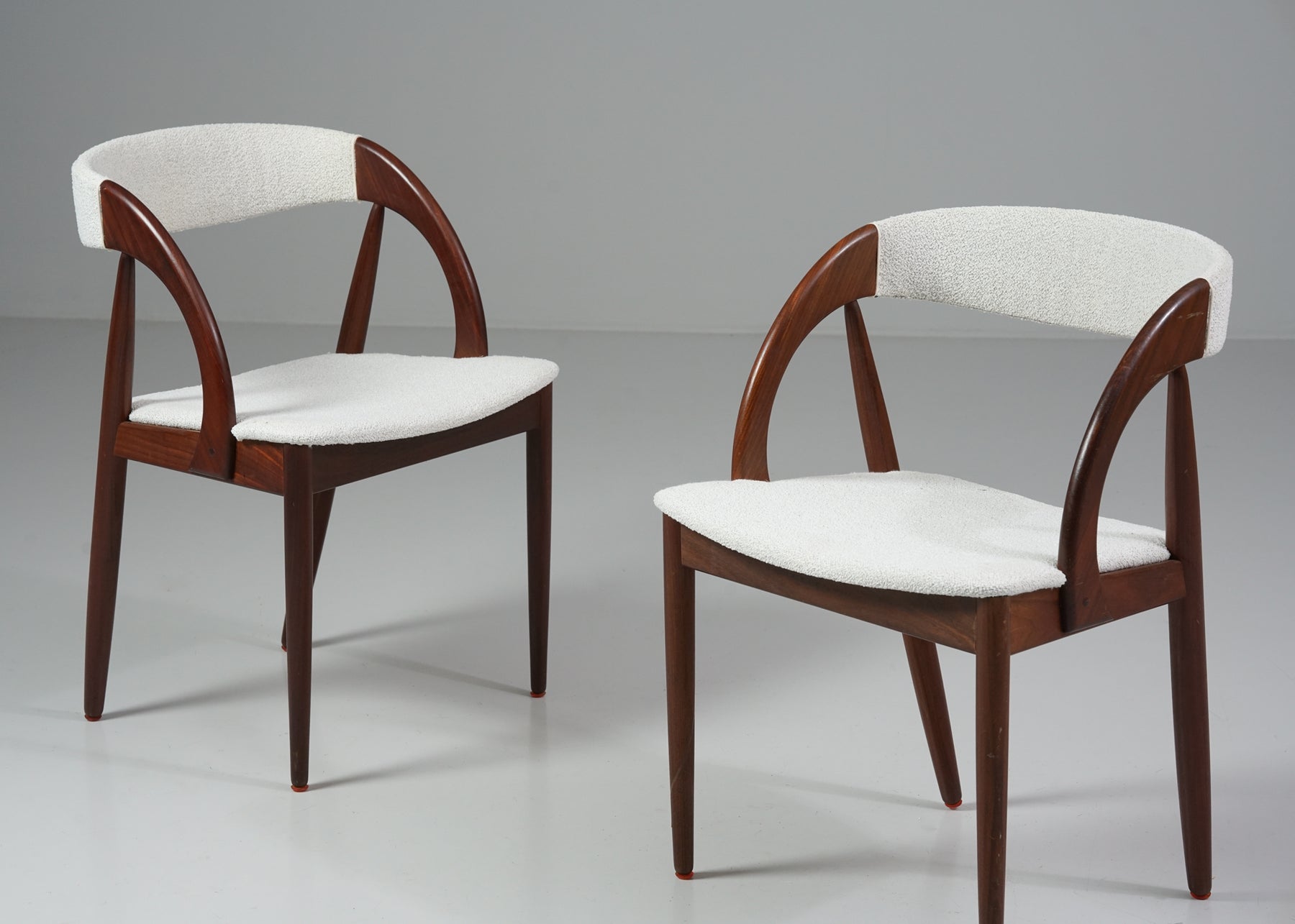 Tuolit (2 kpl myydään yhdessä), valmistettu Tanskassa, 60-luku. Runko ruusupuuta, Uudelleen verhoiltu laadukkaalla Lauritzonin Bond 7 -kankaalla. Hyvä kunto, pientä ajan patinaa. Tuolit myydään yhdessä. Ilmoitettu hinta on settihinta.