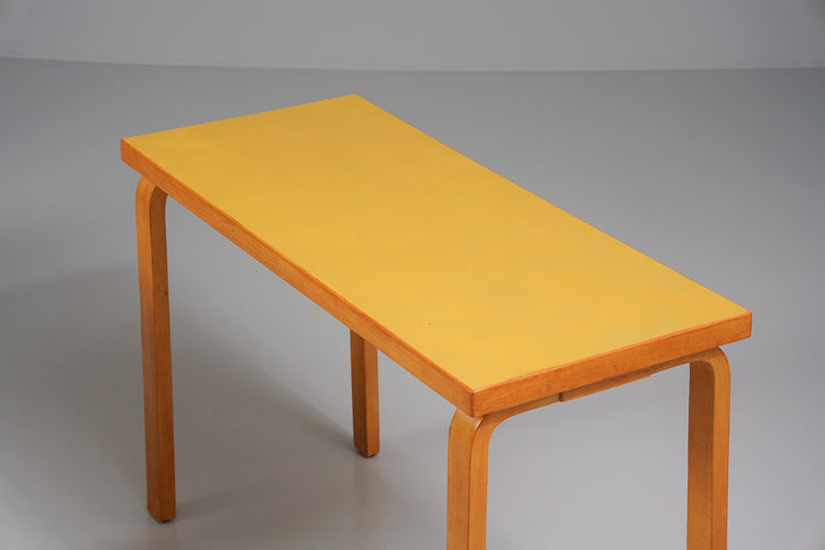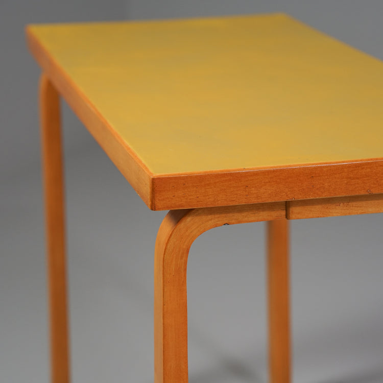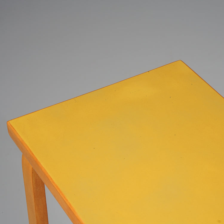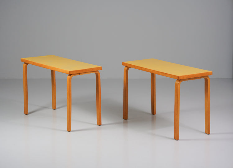Harvinainen pöytäpari (2 kpl myydään yhdessä), design Alvar Aalto, valmistanut Oy Huonekalu- ja Rakennustyötehdas Ab, 50-luku. Mittatilauskoko. Runko koivua, keltainen linoleum taso. Upea kunto, ajan patinaa. Pöydät on entisöity. Pöydät myydään yhdessä. Ilmoitettu hinta on settihinta.