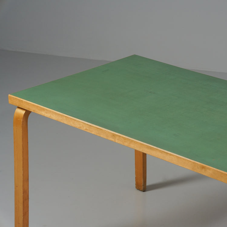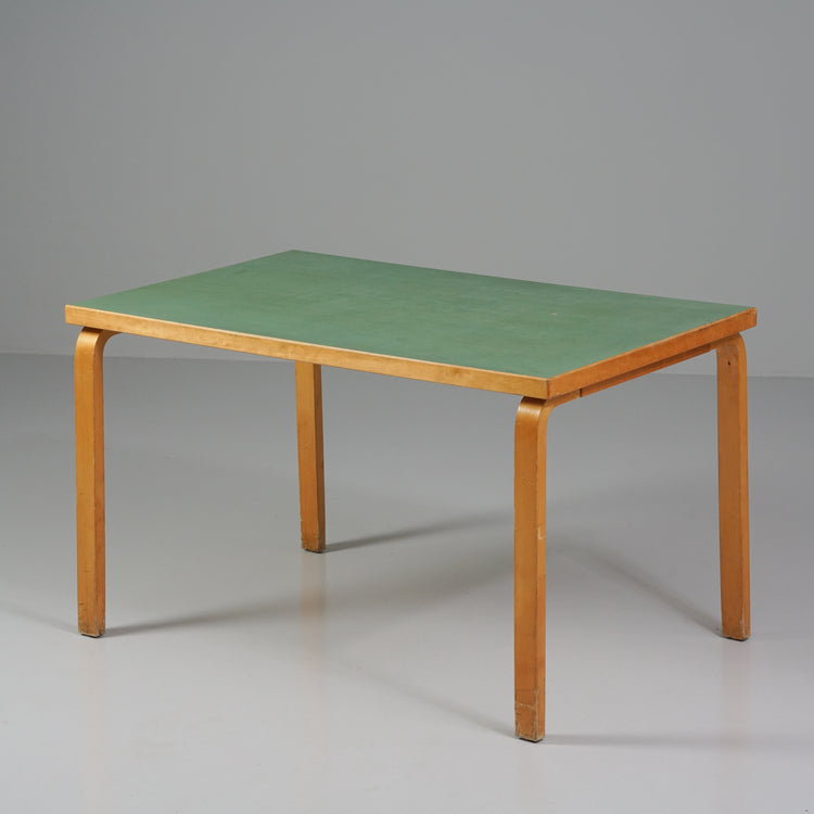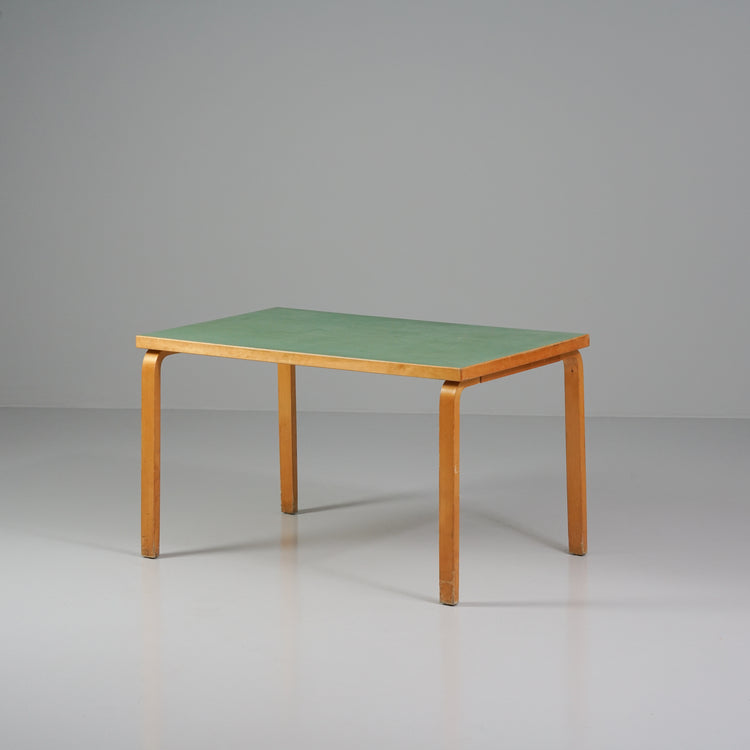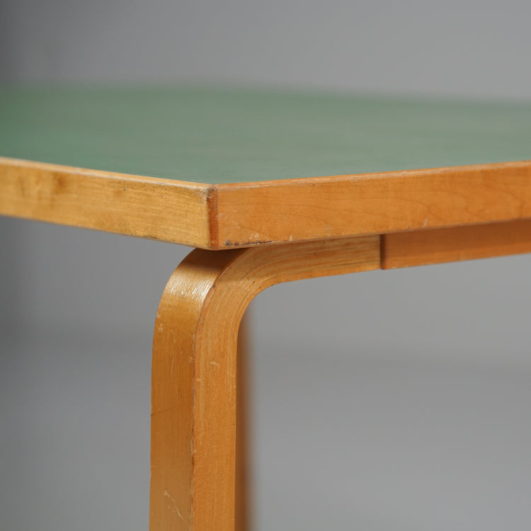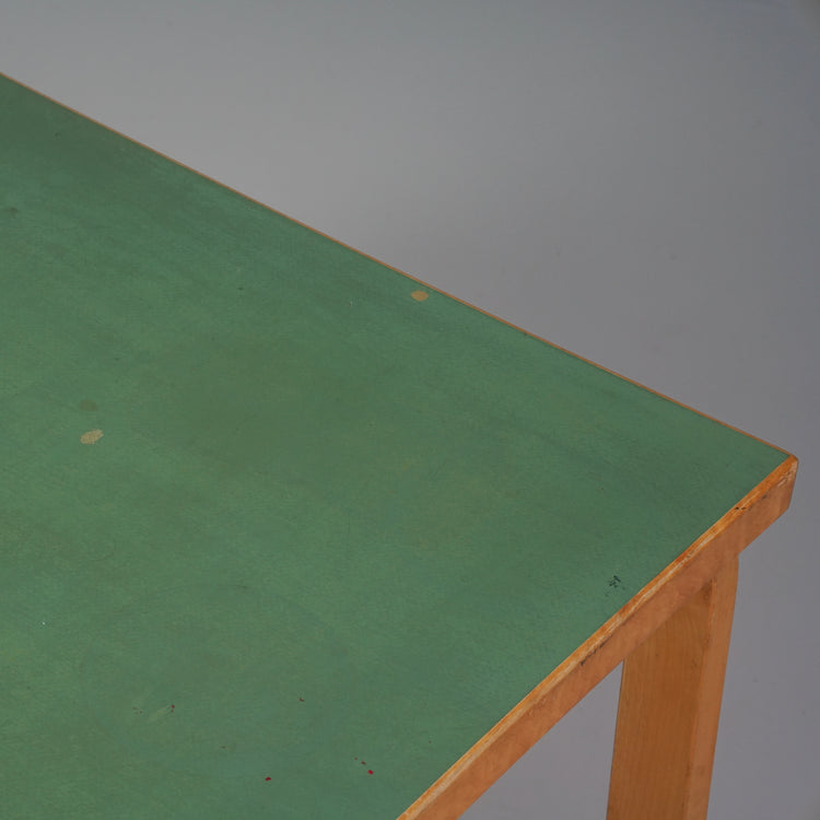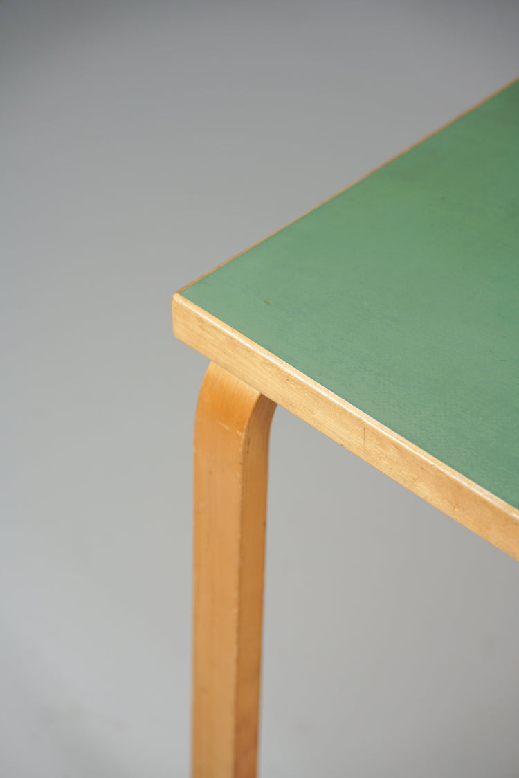 Harvinainen pöytä, design Alvar Aalto, valmistanut Oy Huonekalu- ja Rakennustyötehdas Ab, 40/50-luku. Harvinainen vihreä väri. Koivurunko, linoleum kansi. Hyvä kunto, ajan patinaa ja jälkeä.
