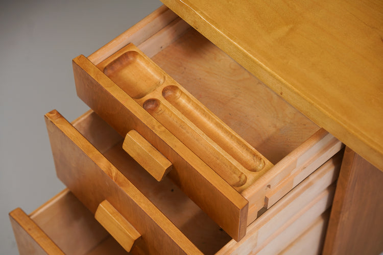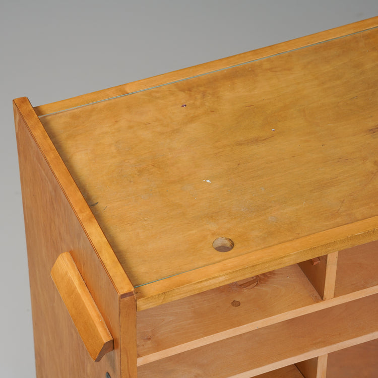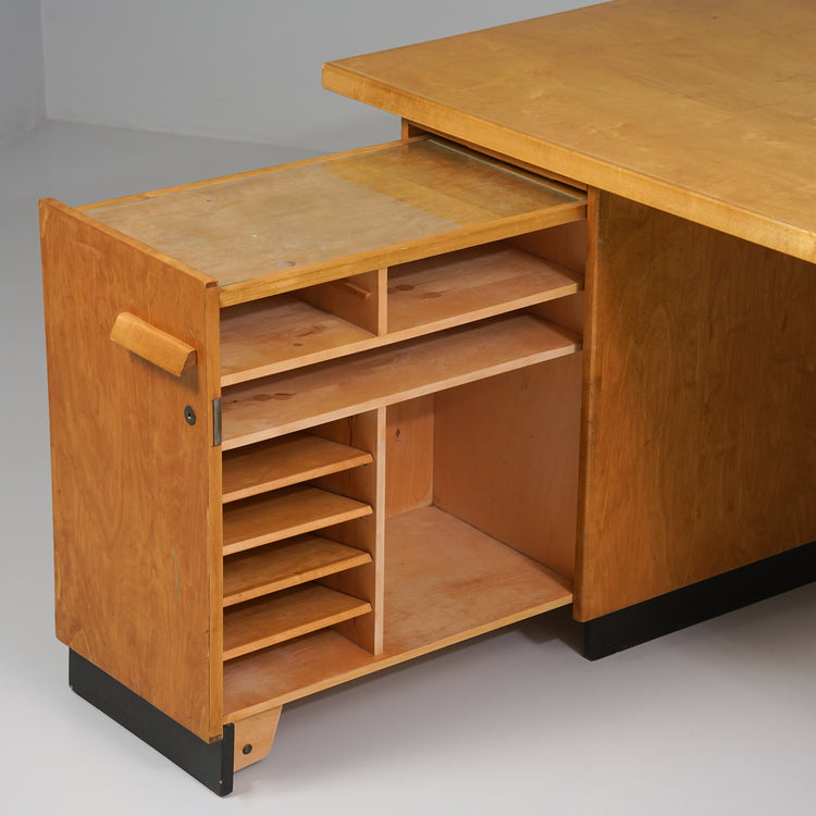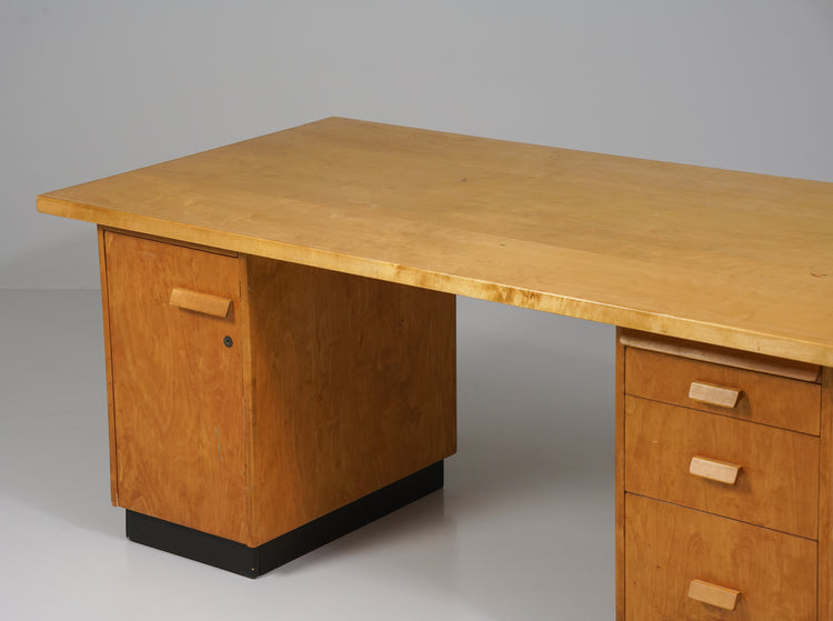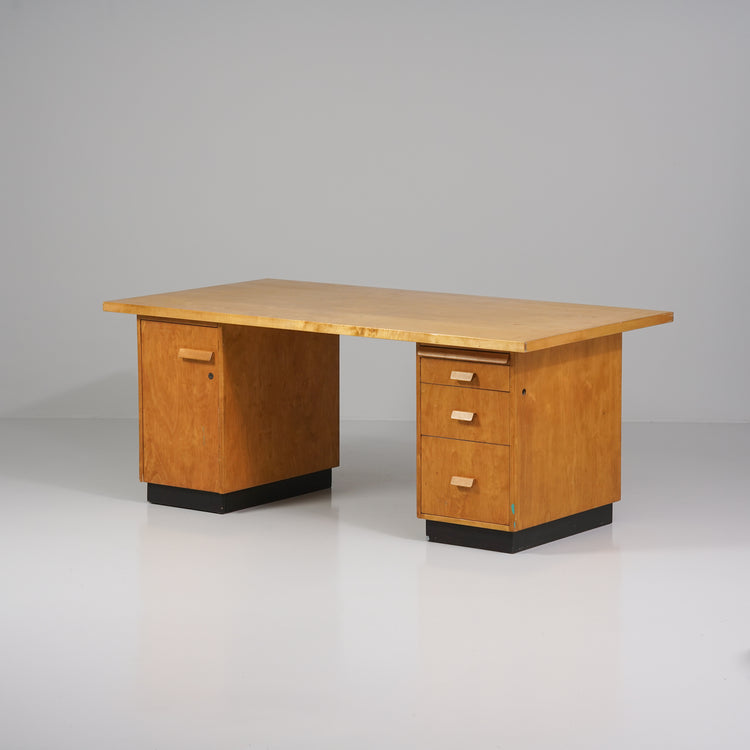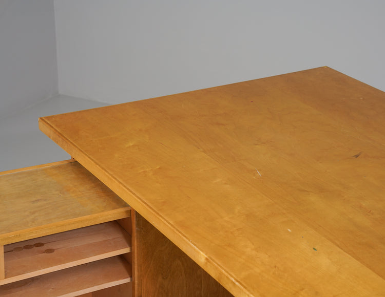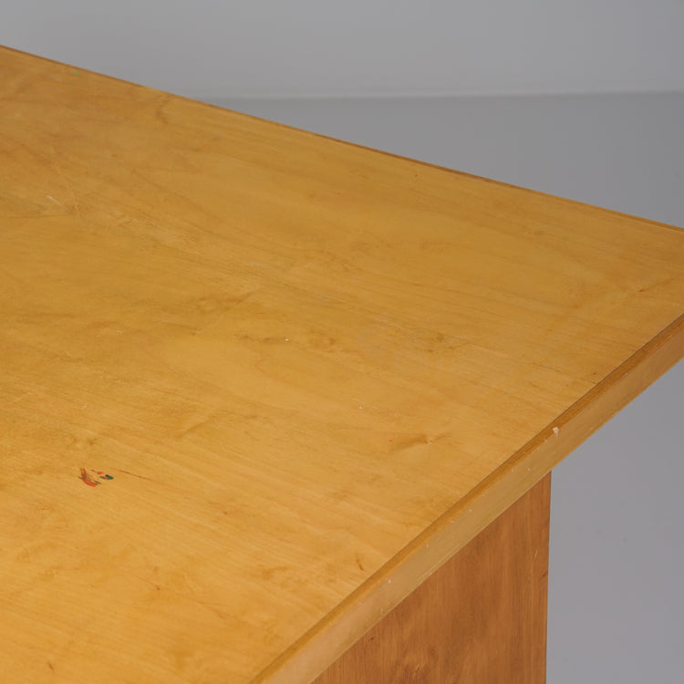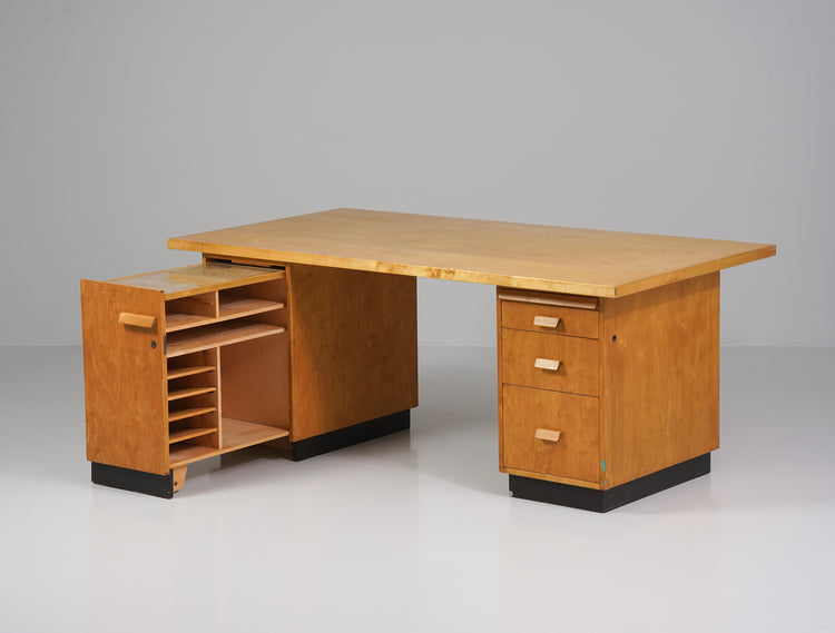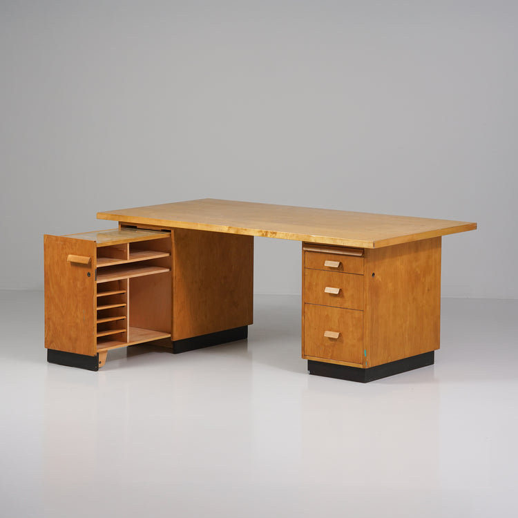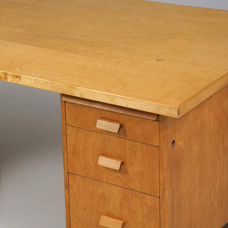 Työpöytä/"arkkitehti pöytä" 40/50-luku. Koivua, mustaksi maalattu runko. Vasemmanpuoleinen laatikko vedettävä. Sisällä säilytyslokeroita. Taso lasia. Oikealla kolme laatikkoa. Ylimmässä laatikossa kynäteline. Hyvä kunto, ajan patinaa ja pientä jälkeä.