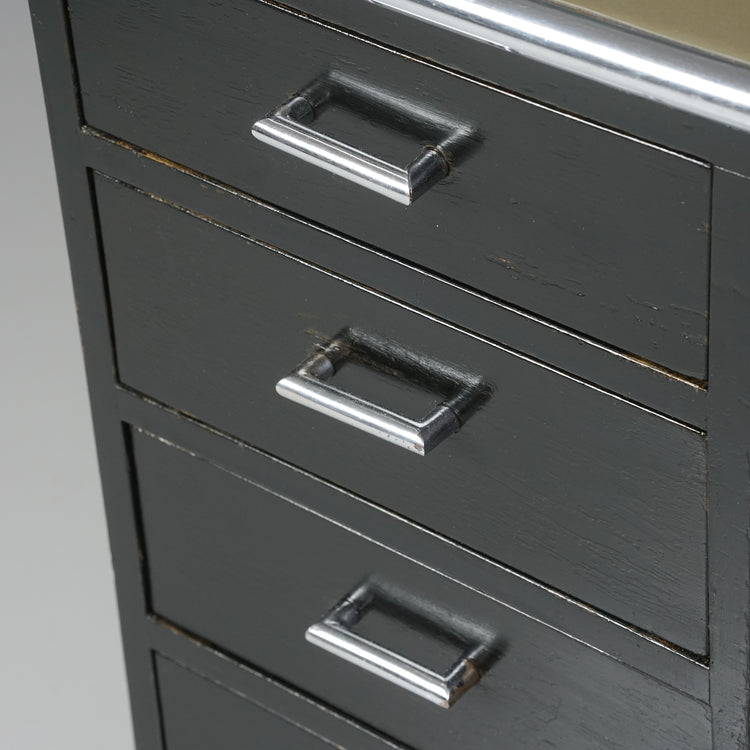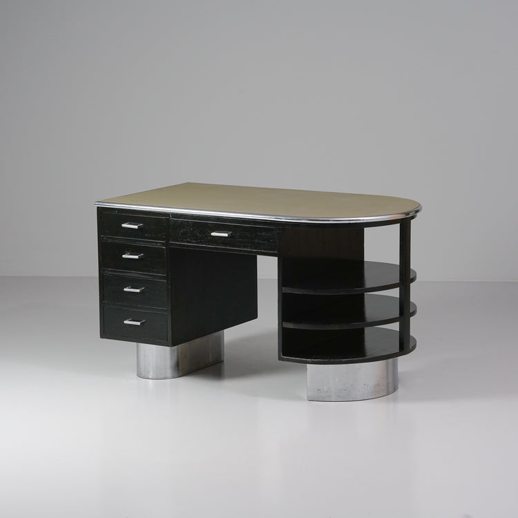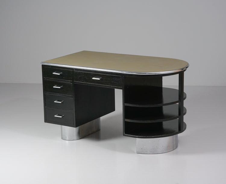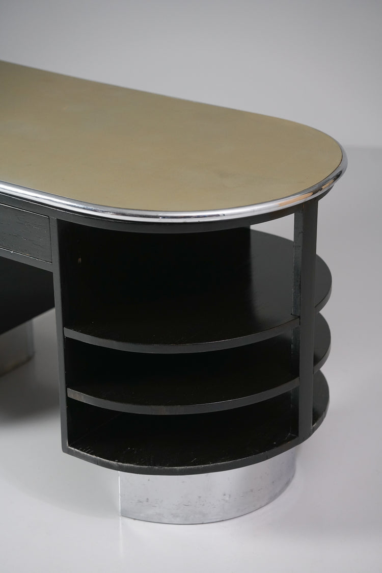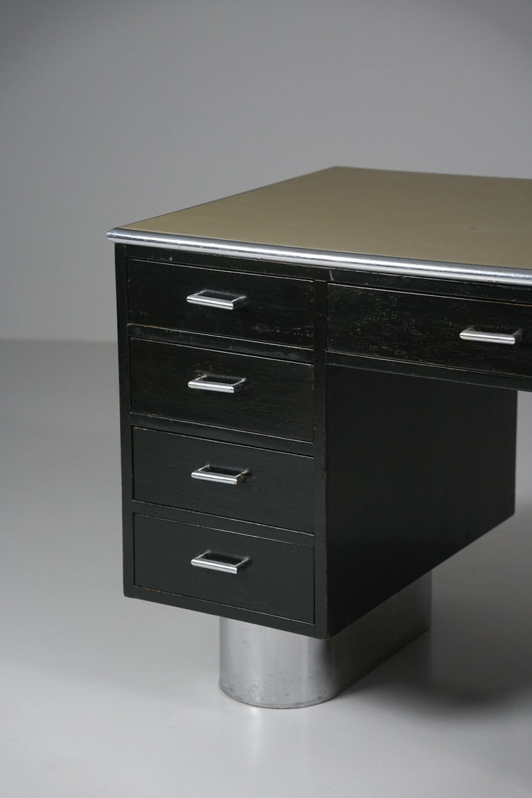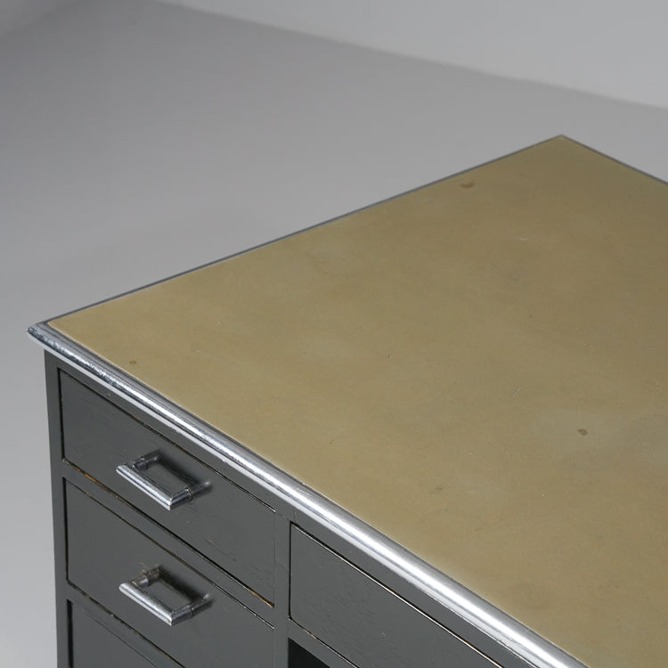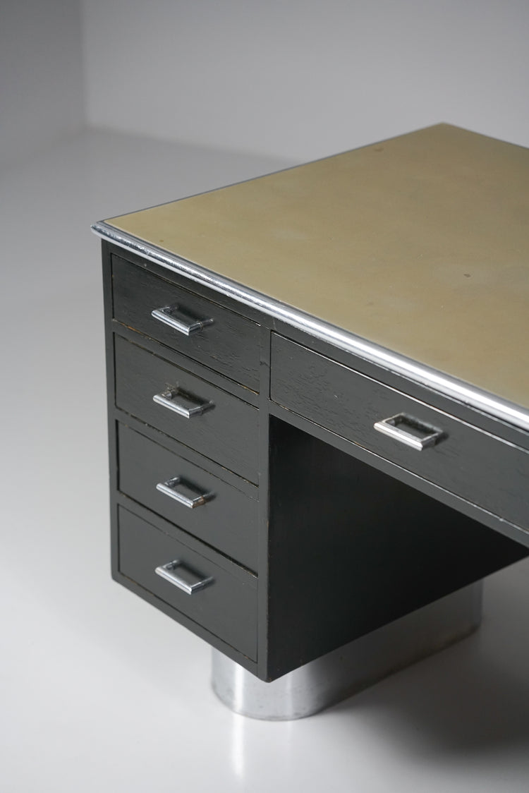 Harvinainen työpöytä, design Pauli Blomstedt, valmistanut J.Merivaara Oy, 30-luku. Vihreä linoleum pöytätaso, kromattua metallia, mustaksi maalattu puurunko. Hyvä kunto, ajan patinaa.