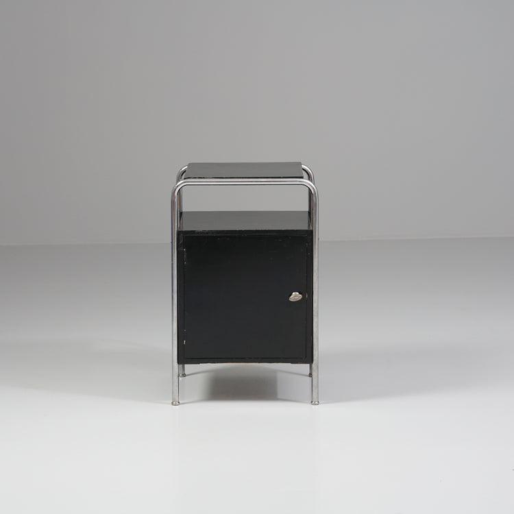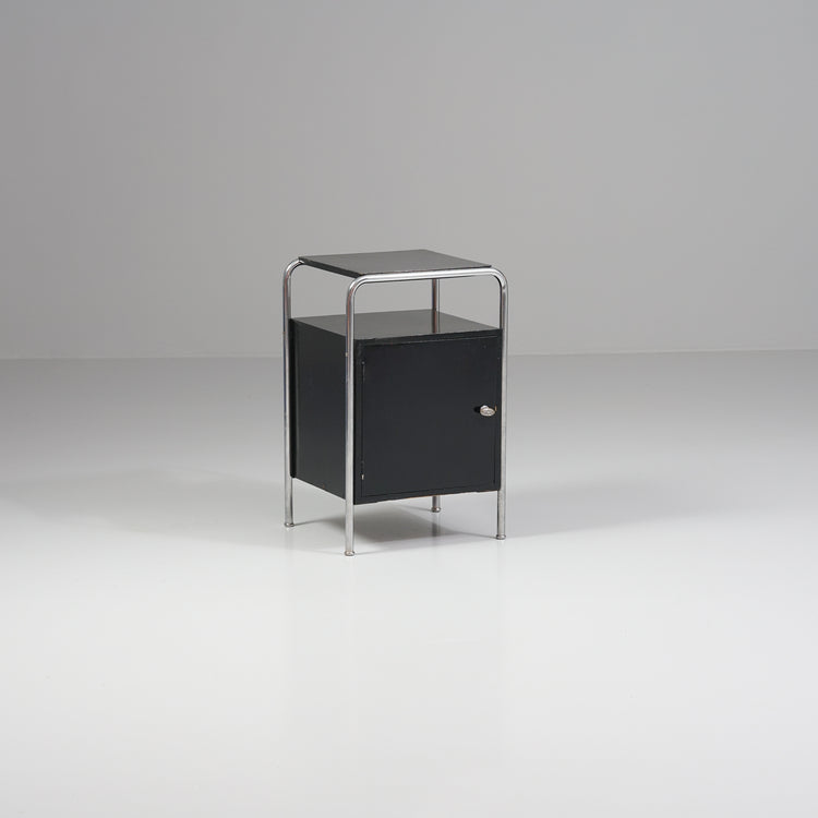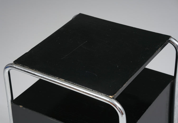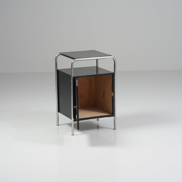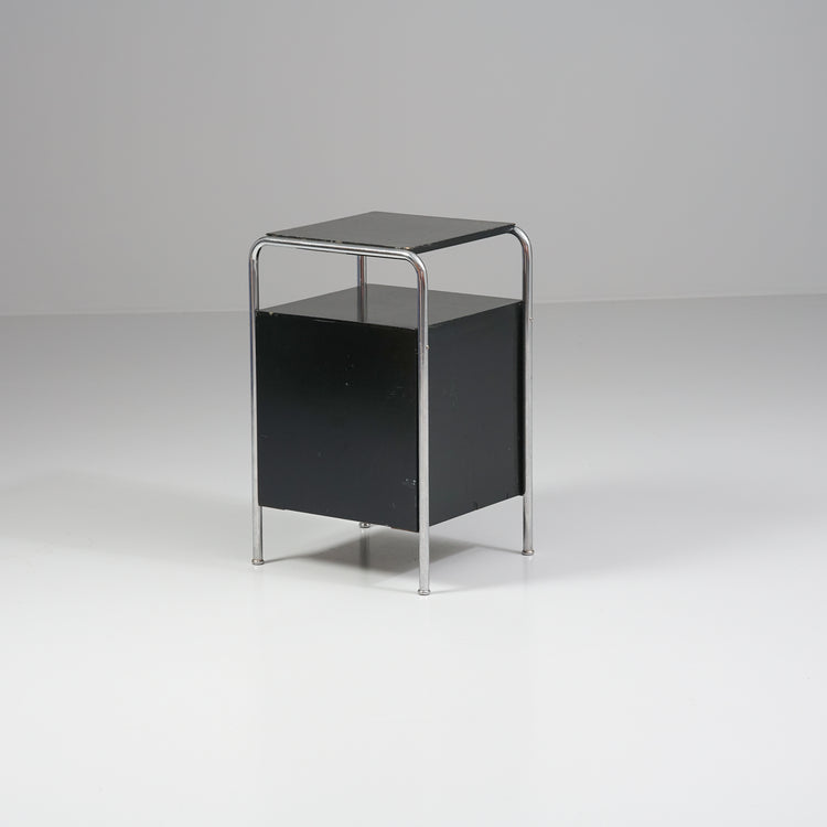 Yöpöytä, valmistanut J.Merivaara oy. Mustaksi maalatut puuosat, kromattu metallirunko. Hyvä kunto, runsasta ajan patinaa ja pientä jälkeä.