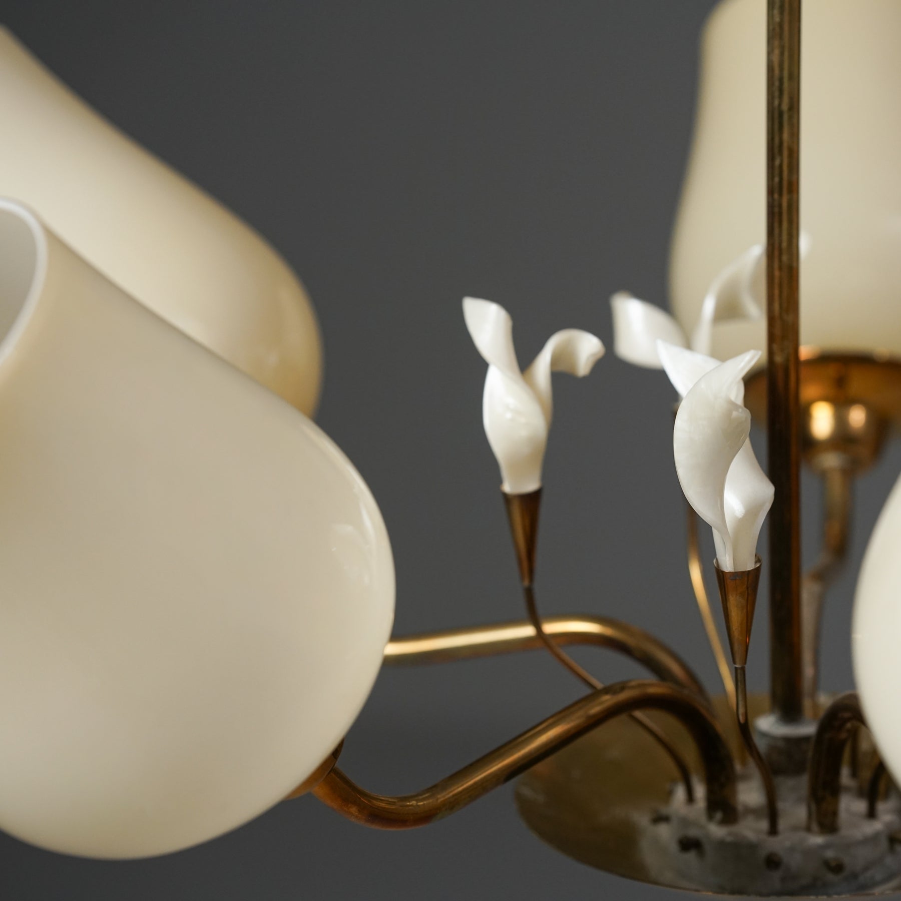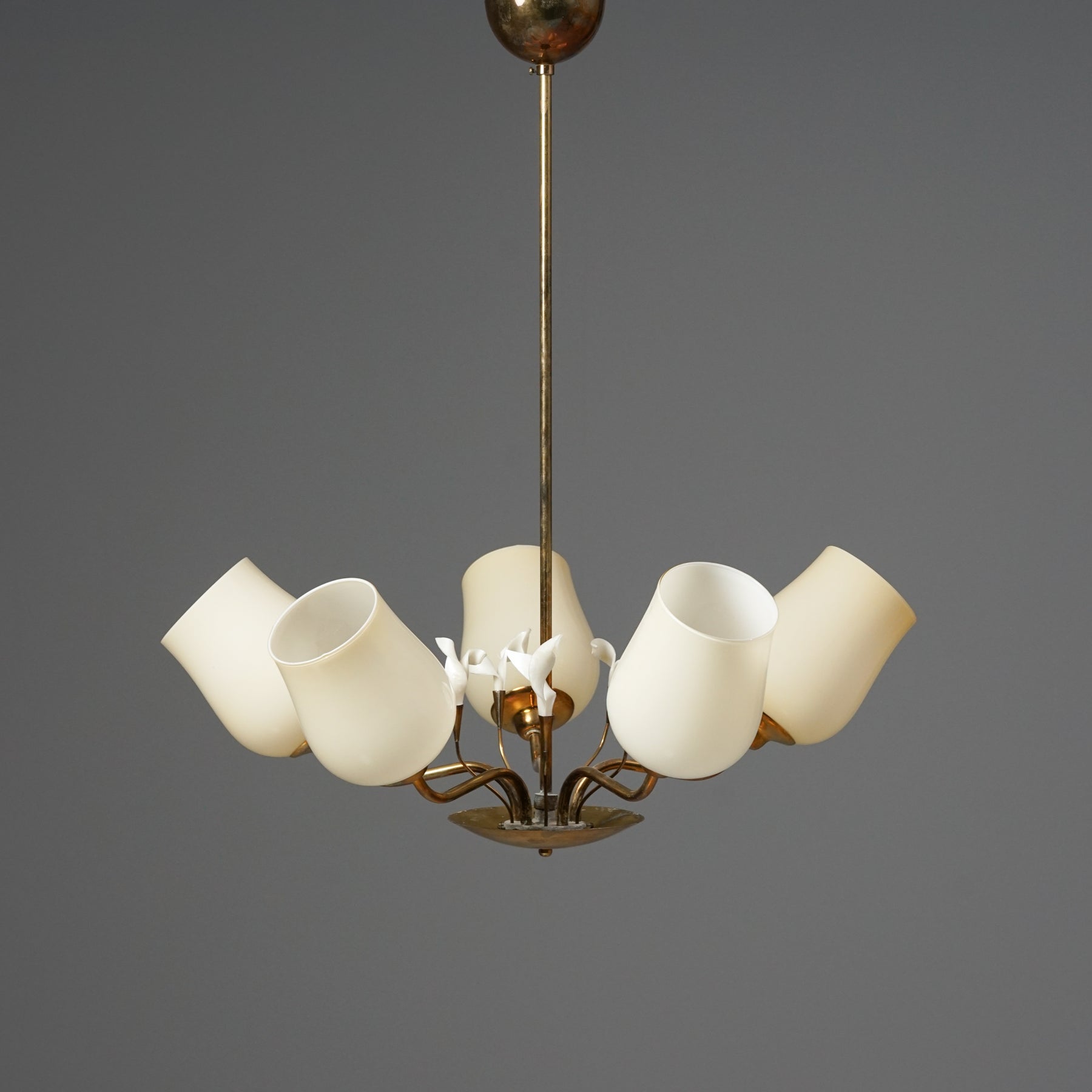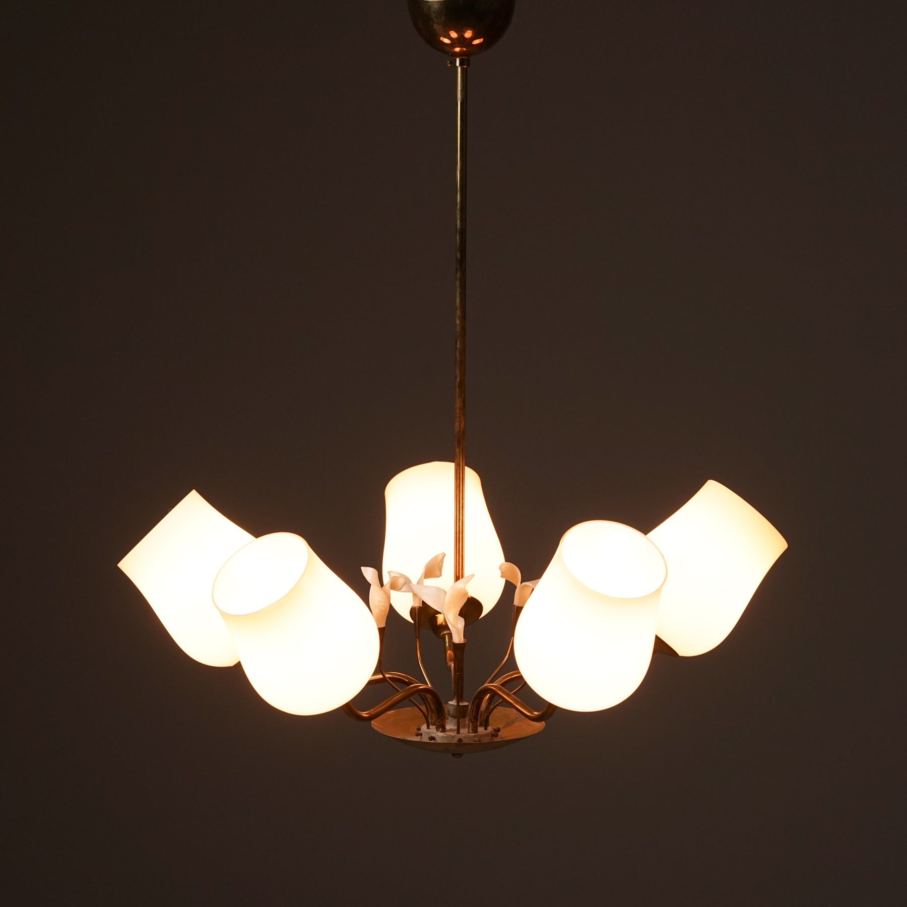 Kattokruunu, valmistanut KORUMO Oy, Suomi, 50-luku. Runko messinkiä, muovi kukka koristeet, opaali lasikuvut. Leimattu. Hyvä kunto, pientä ajan patinaa.
