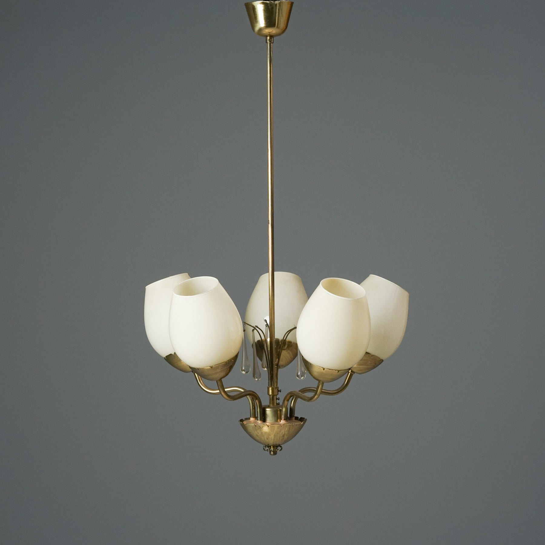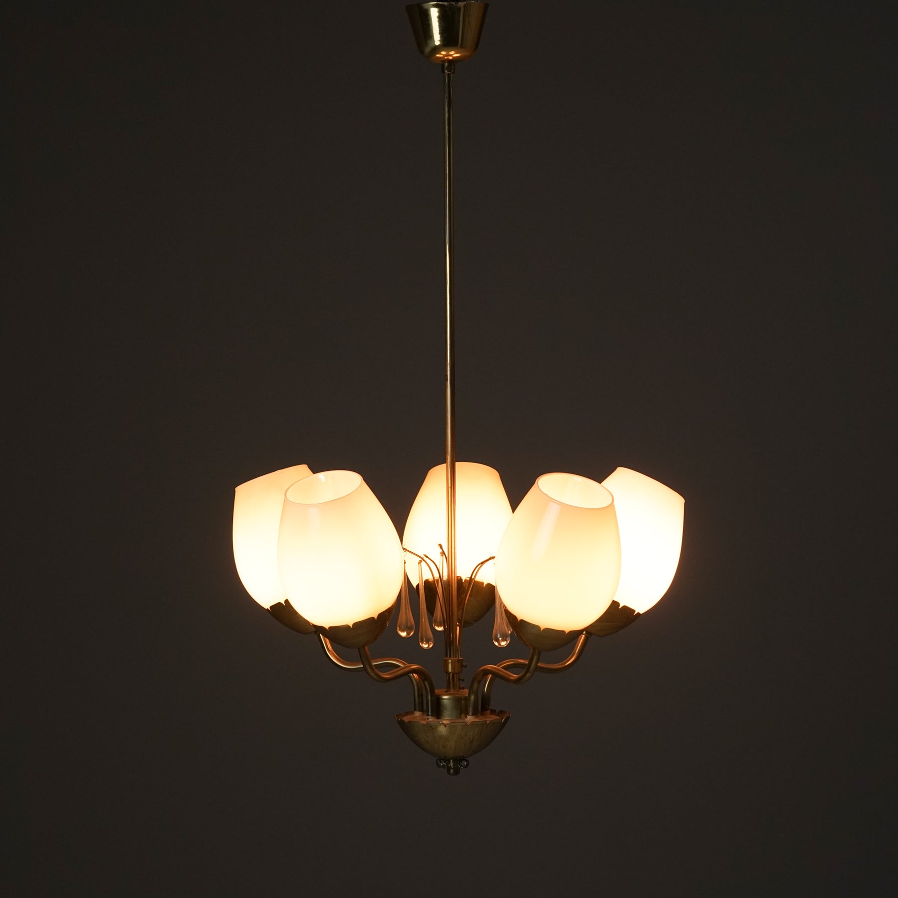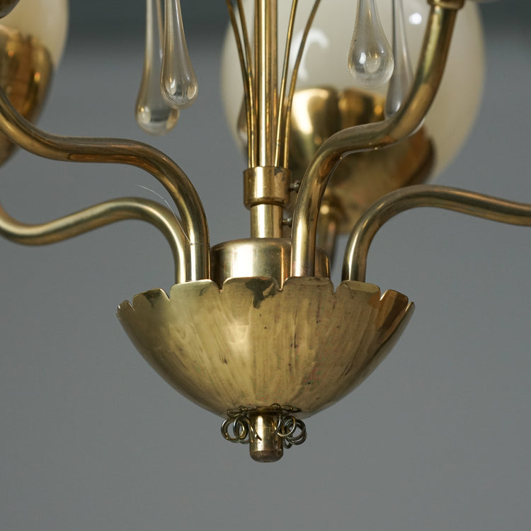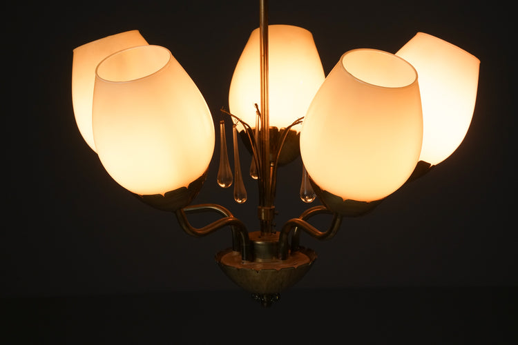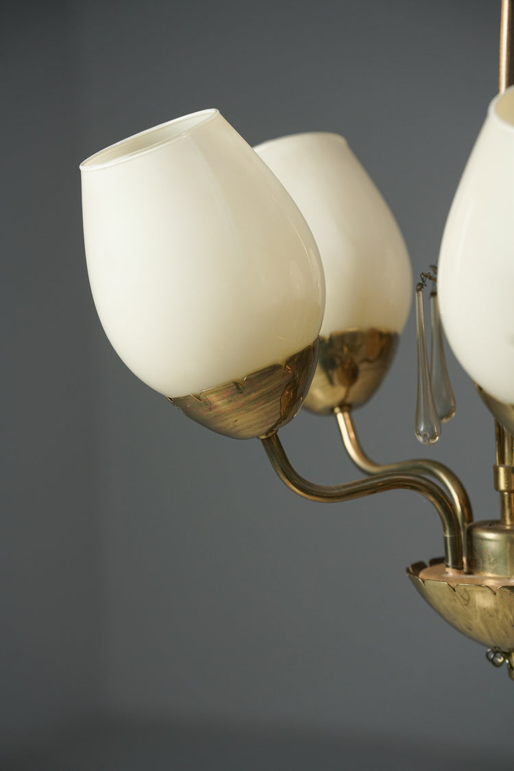Kattovalaisin, valmistanut Idman, 40/50-luku. Runko messinkiä, opaali lasikuvut, kristalli yksityiskohdat. Leimattu. Hyvä kunto, ajan patinaa.
