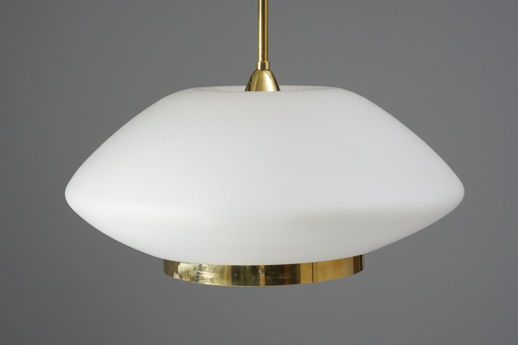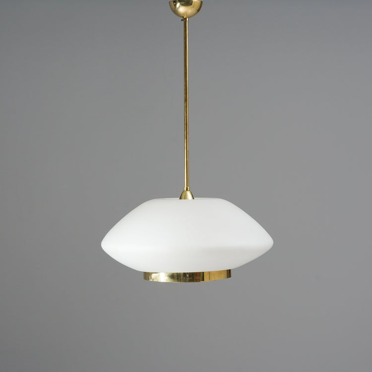 Kattovalaisin malli 61-338, design Lisa Johansson-Pape, valmistanut Orno, 50/60-luku. Messinkiä ja opaalilasia. Leimattu. Hyvä kunto, pientä ajan patinaa.