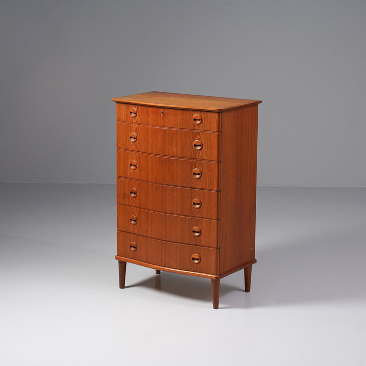 Laadukas laatikosto, valmistettu Tanskassa, 60-luku. Tiikkiä. Hyvä kunto, pientä ajan patinaa.