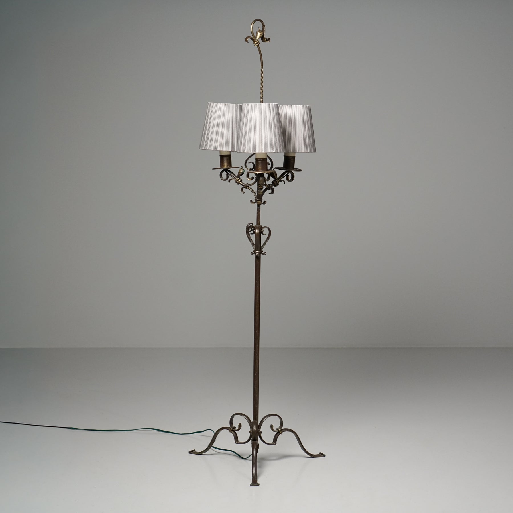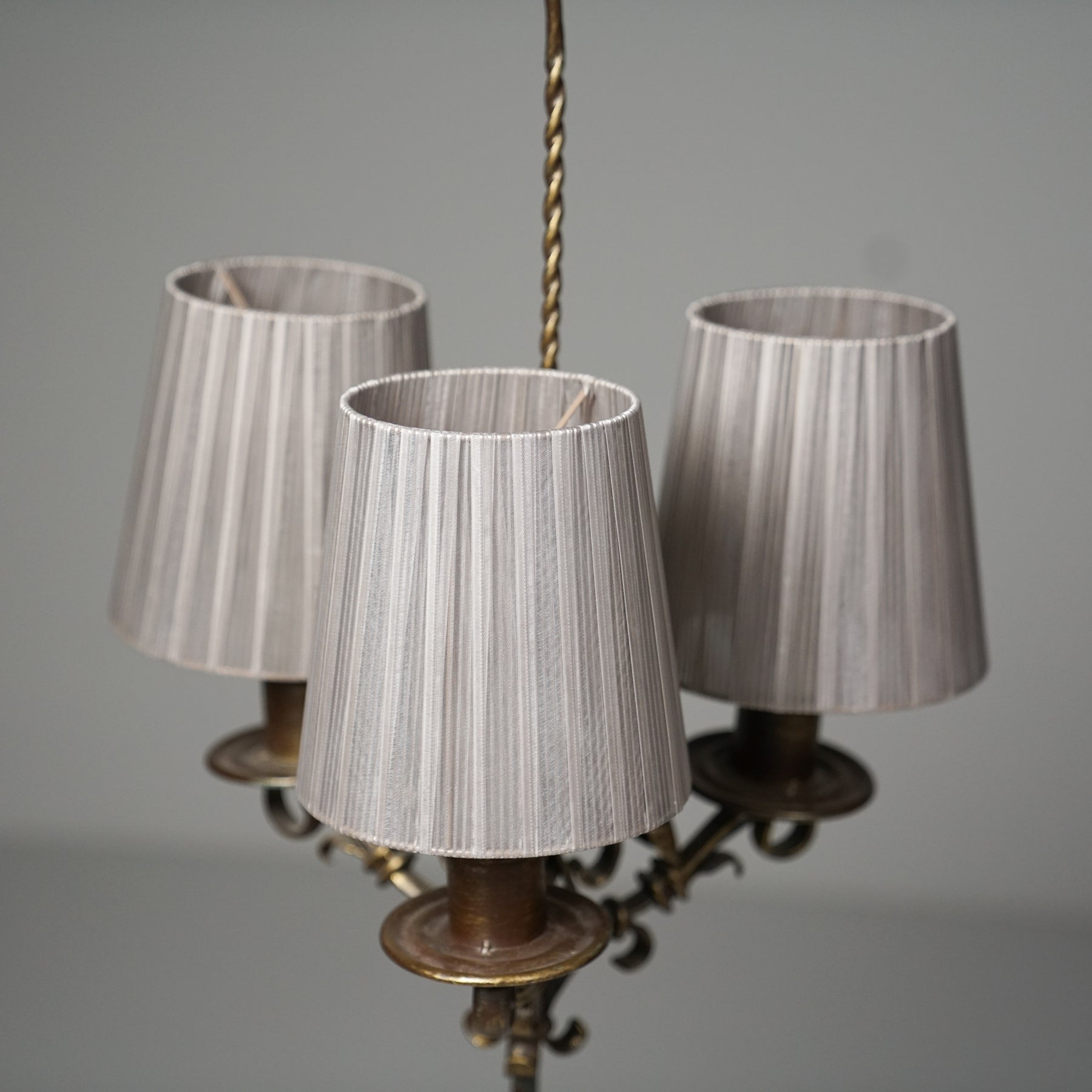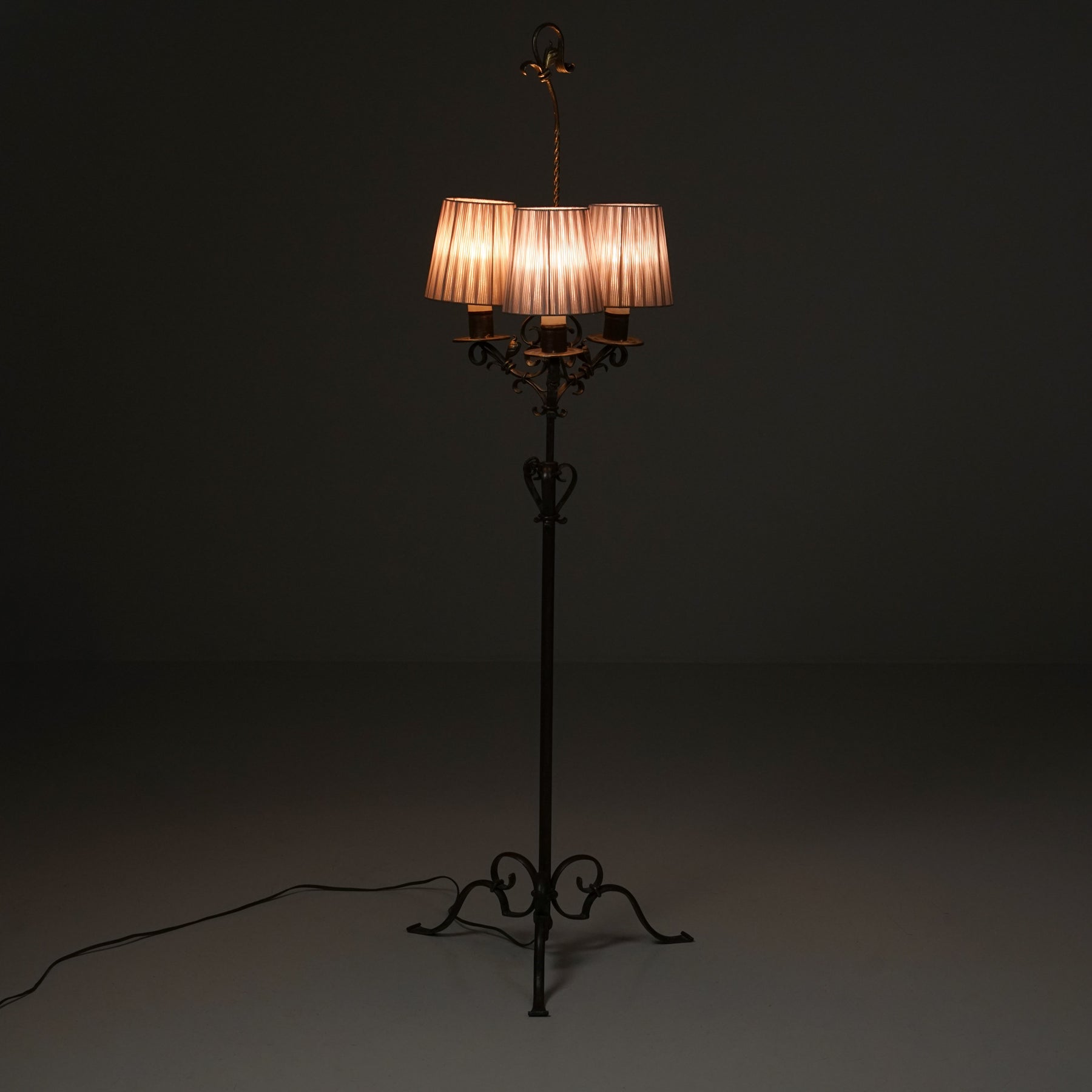 Malli 812 lattiavalaisin, valmistanut Taidetakomo Hakkarainen, 1900-luvun alku. Takorautaa, kangas varjostimet. Hyvä kunto, pientä ajan patinaa.