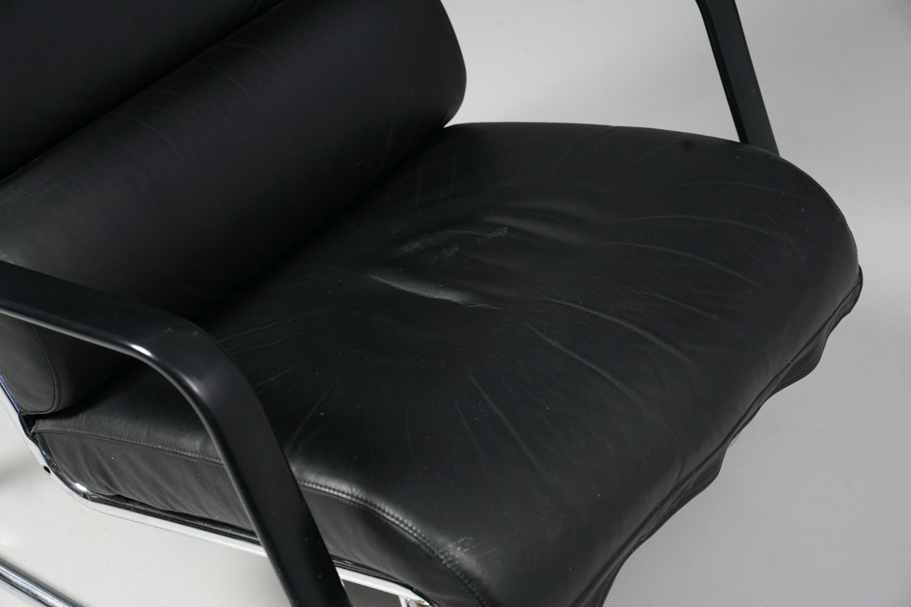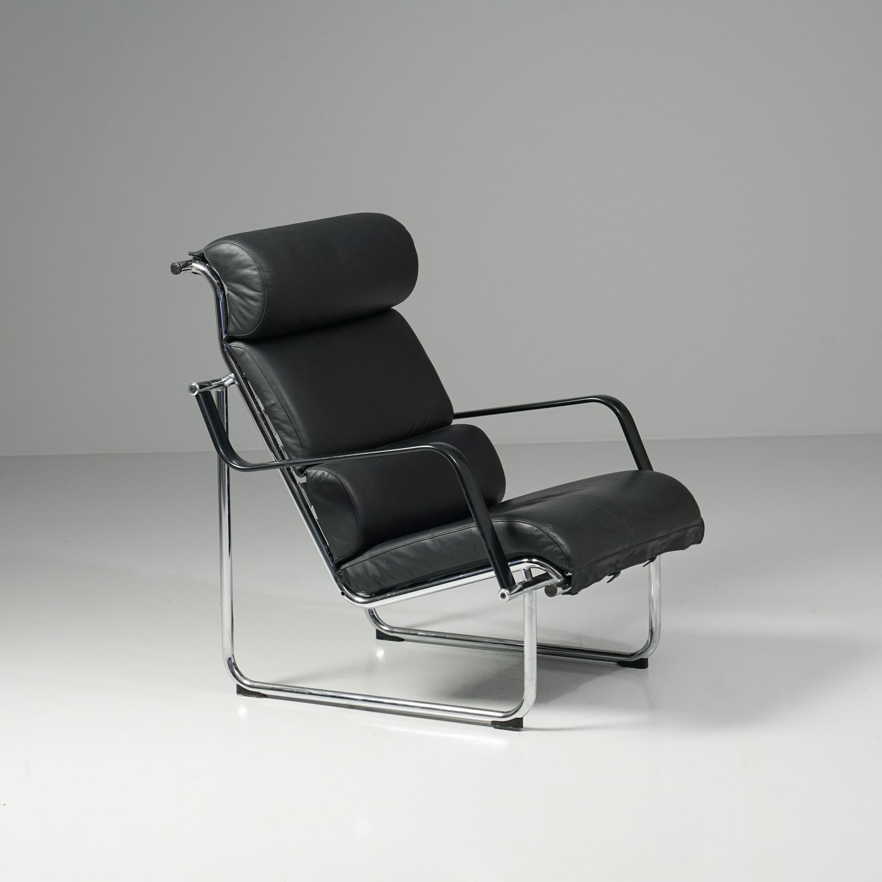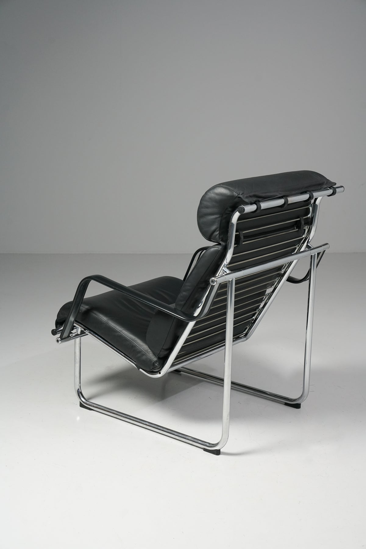 Malli "Remmi" nojatuoli, design Yrjö Kukkapuro, 1900-luvun loppupuoli. Kromirunko, nahkaverhoilu. Hyvä kunto, pientä ajan patinaa.