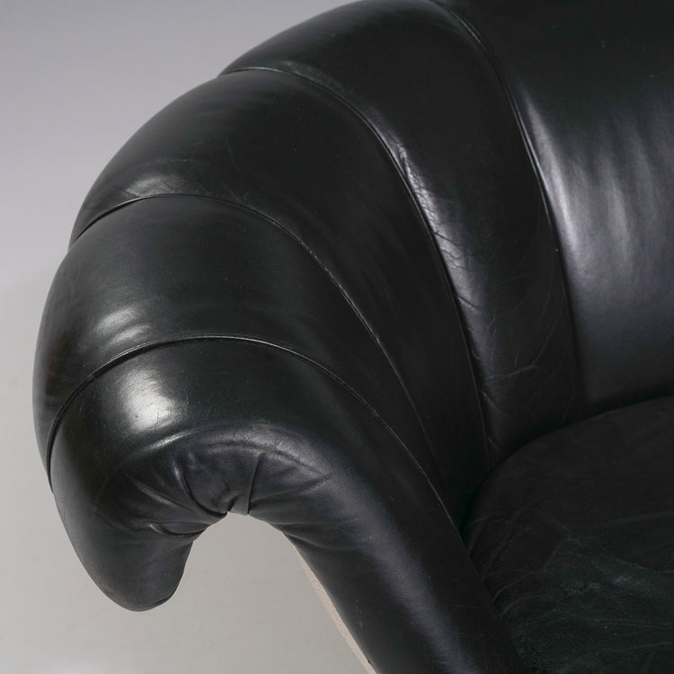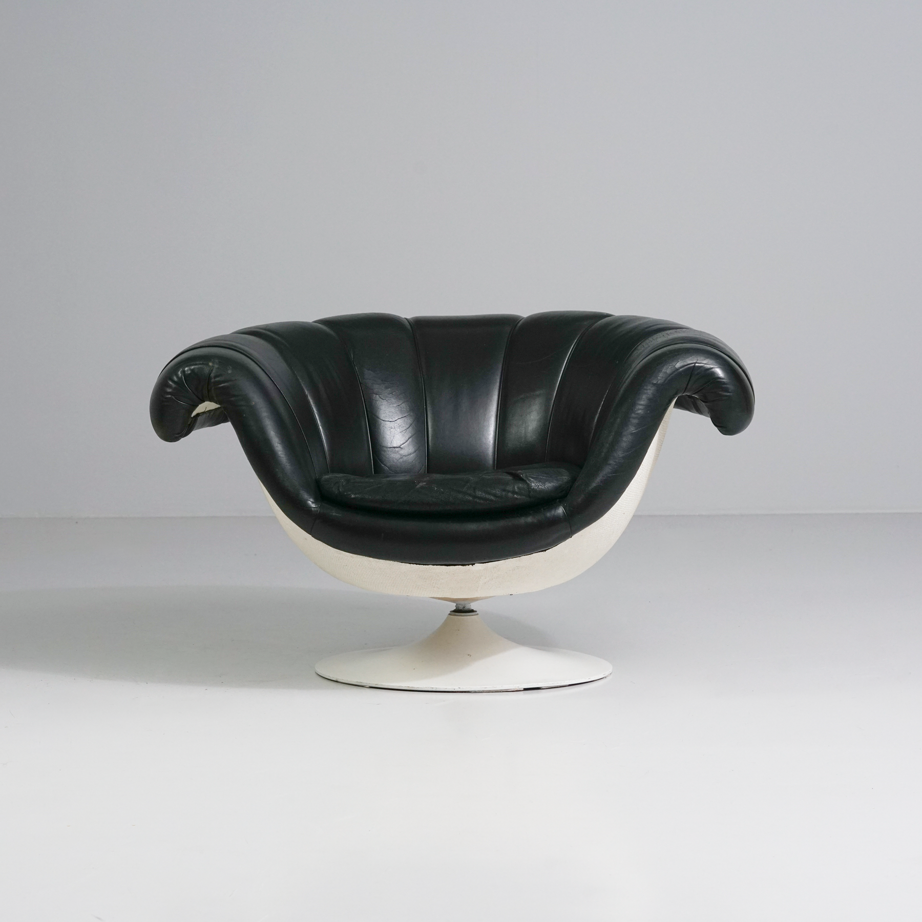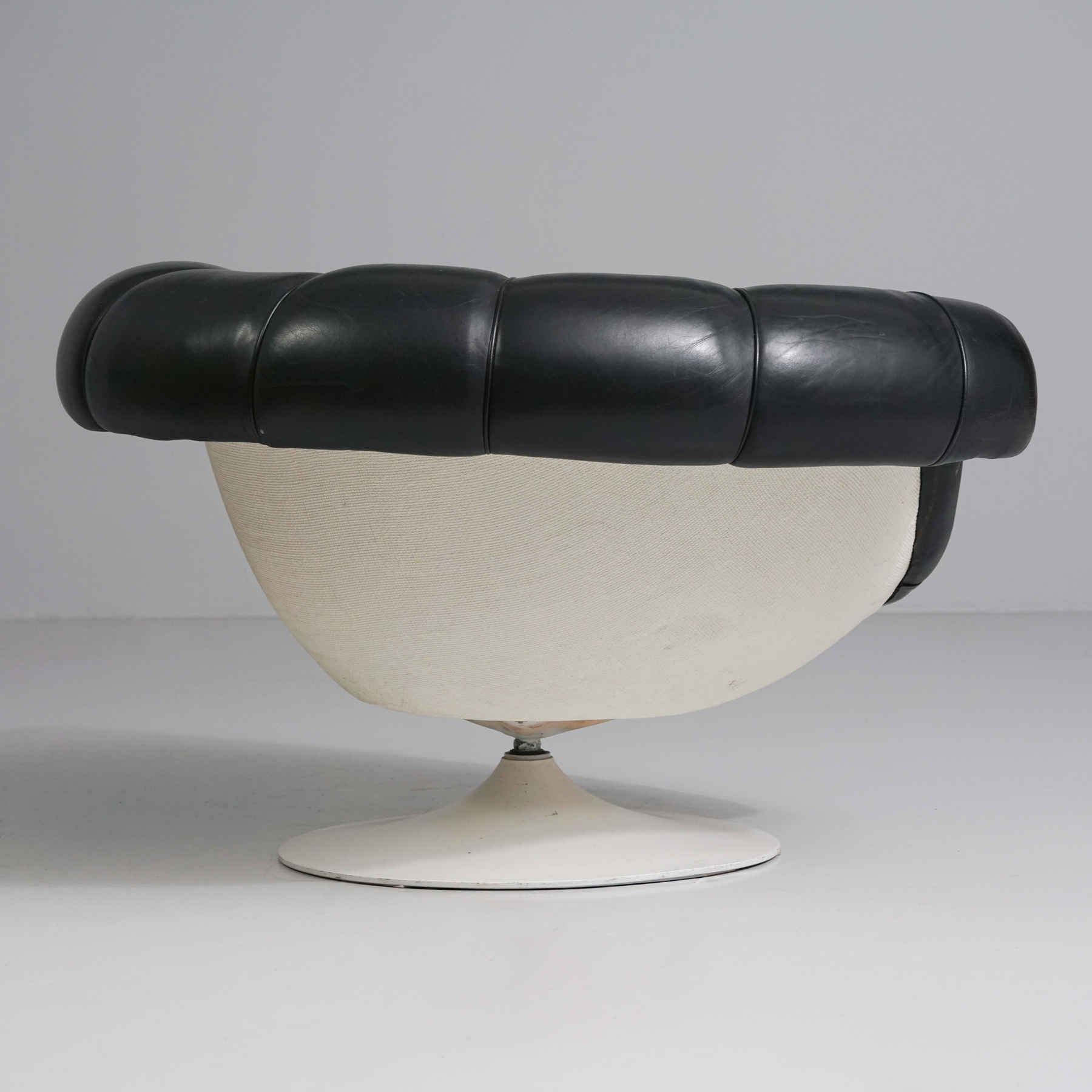 Pyörivä nojatuoli malli "Sorry", valmistanut Overman AB, Ruotsi, 60-luku. Runko maalattua metallia ja muovia. Nahkaverhoilu. Hyvä kunto, ajan patinaa ja pientä jälkeä.