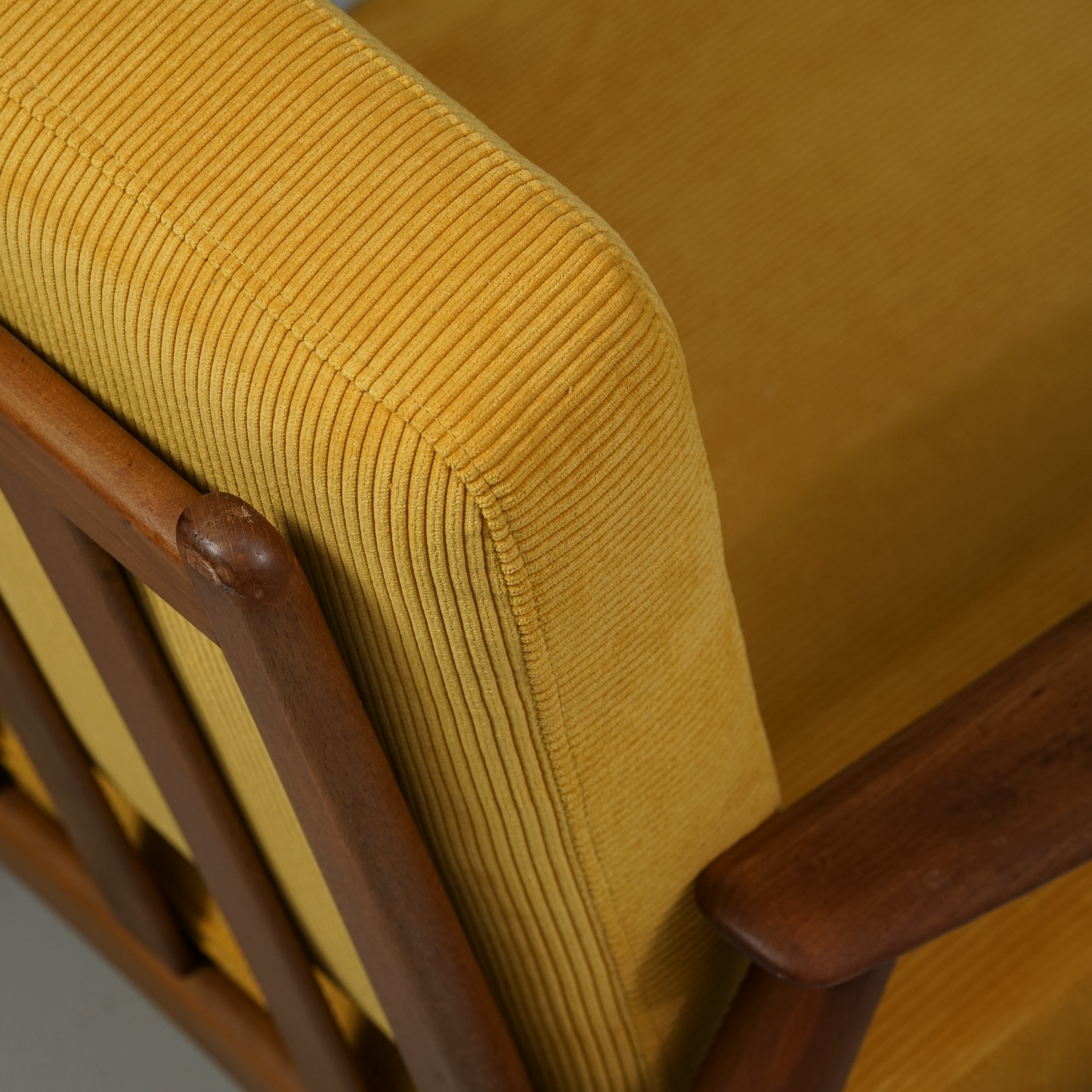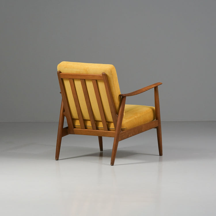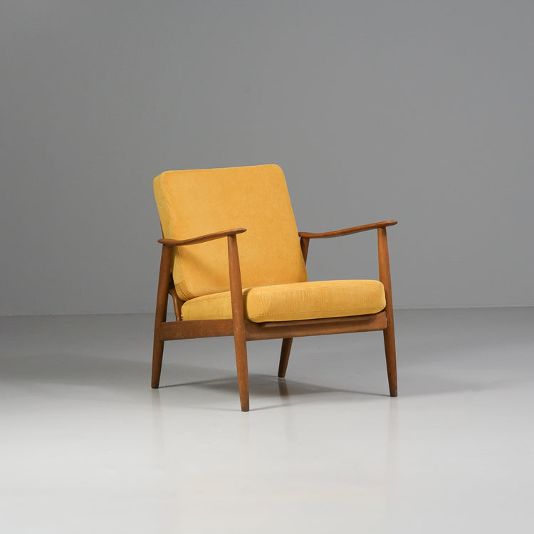 Nojatuoli, valmistettu Tanskassa, 60-luku. Uudelleen verhoiltu laadukkaalla Lauritzonin malli Sorrento -kankaalla. Hyvä kunto, ajan patinaa ja pientä jälkeä.