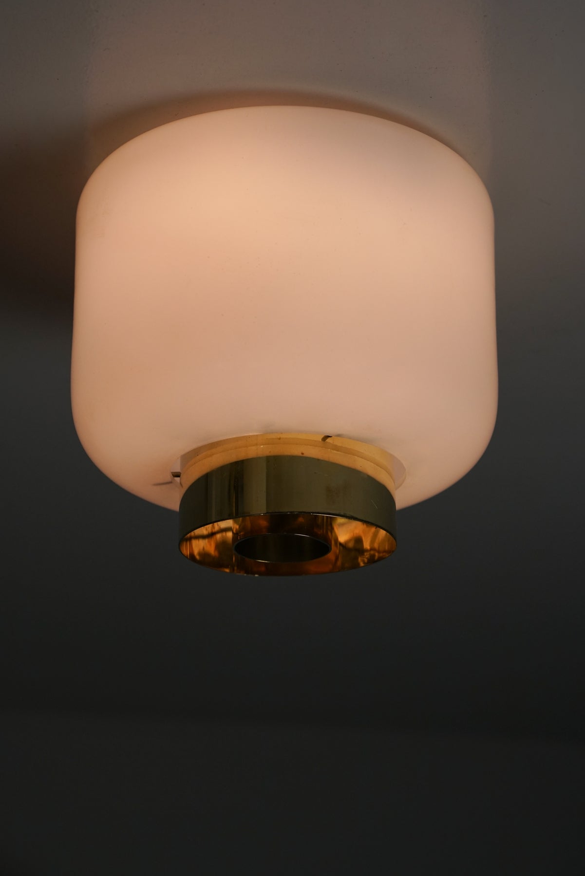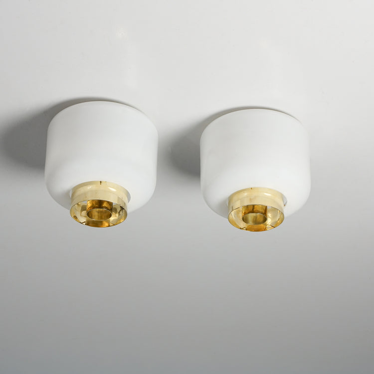 Plafondit (2 kpl myydään yhdessä), design Paavo Tynell, valmistanut Idman, 50-luku. Messinkiä ja maitolasia. Leimattu. Hyvä kunto, pientä ajan patinaa. Plafondit myydään yhdessä. Ilmoitettu hinta on settihinta.